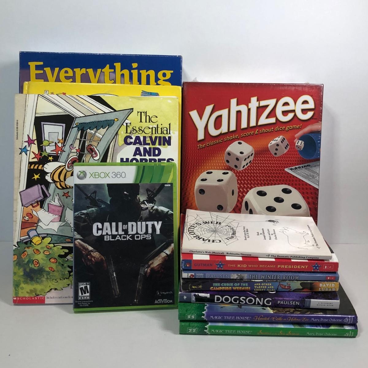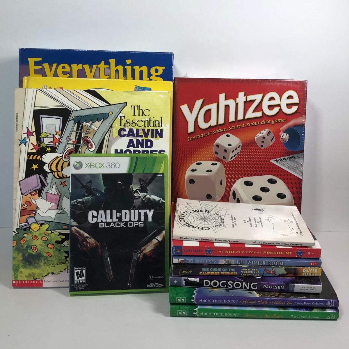 LOT 17M: Sealed Yahtzee, The Essential Calvin & Hobbes, Gary Paulsen Books, Call of Duty Black Ops Video Game for XBOX360, Charlotte's Web & More