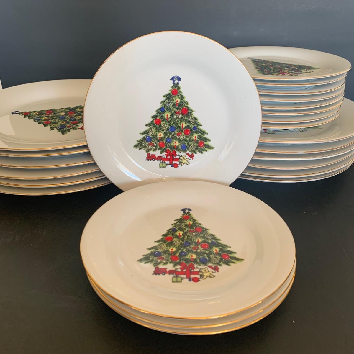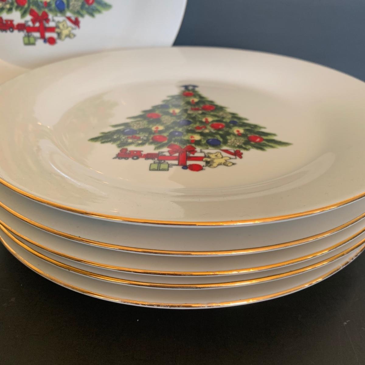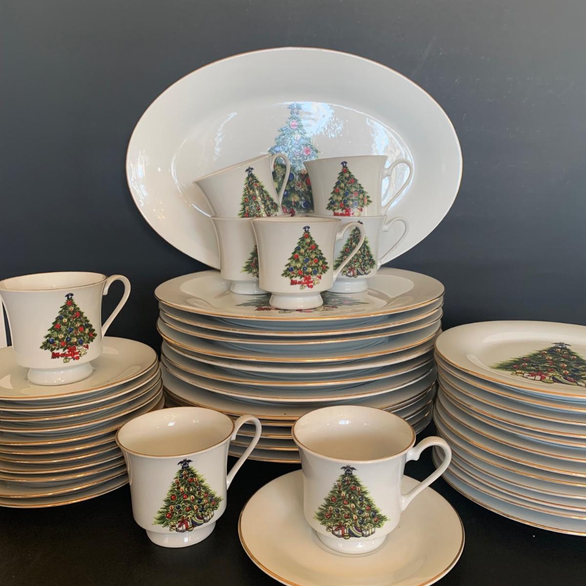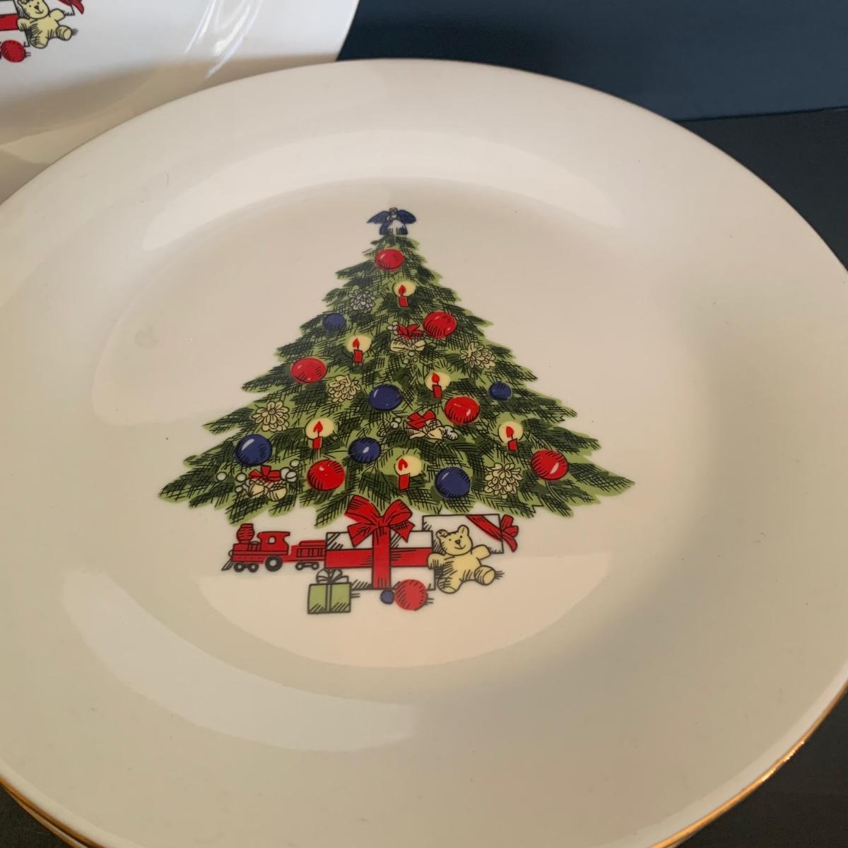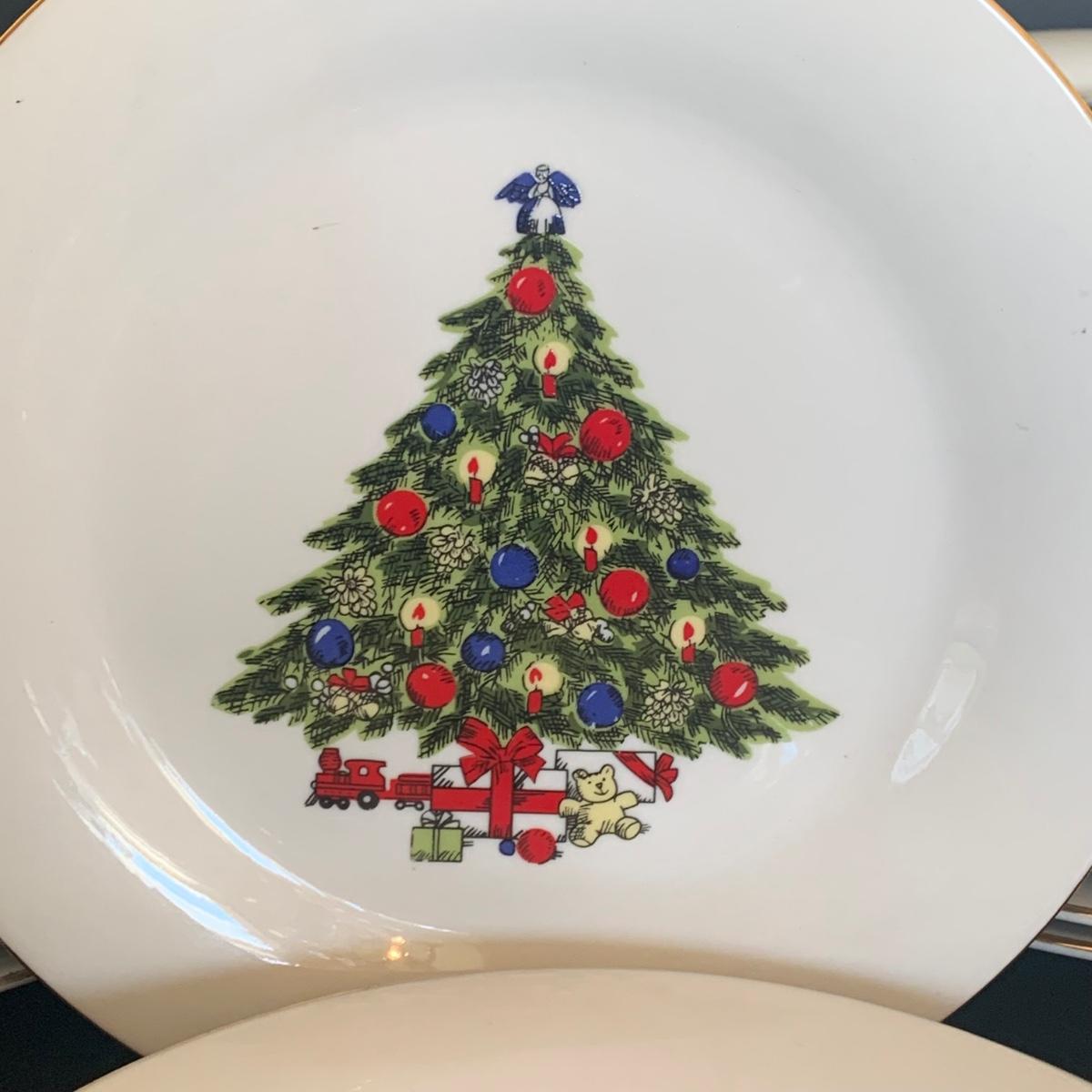 Lots is a mixed collection of holiday China very close in pattern, both are holiday trees w/gold rim however one has a toy top and the other does not.
