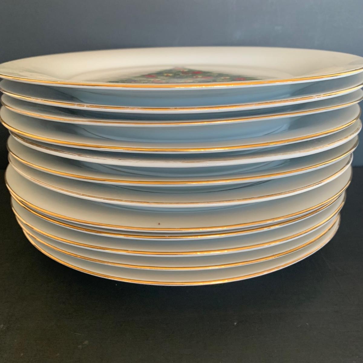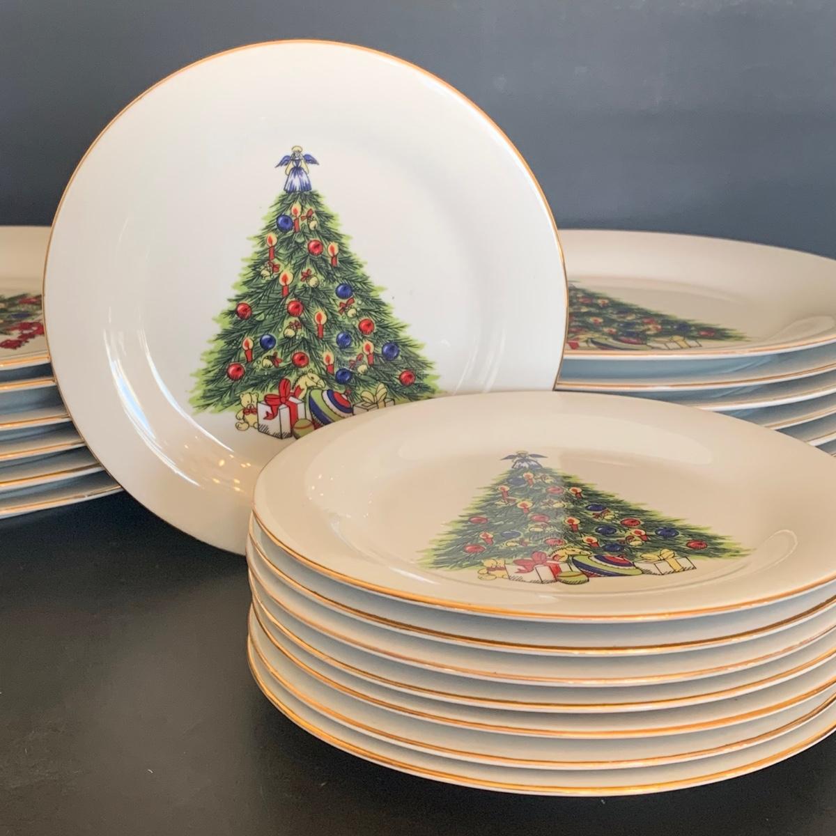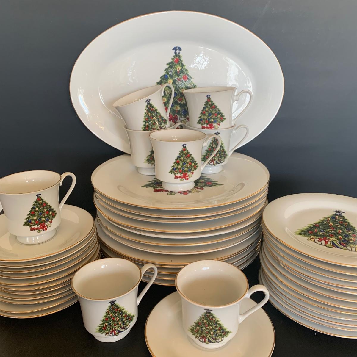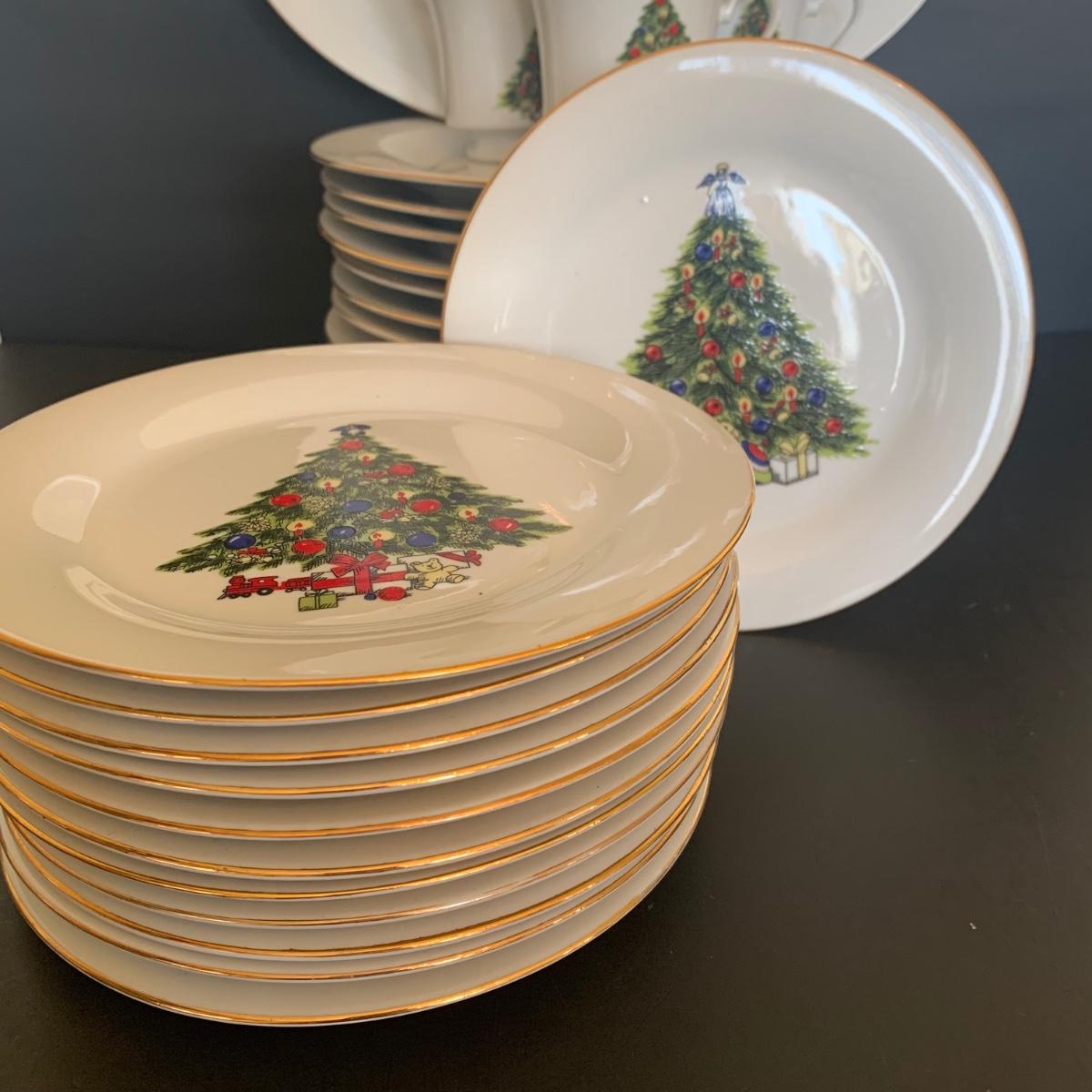 Lots is a mixed collection of holiday China very close in pattern, both are holiday trees w/gold rim however one has a toy top and the other does not.
