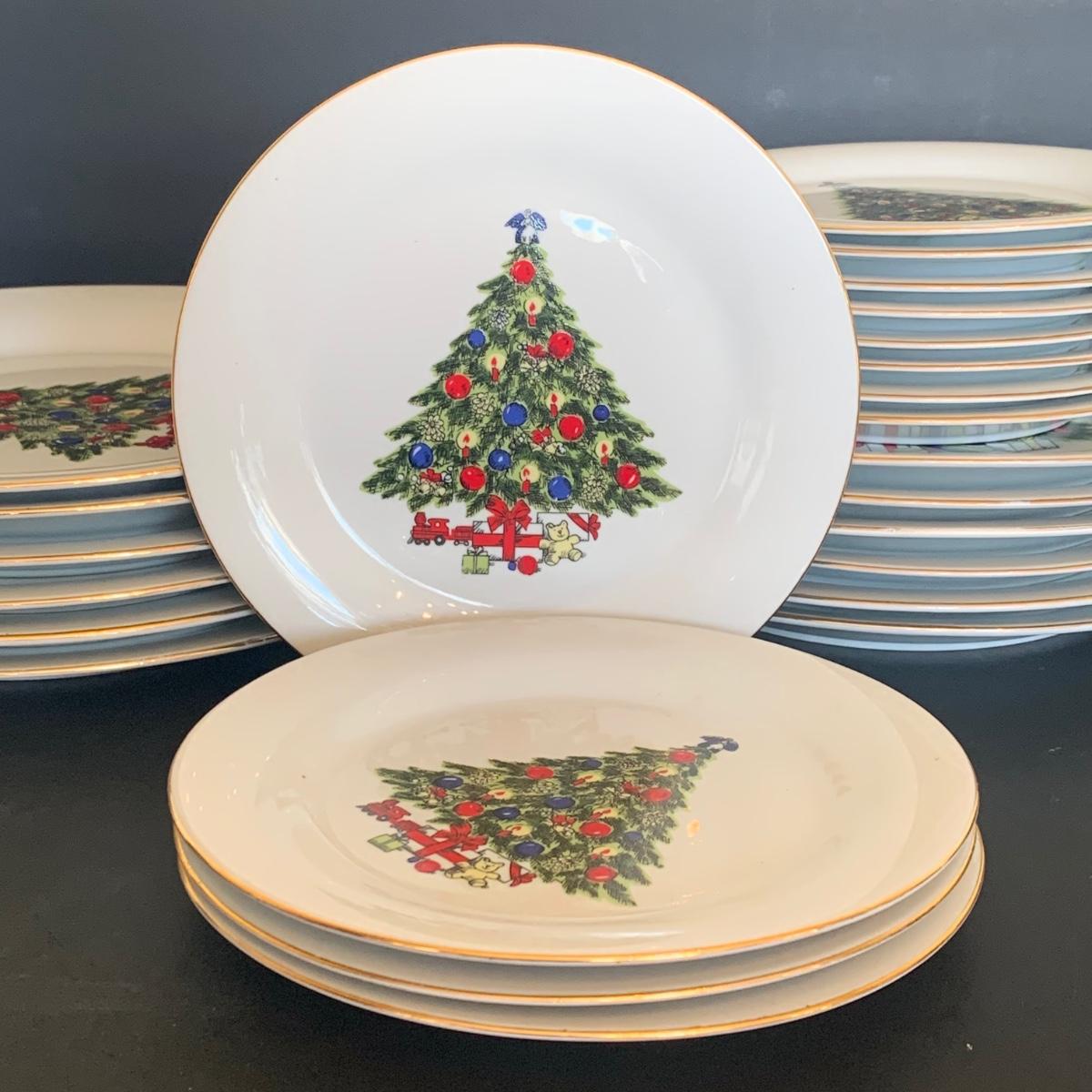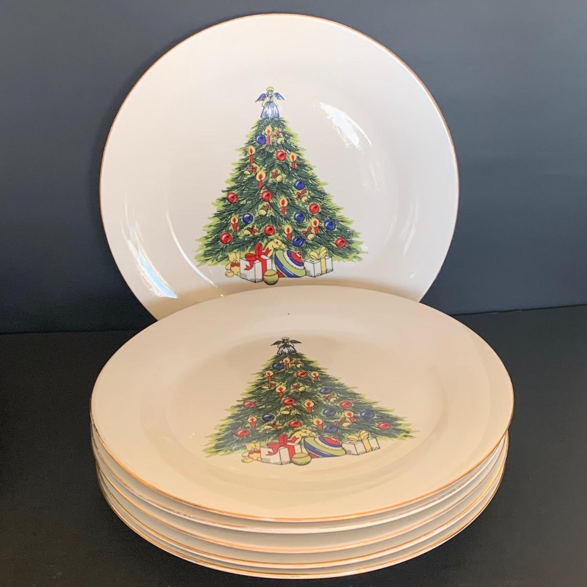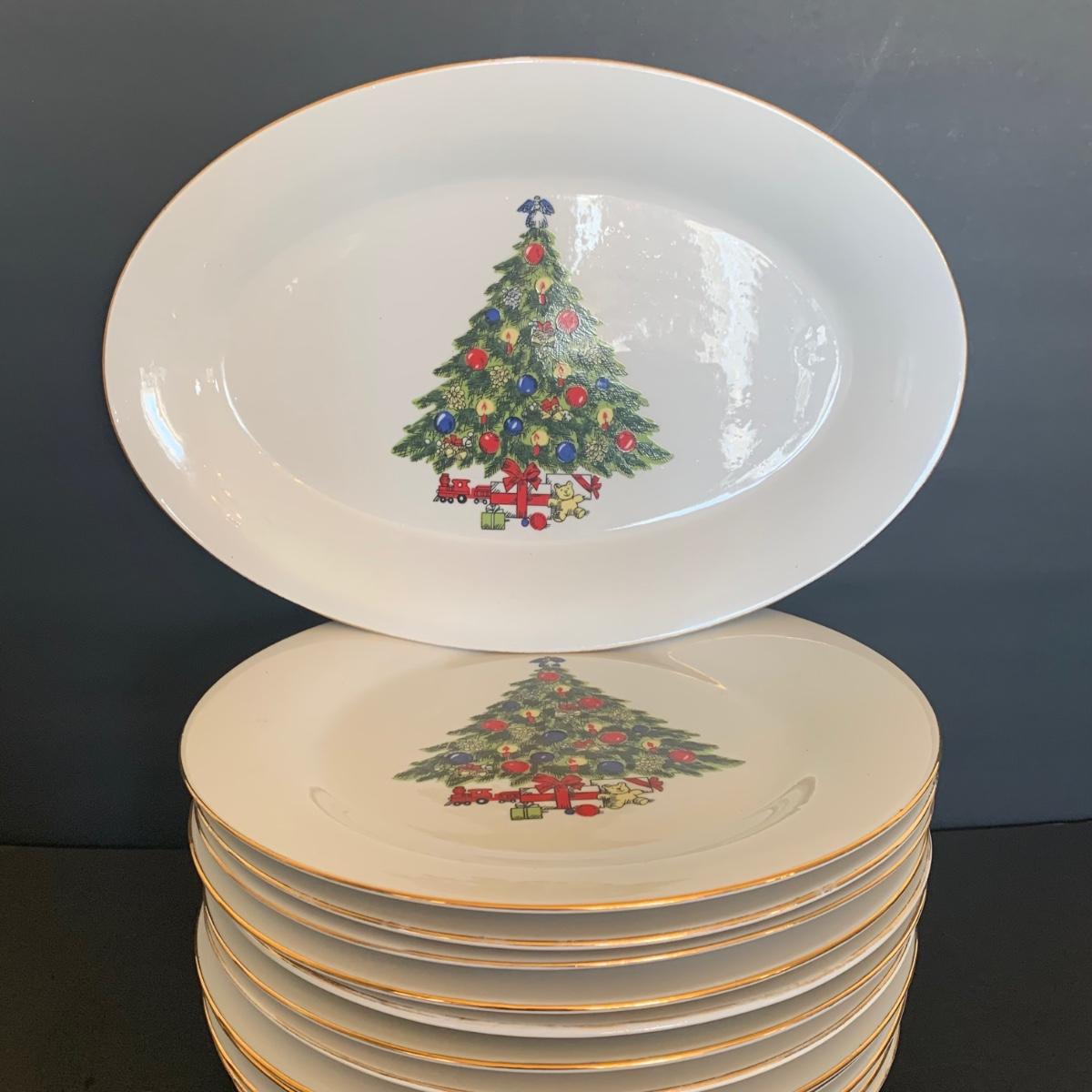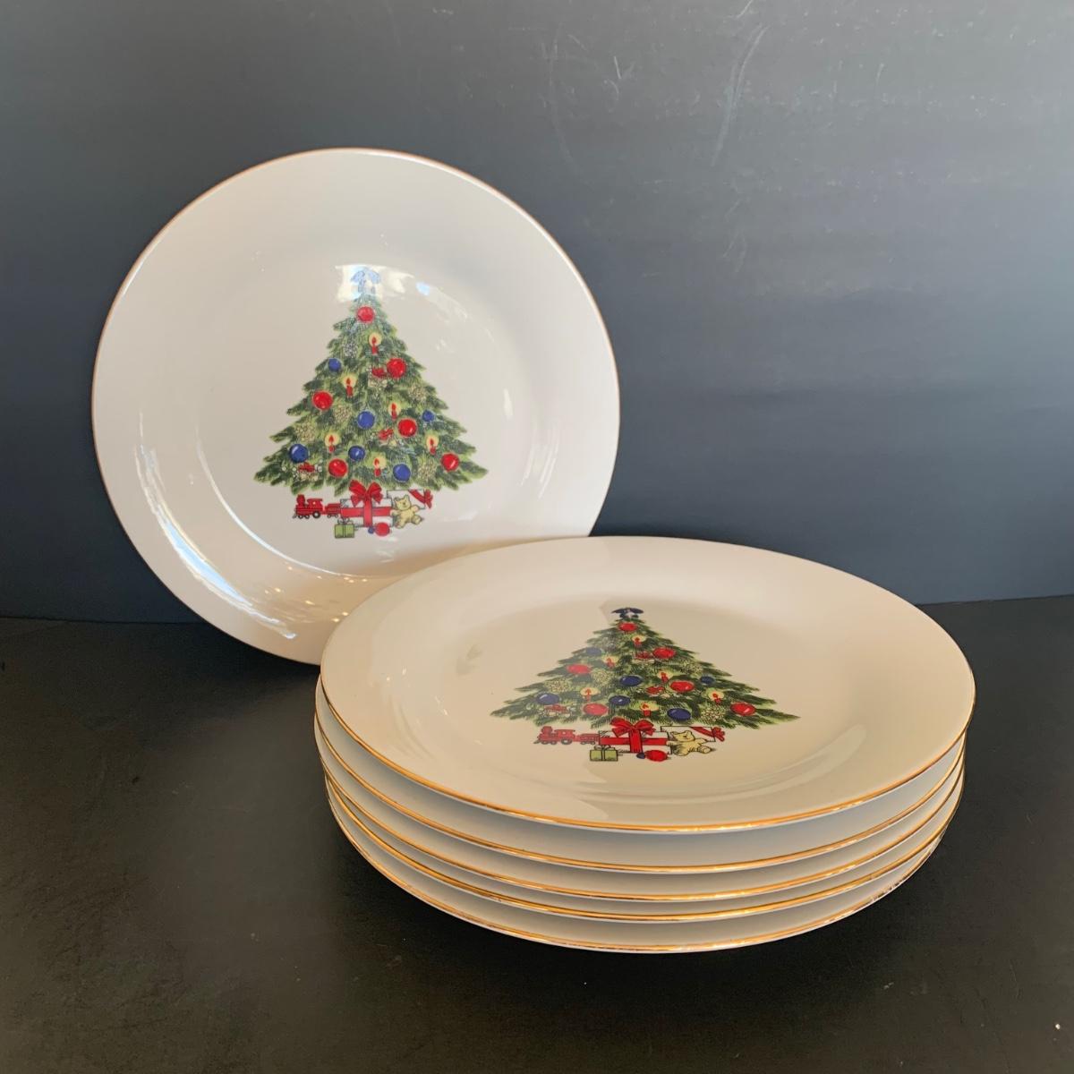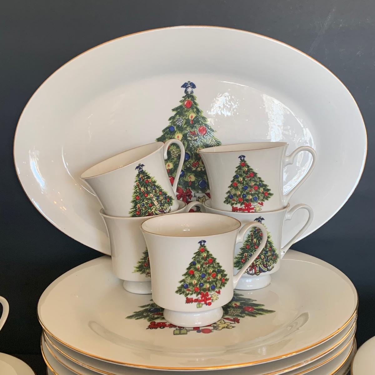 Lots is a mixed collection of holiday China very close in pattern, both are holiday trees w/gold rim however one has a toy top and the other does not.