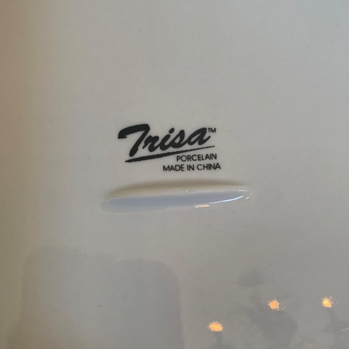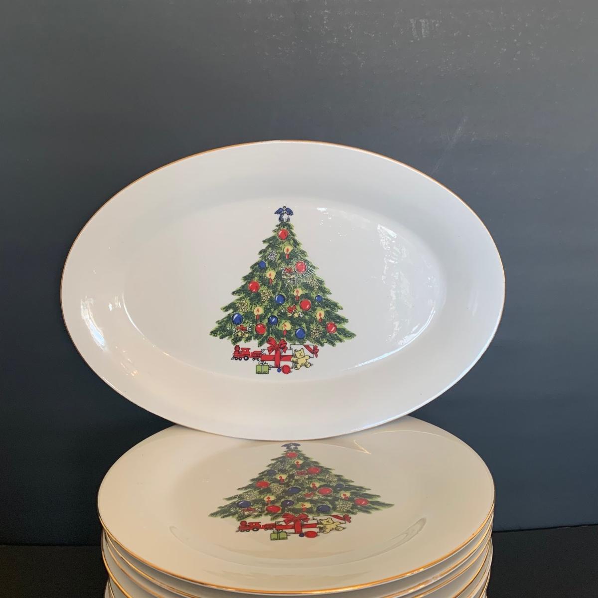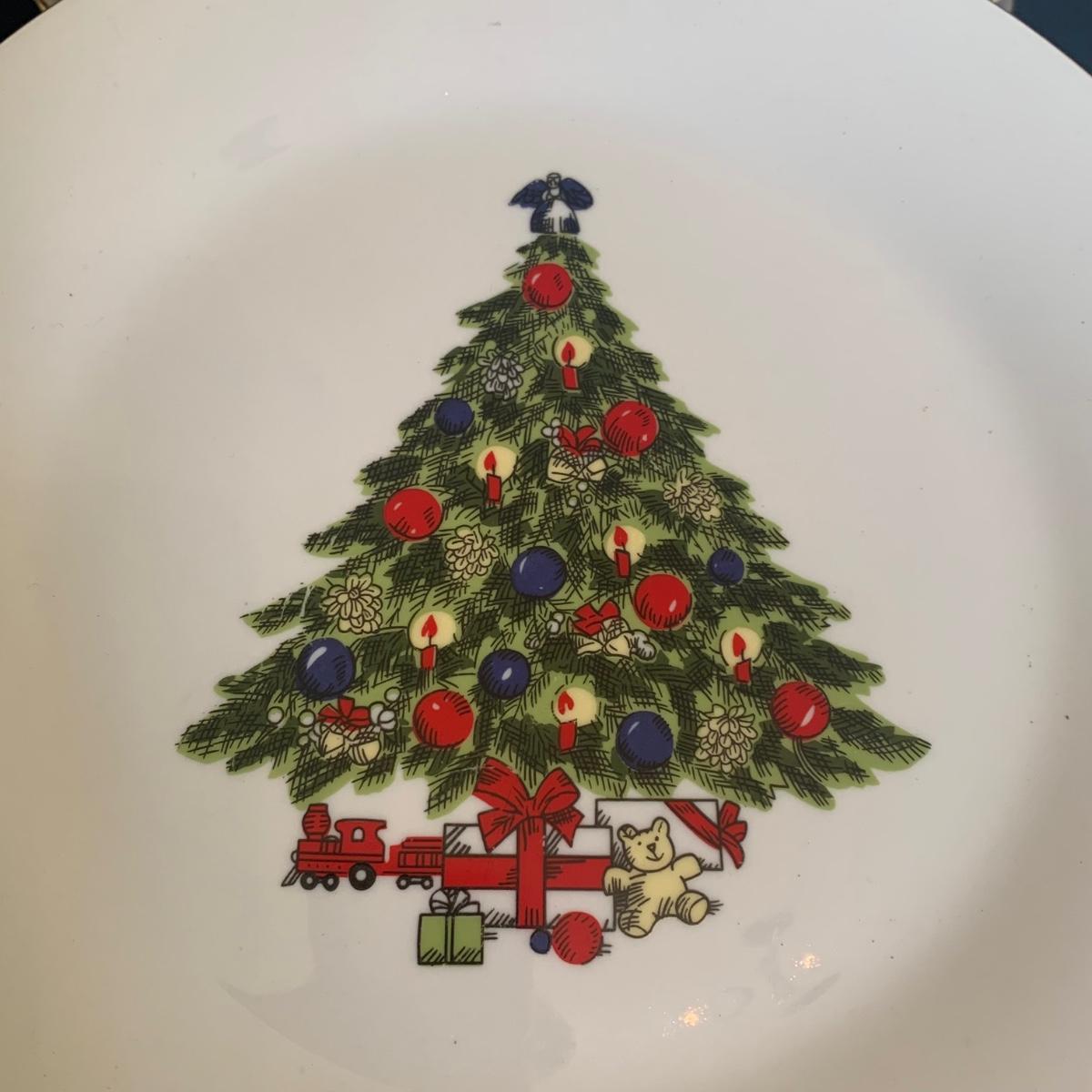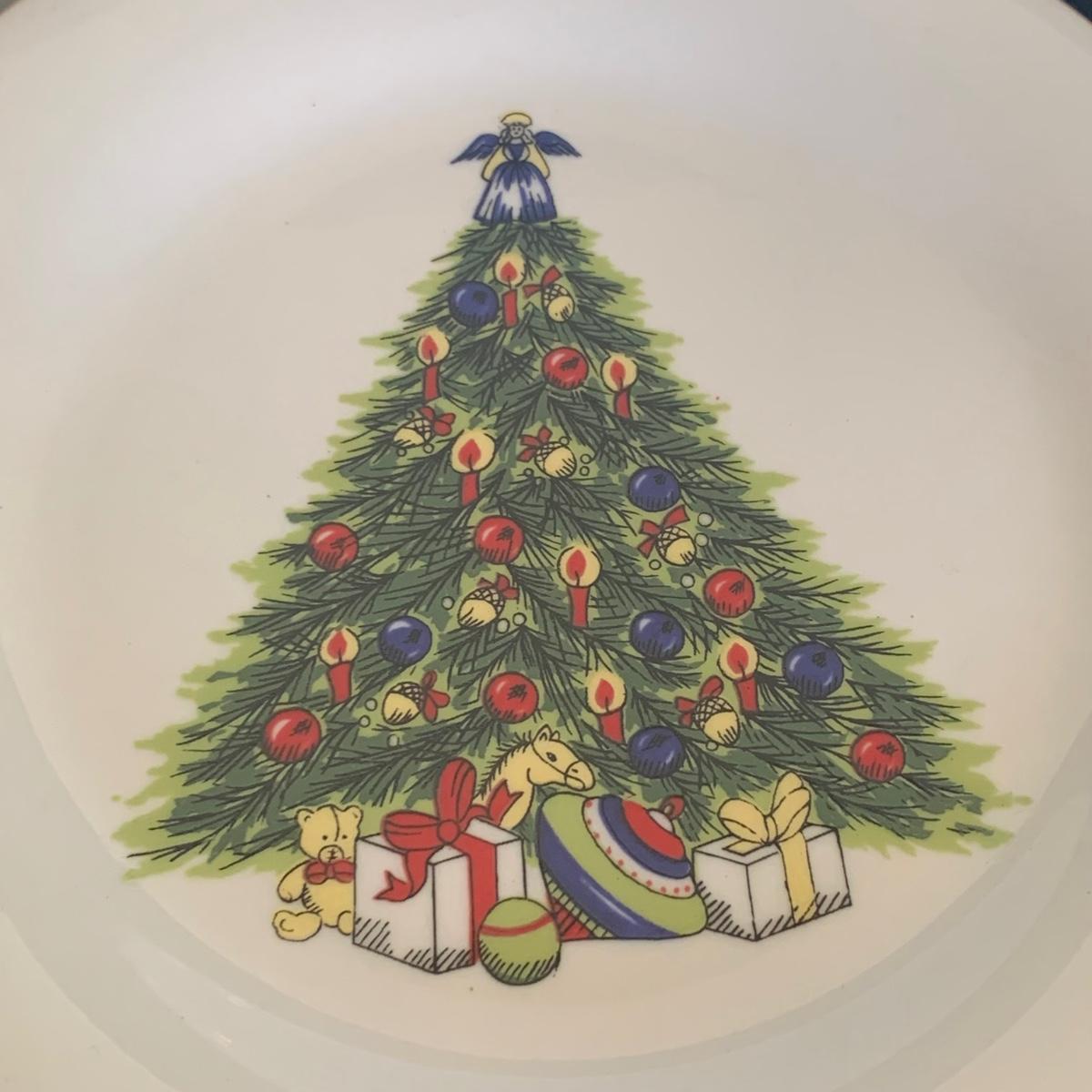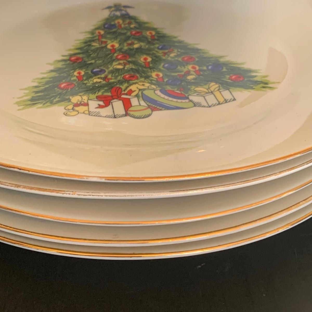 Lots is a mixed collection of holiday China very close in pattern, both are holiday trees w/gold rim however one has a toy top and the other does not.