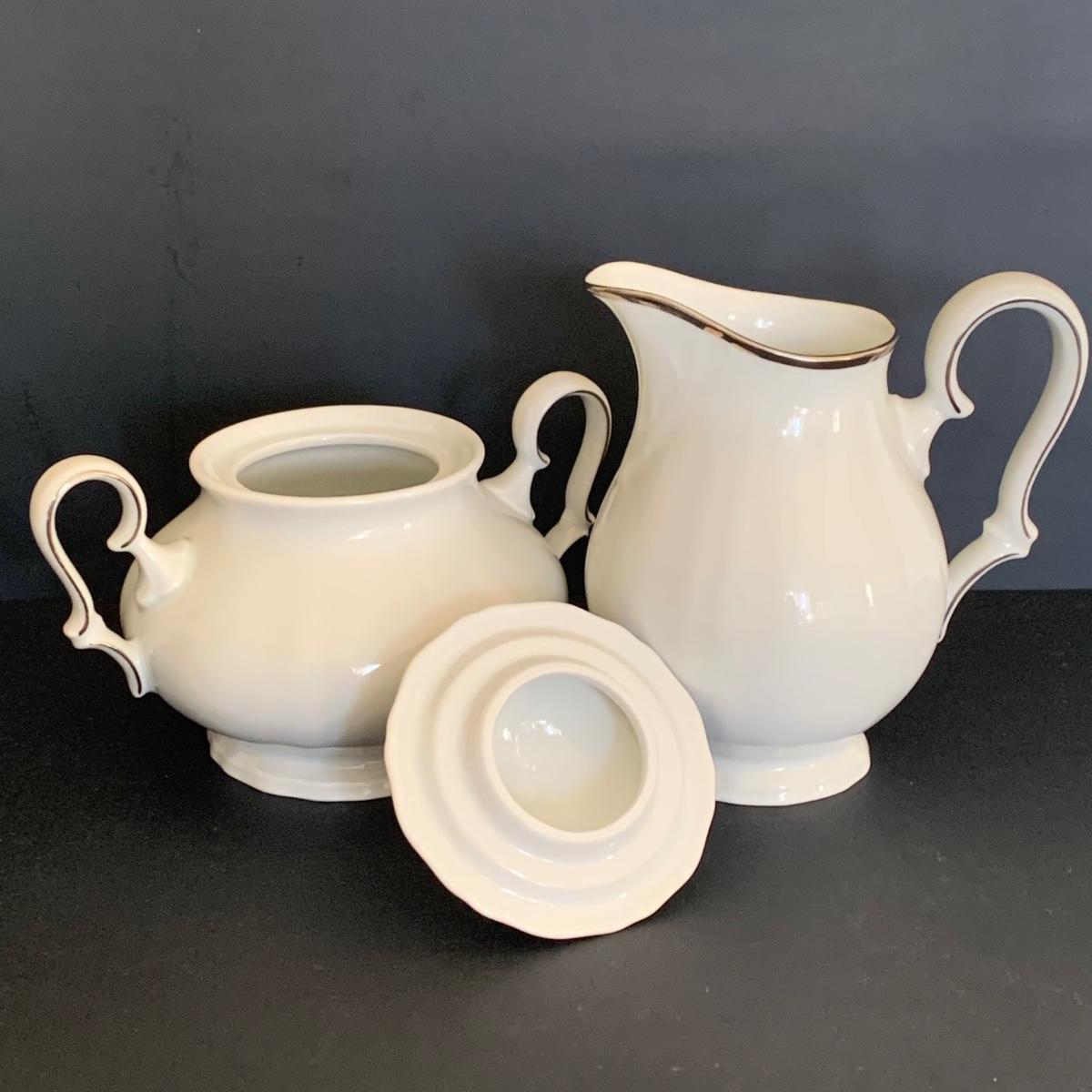 There is a service for 10 with many extras along with serving platters, lidded bowl, gravy boat, teapot and sugar/creamer.