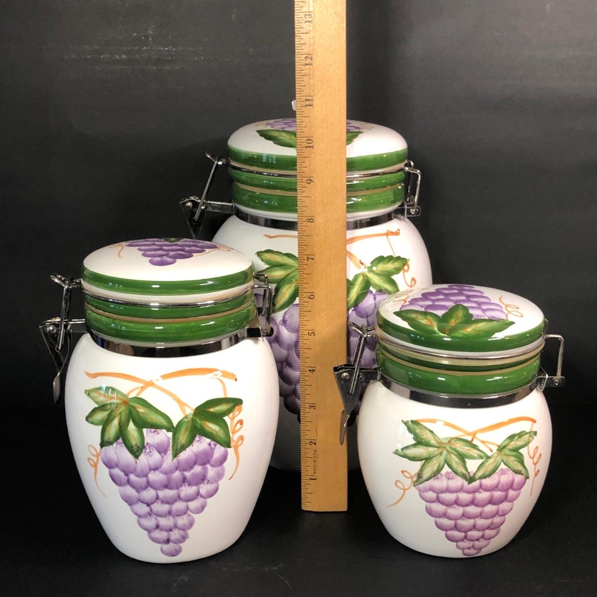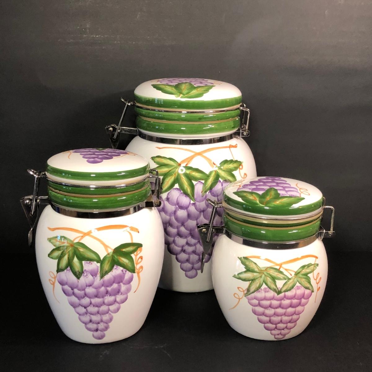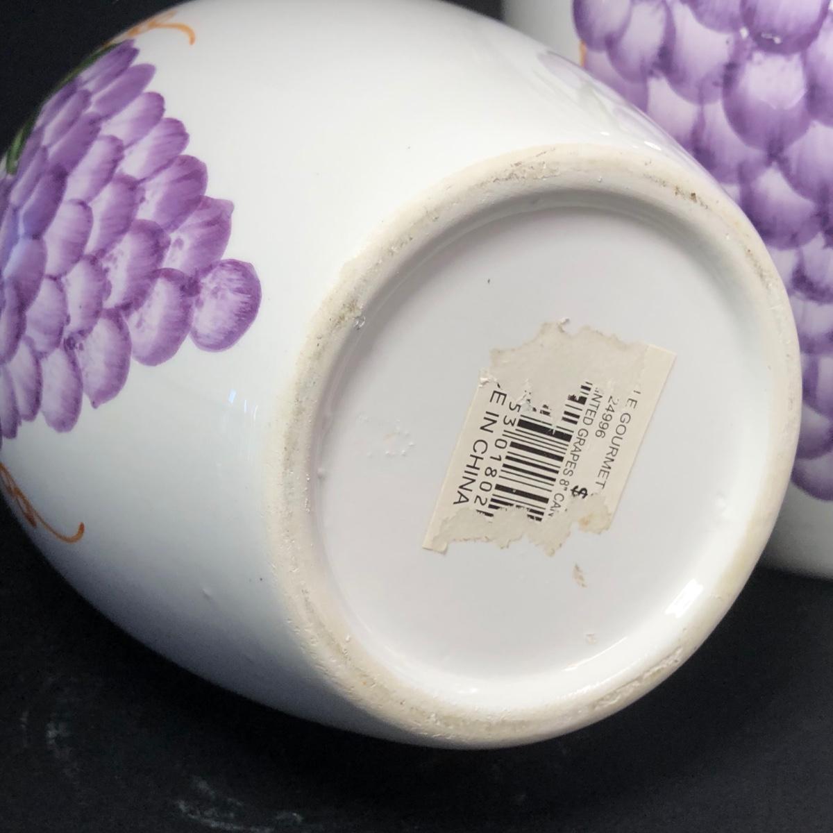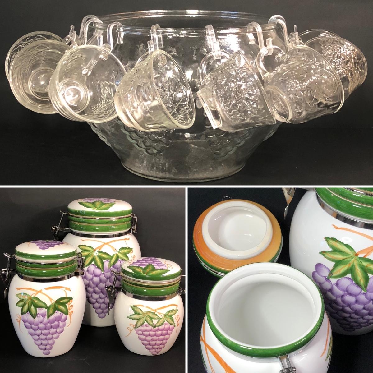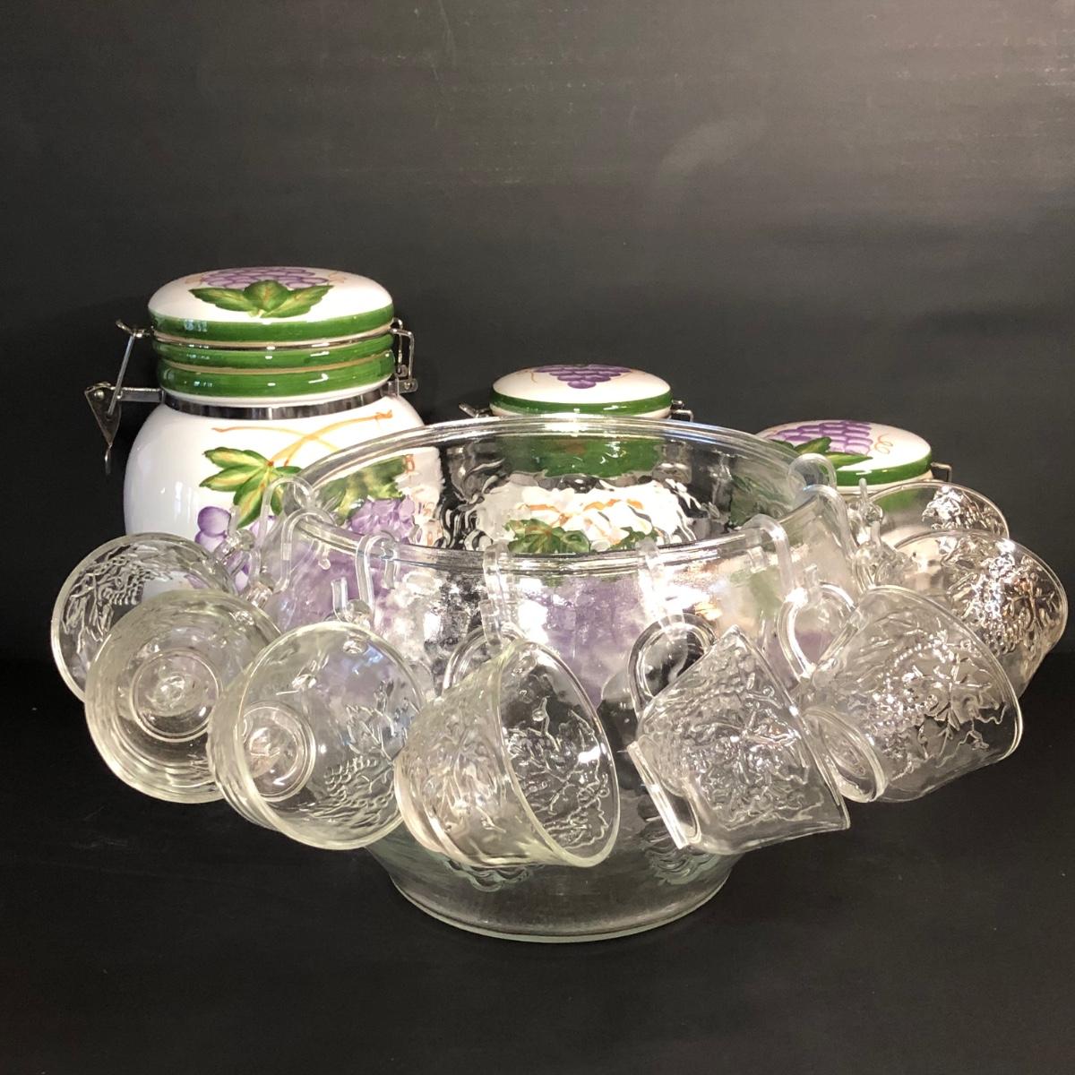 LOT 87M: Grape Themed Kitchen Canisters & Glass Grape Bowl w/ 8 Matching Cups