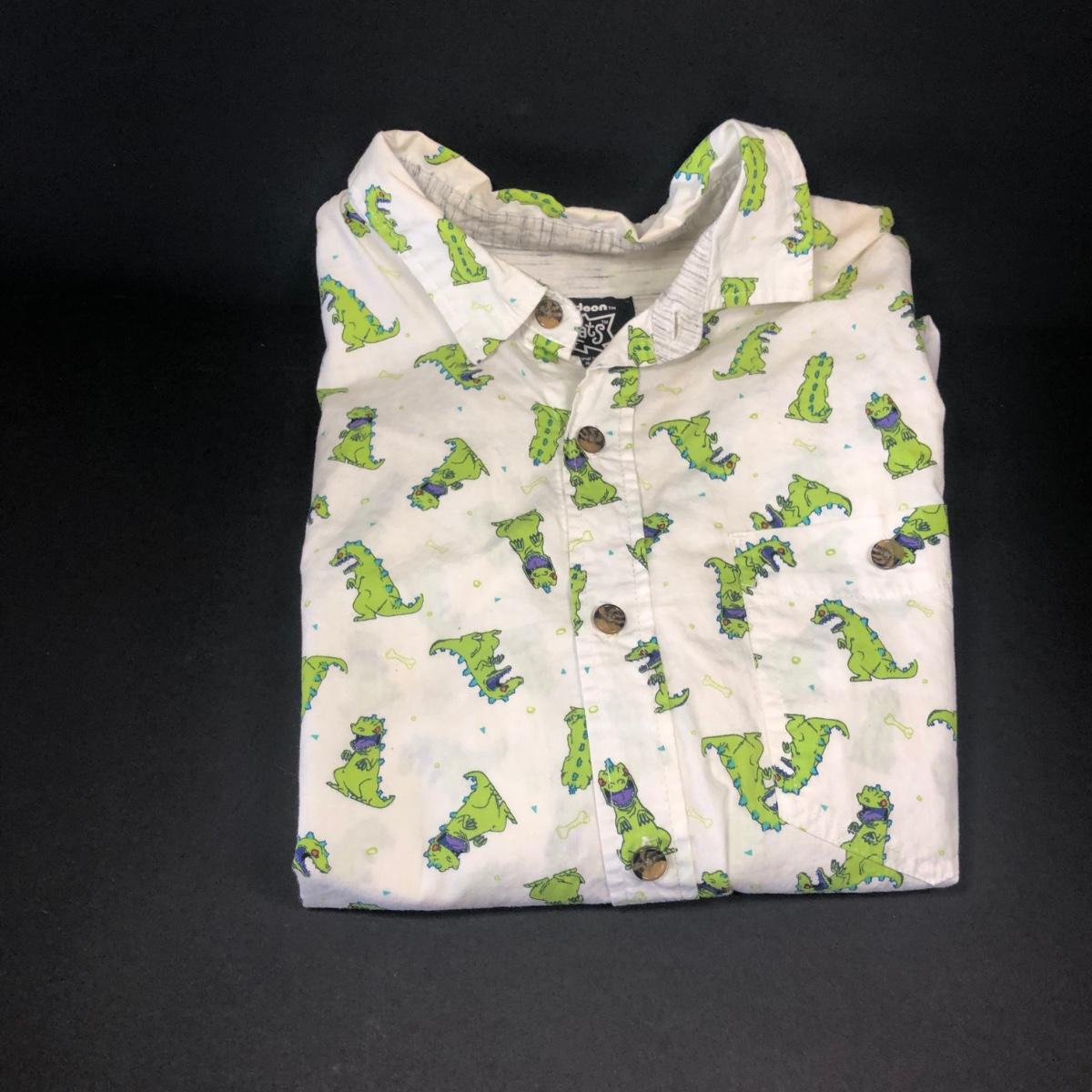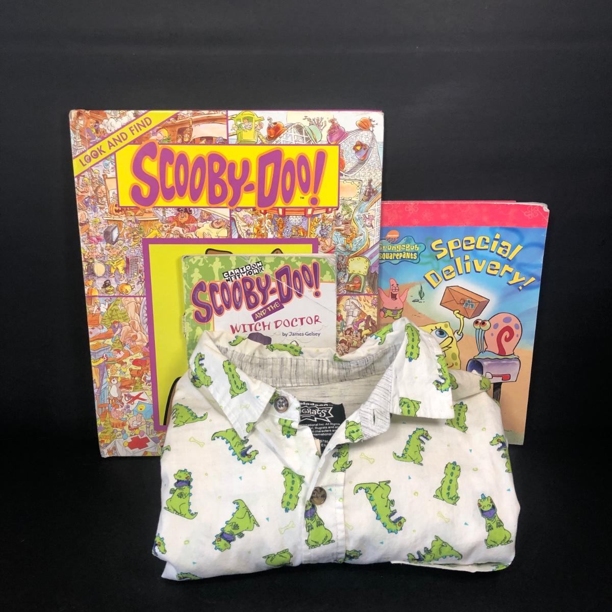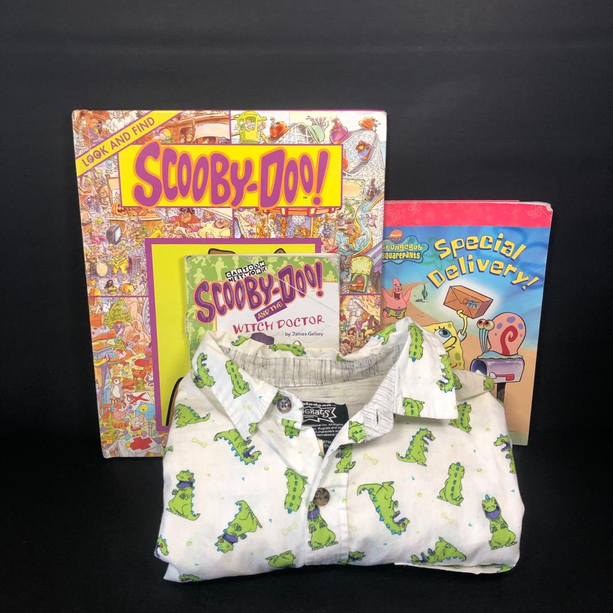 LOT 92M: Child's Medium Nickelodeon Rugrats Reptar Short Sleeve Button Down Shirt w/ Scooby Doo & Spongebob Books