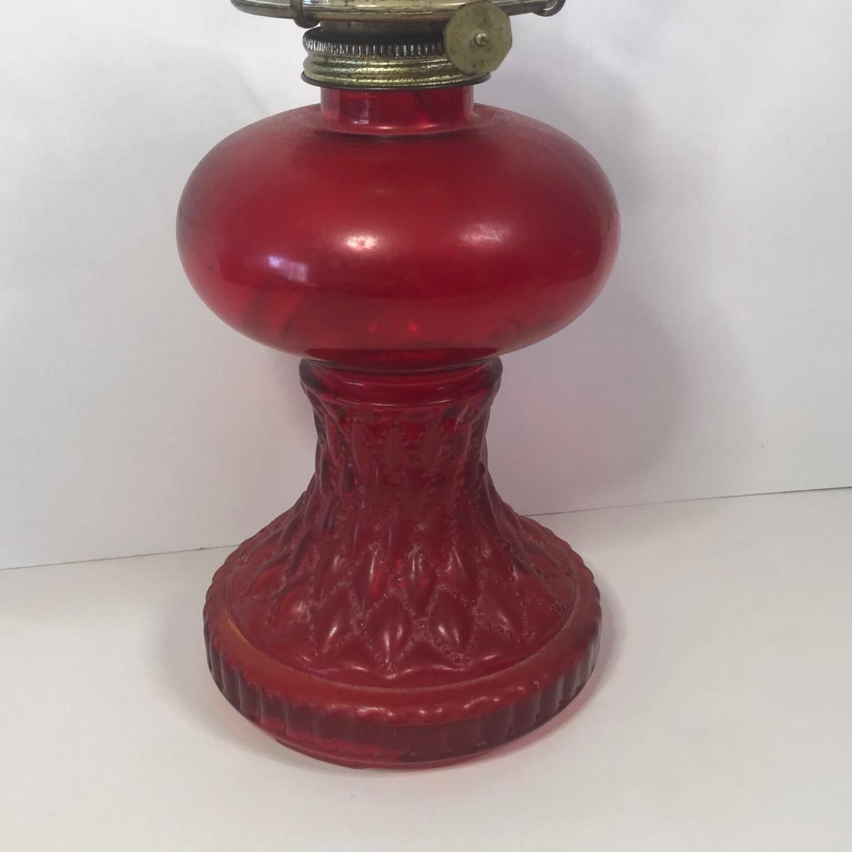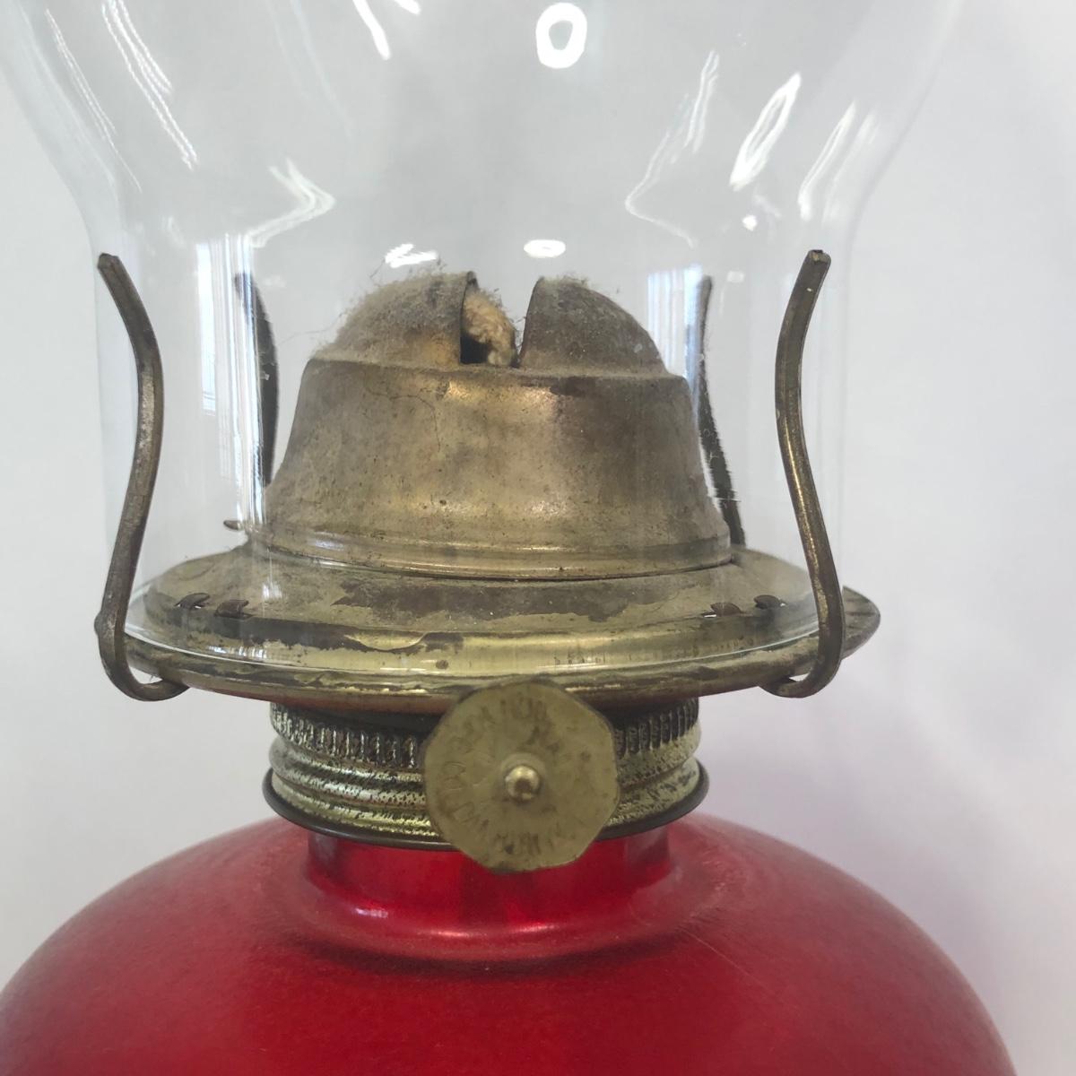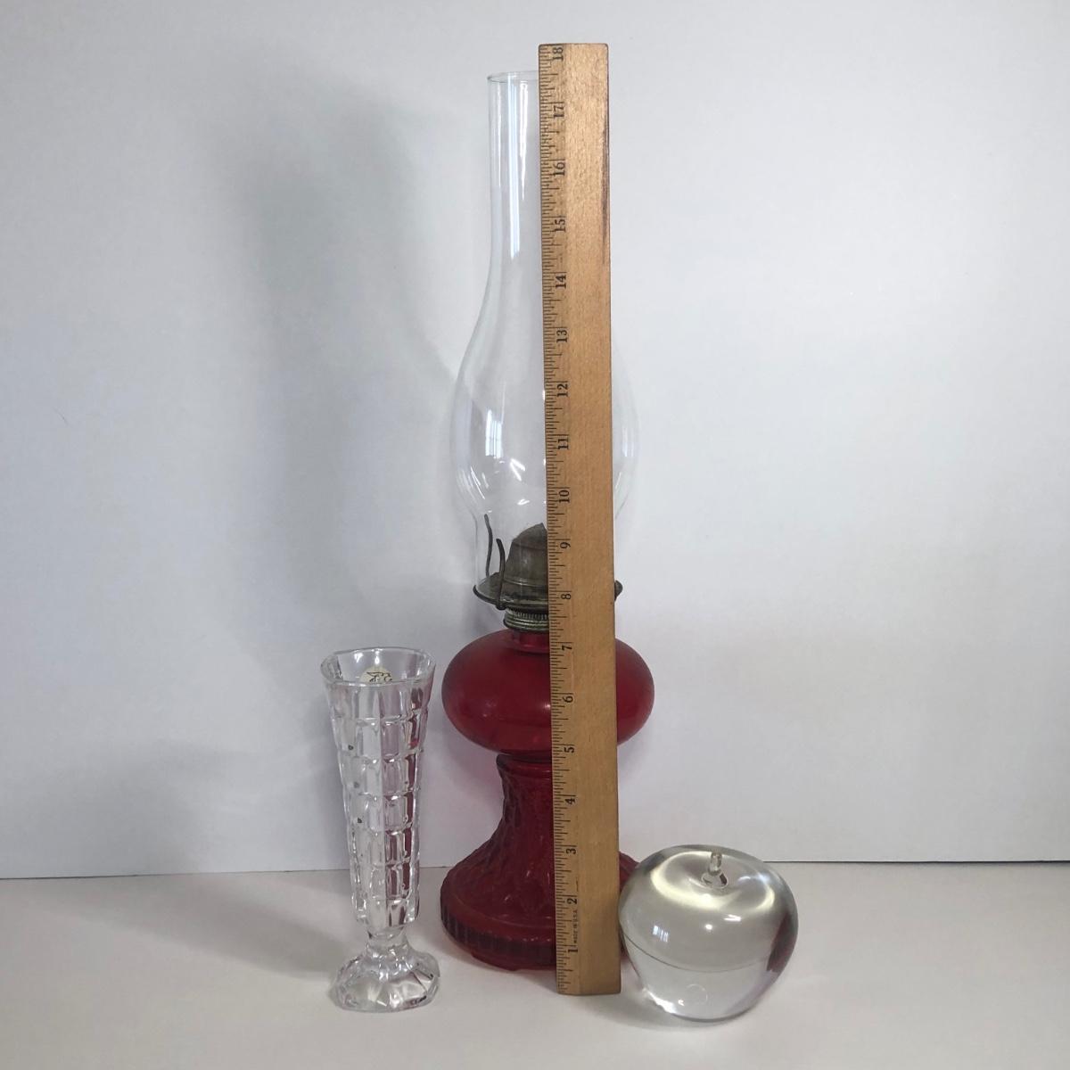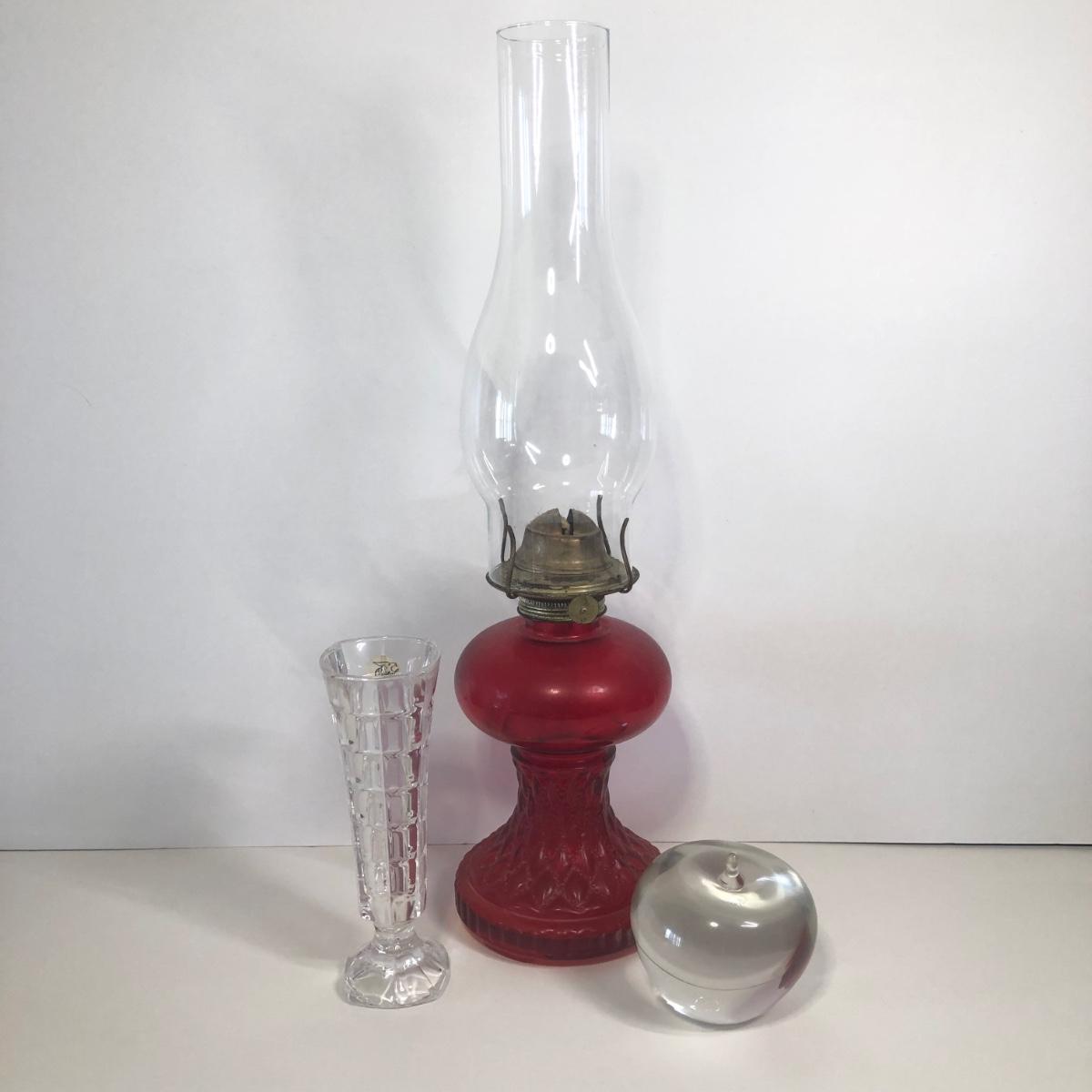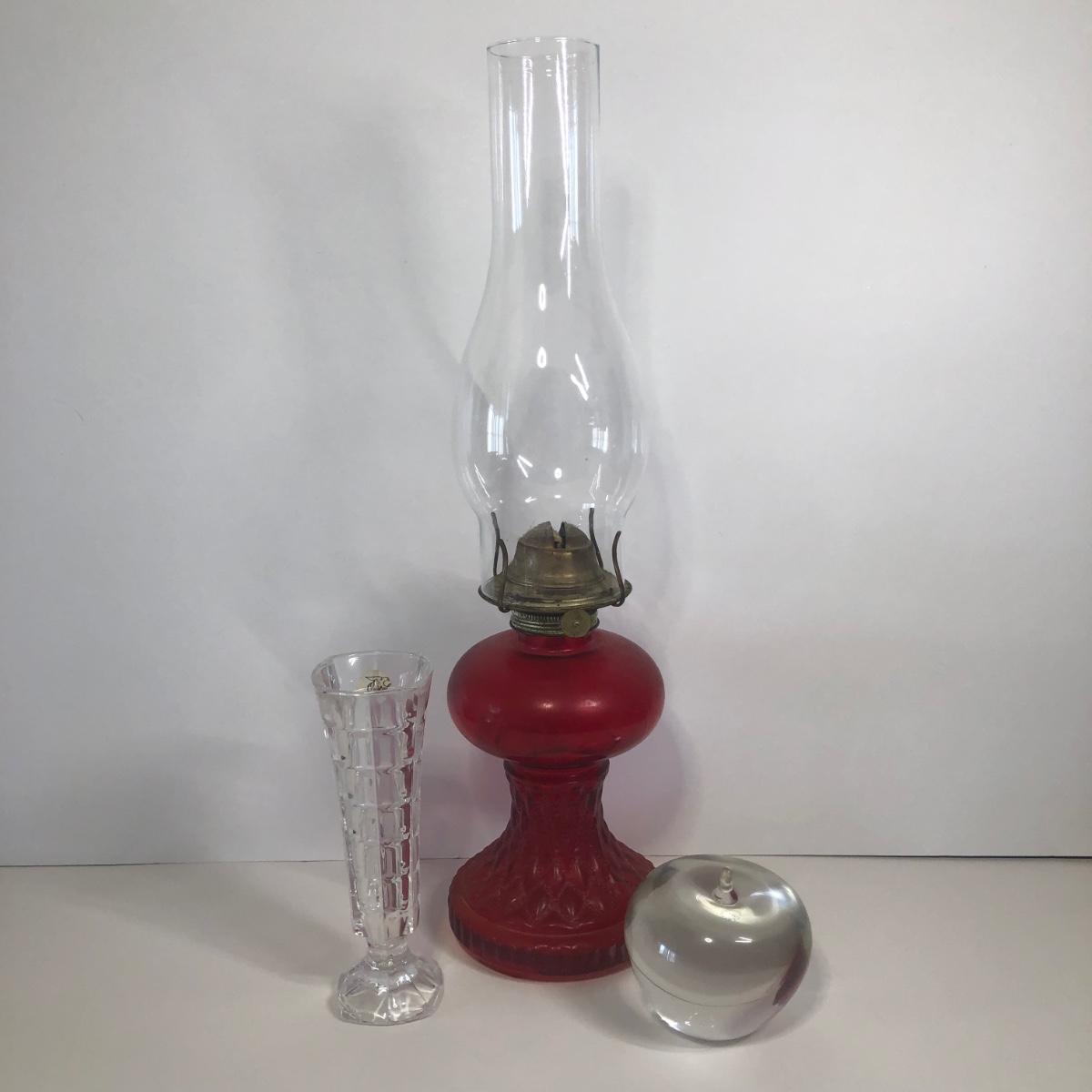 LOT 94M: Vintage Risdon Mfg Co Red Glass Oil Lamp w/ Larson Crystal Apple & Cristal d'Arques Bud Vase
