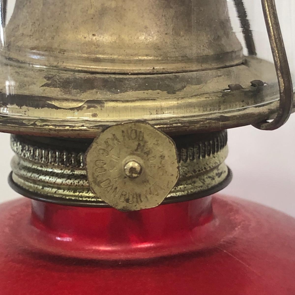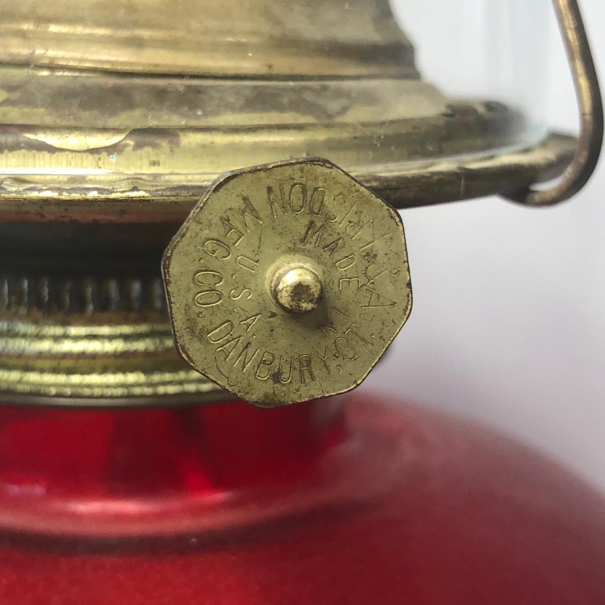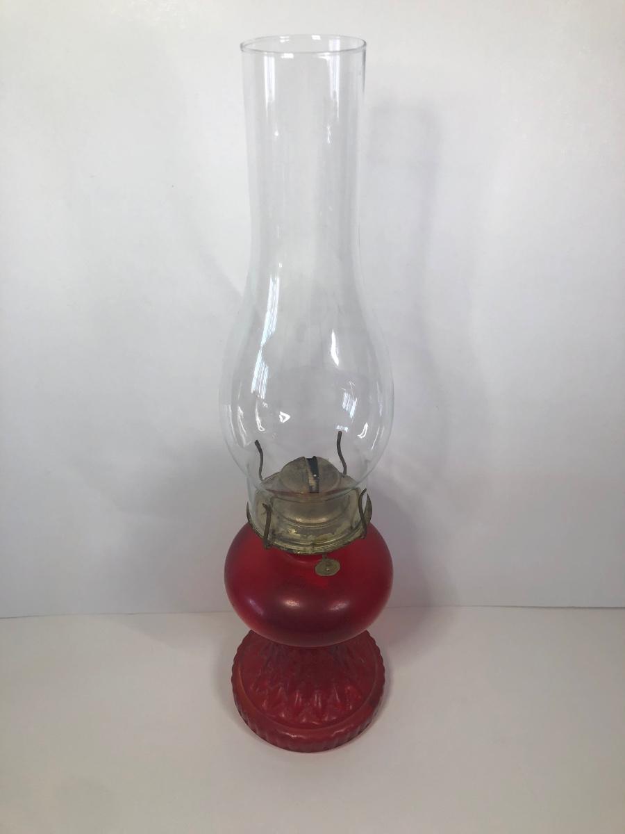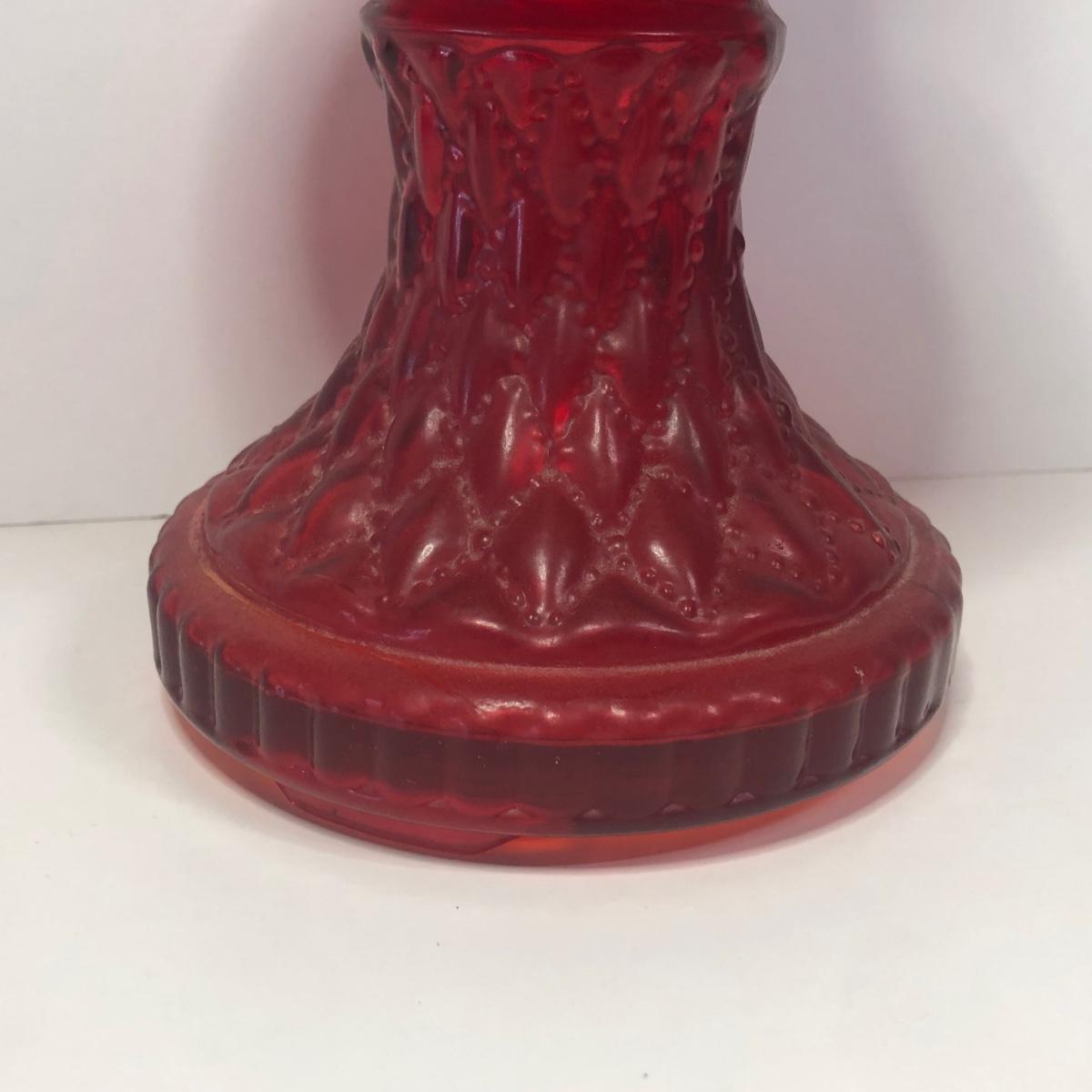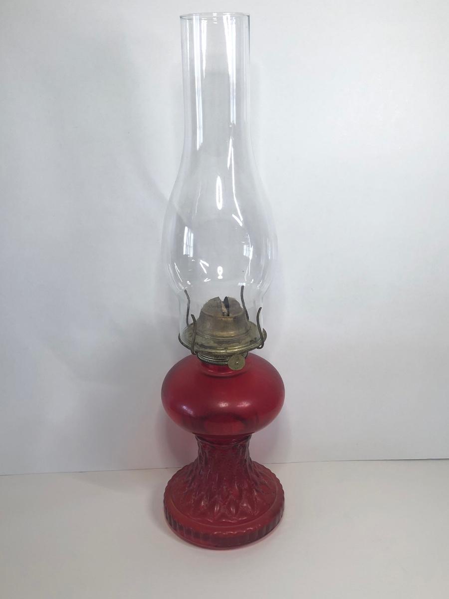 LOT 94M: Vintage Risdon Mfg Co Red Glass Oil Lamp w/ Larson Crystal Apple & Cristal d'Arques Bud Vase