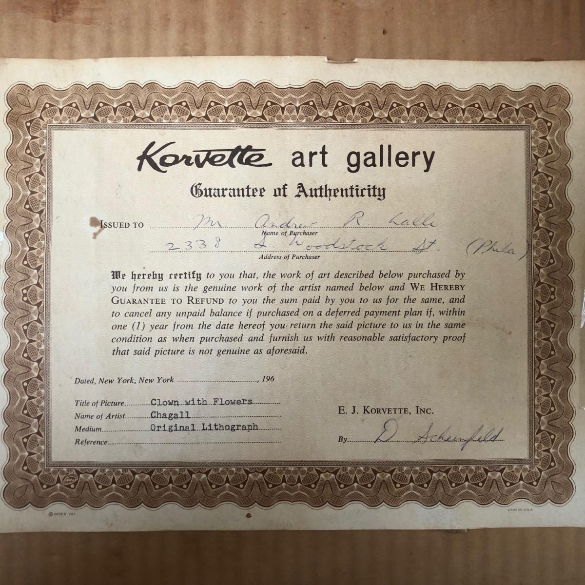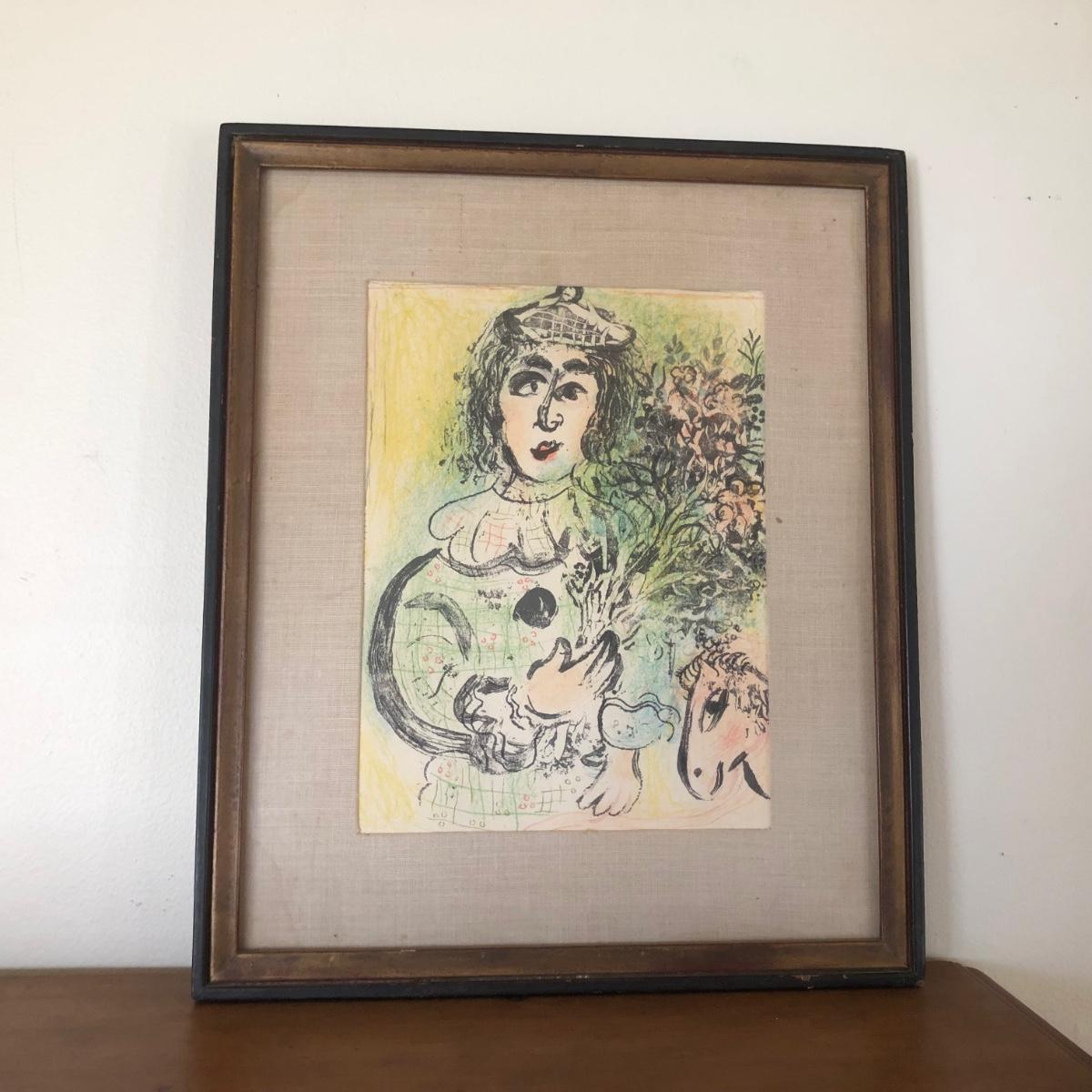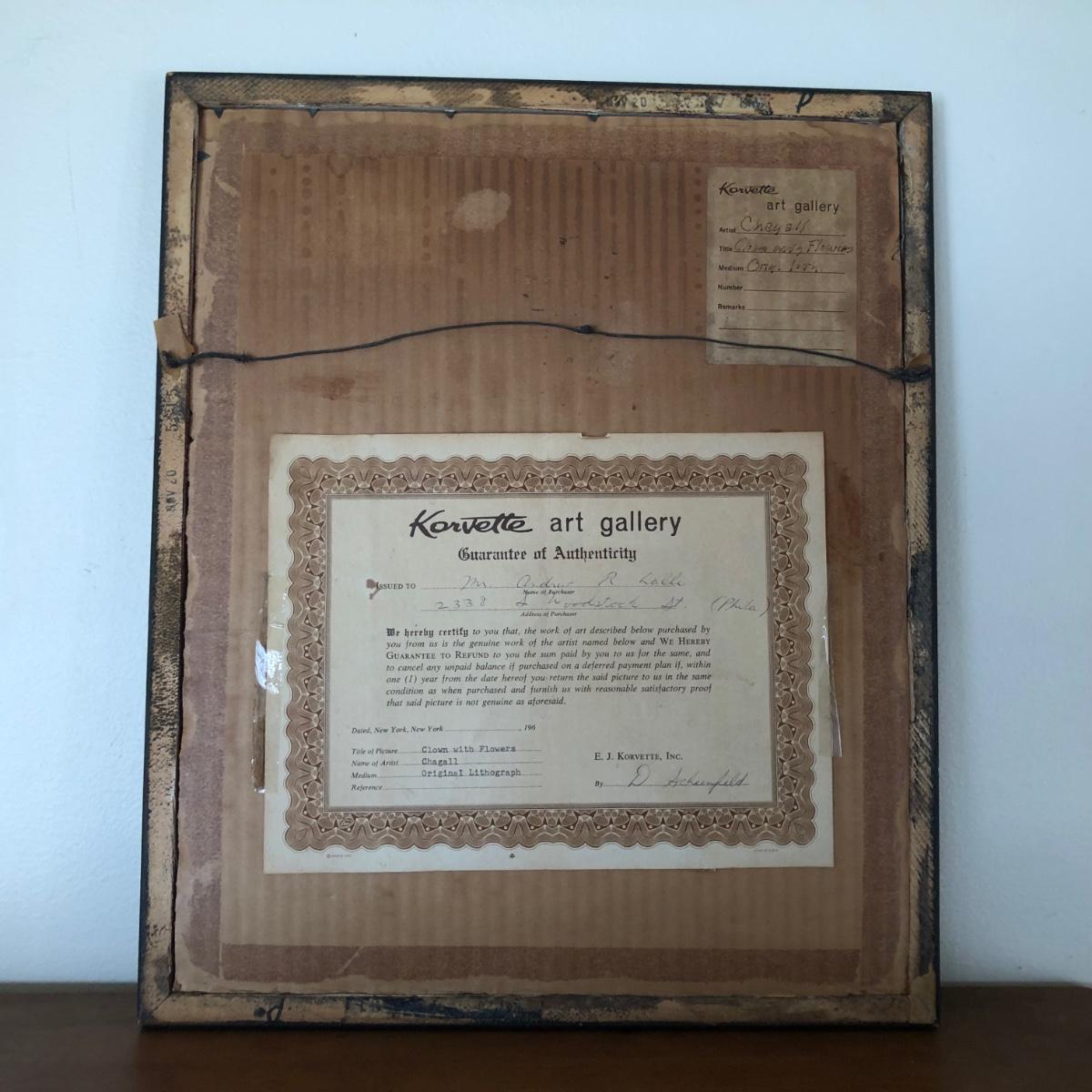 LOT 115M: Framed 1963 Marc Chagall "Clown with Flowers" Lithograph w/ Guarantee of Authenticity from Korvette ARt Gallery