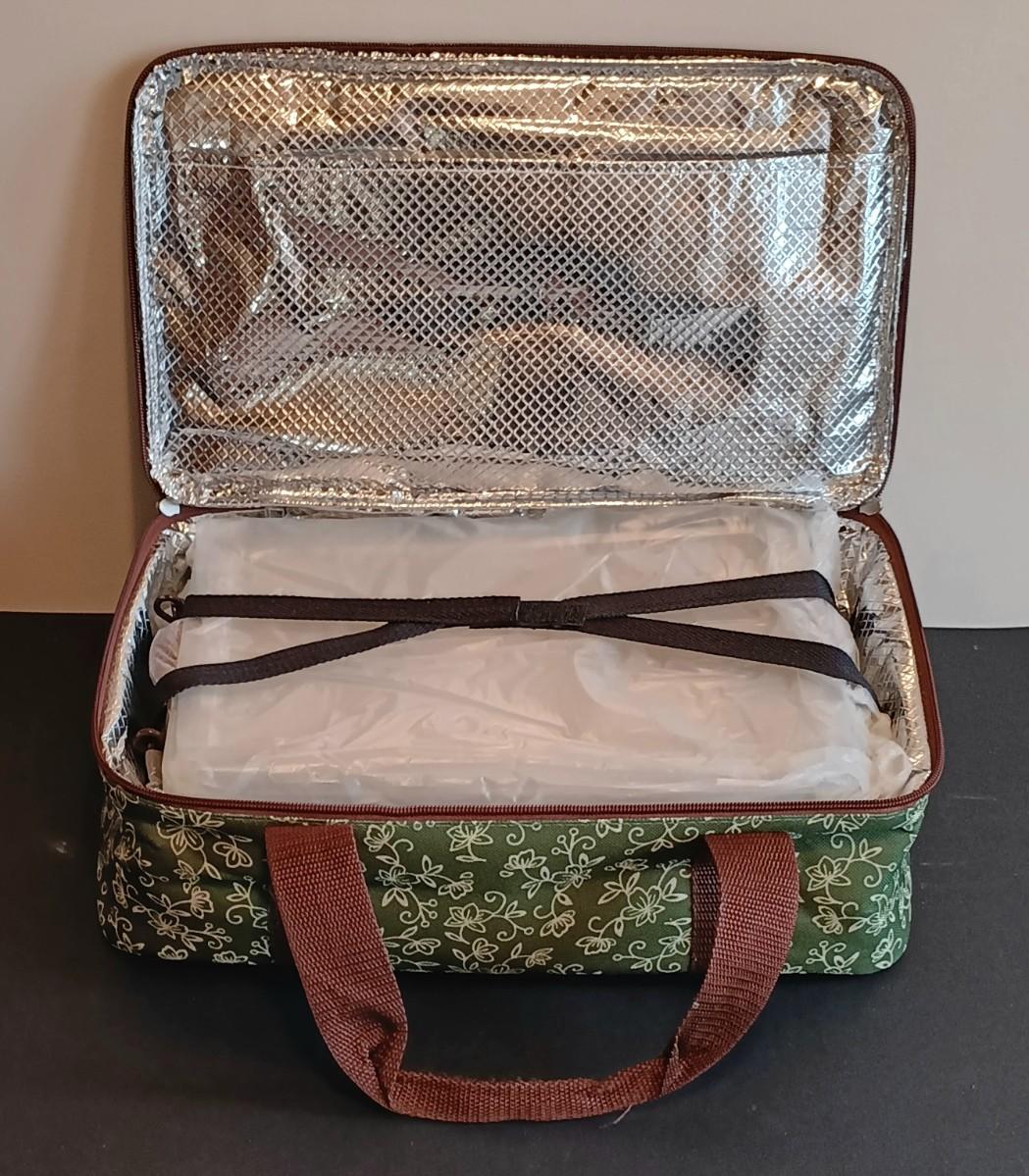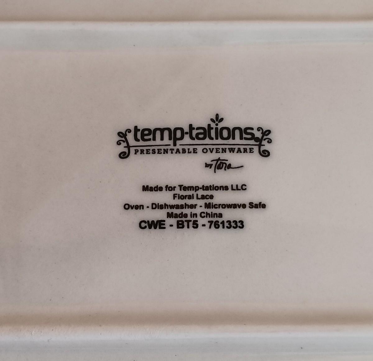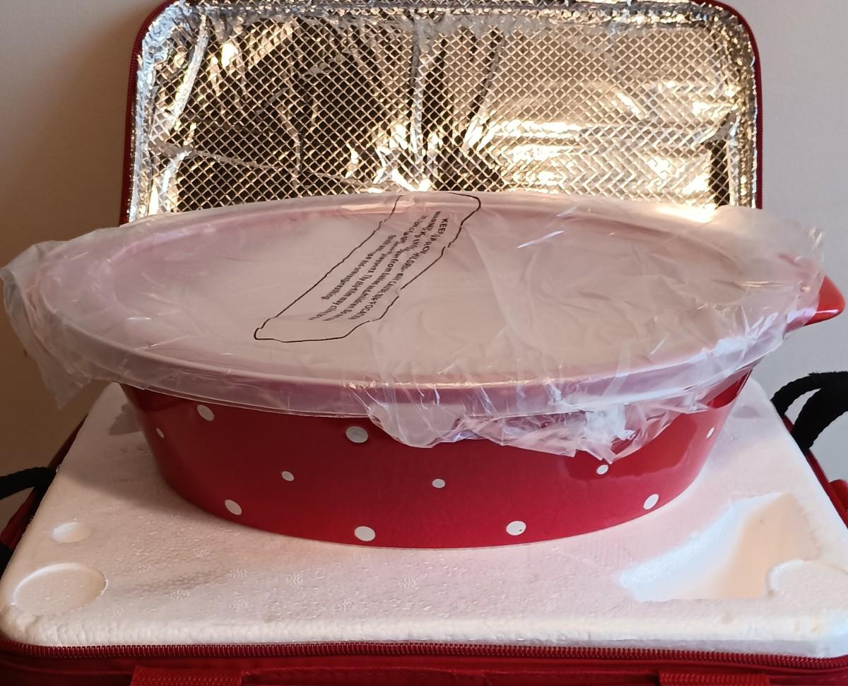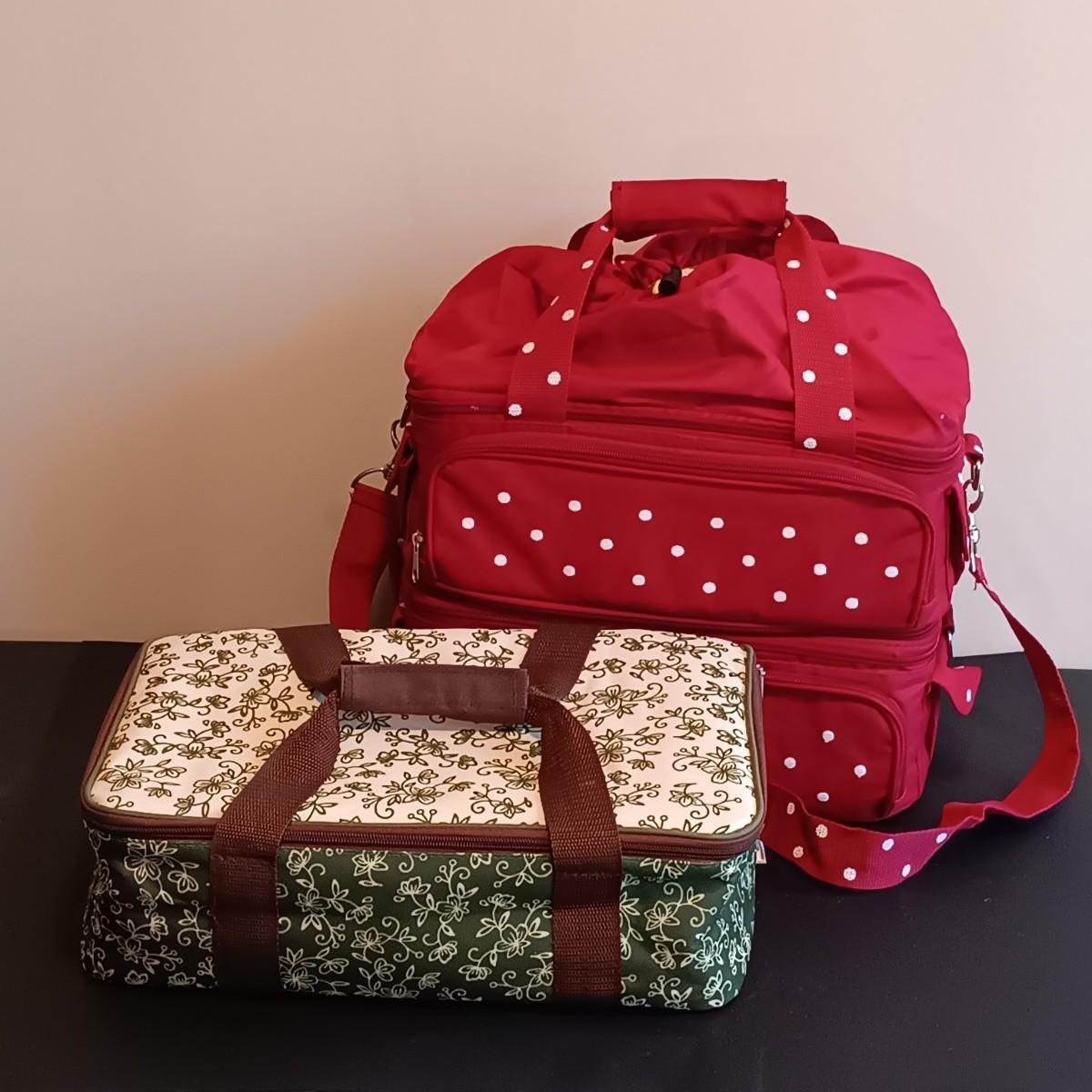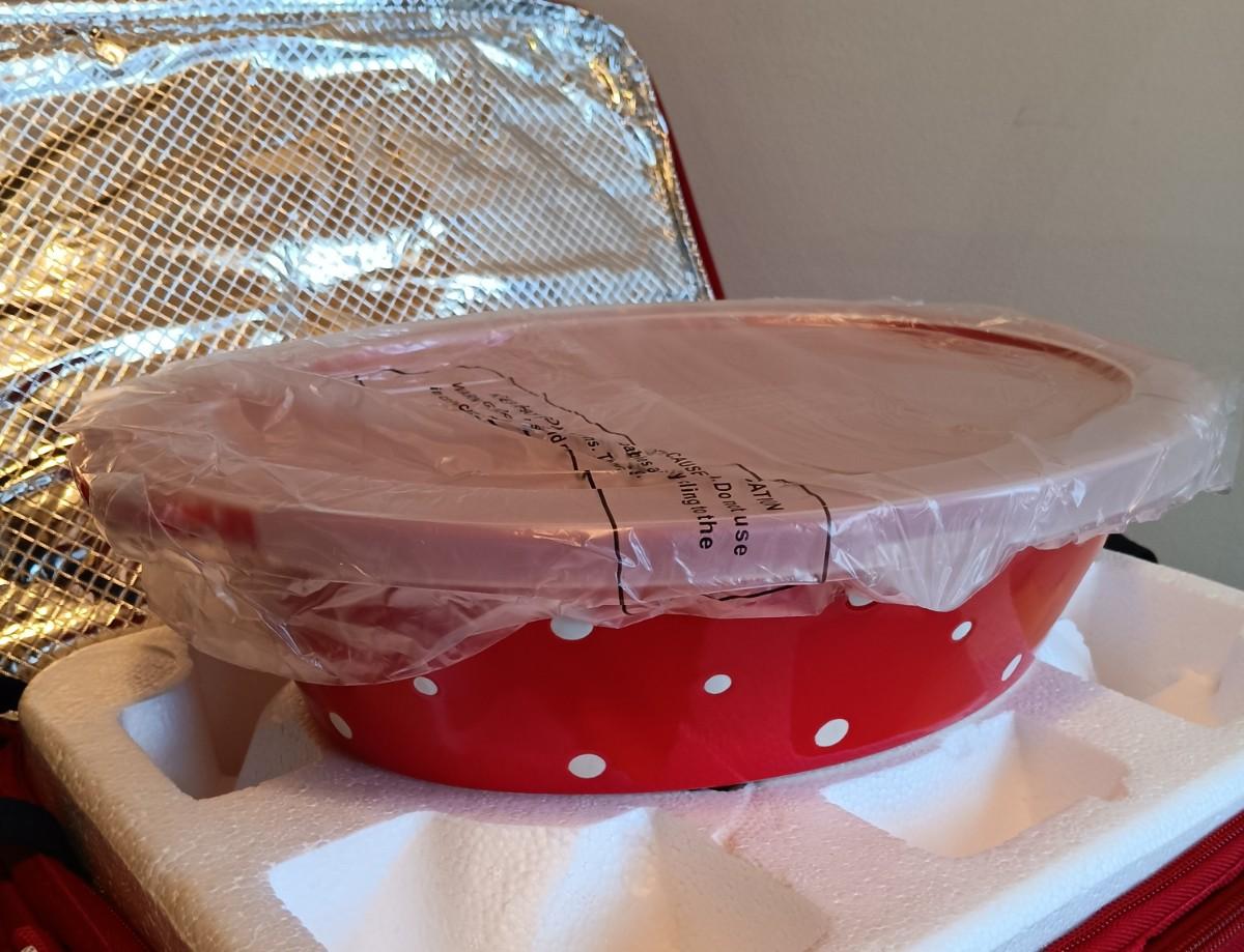LOT 7K: Temp-Tations Red Polka Dot Bakeware Set and Floral Lace Set w/ Insulated Totes