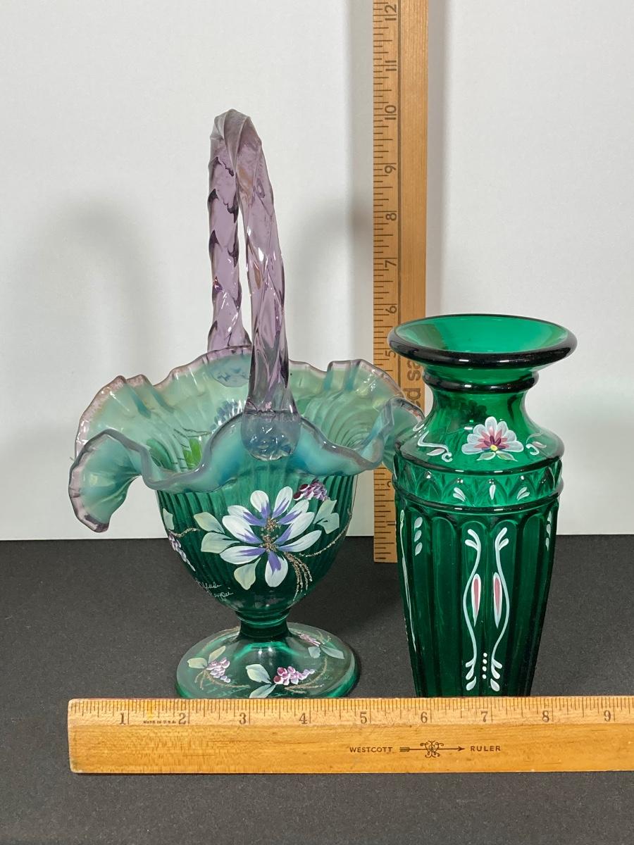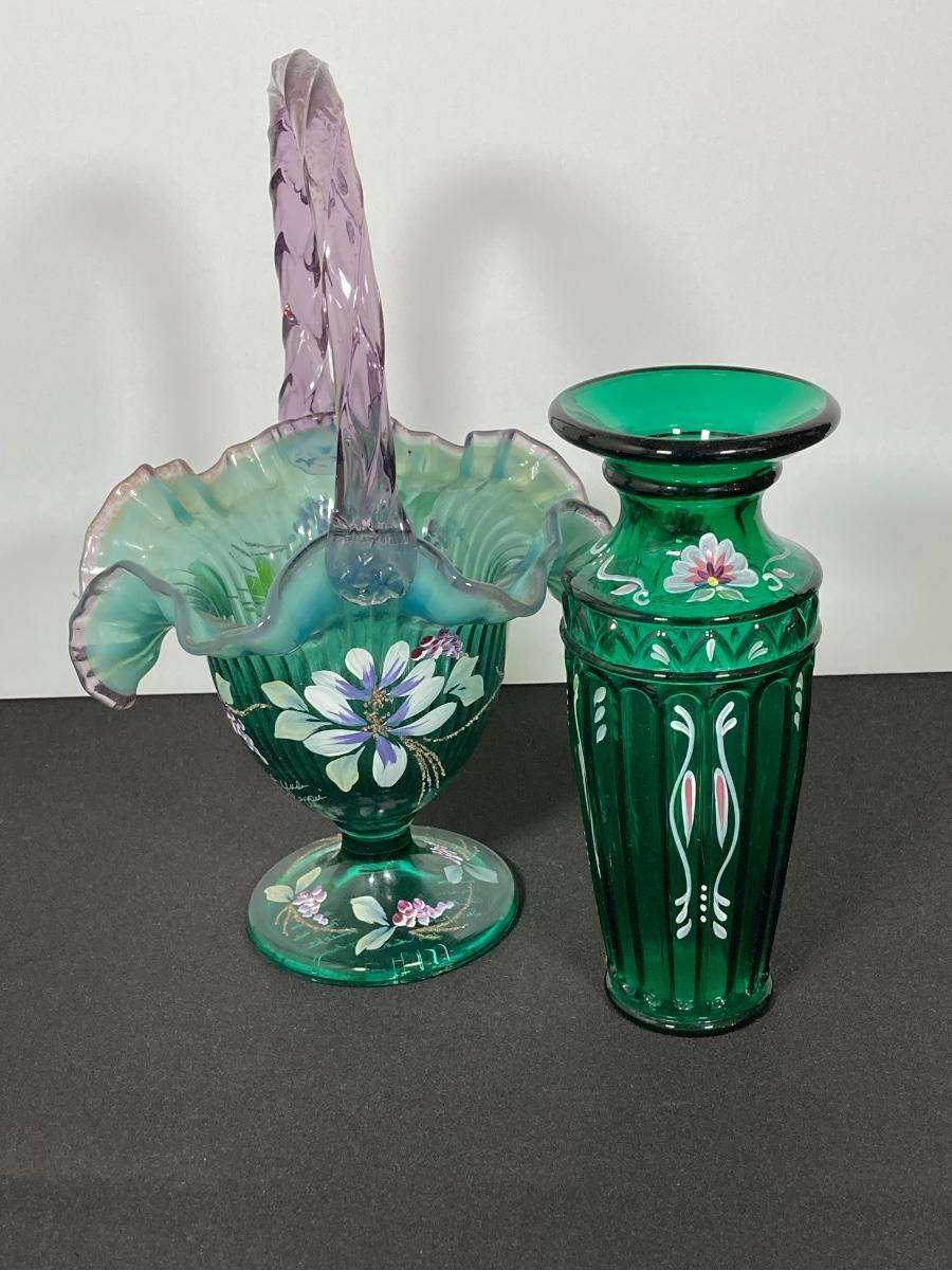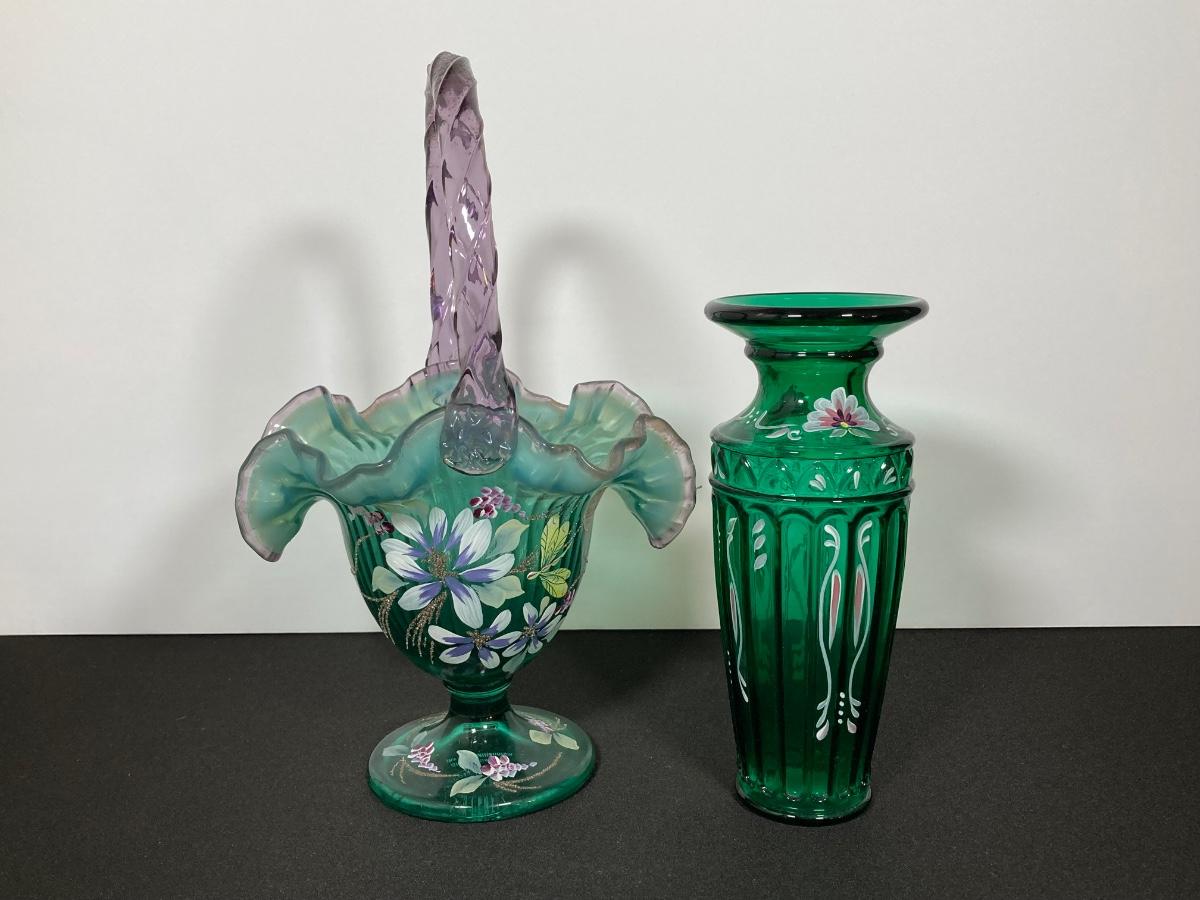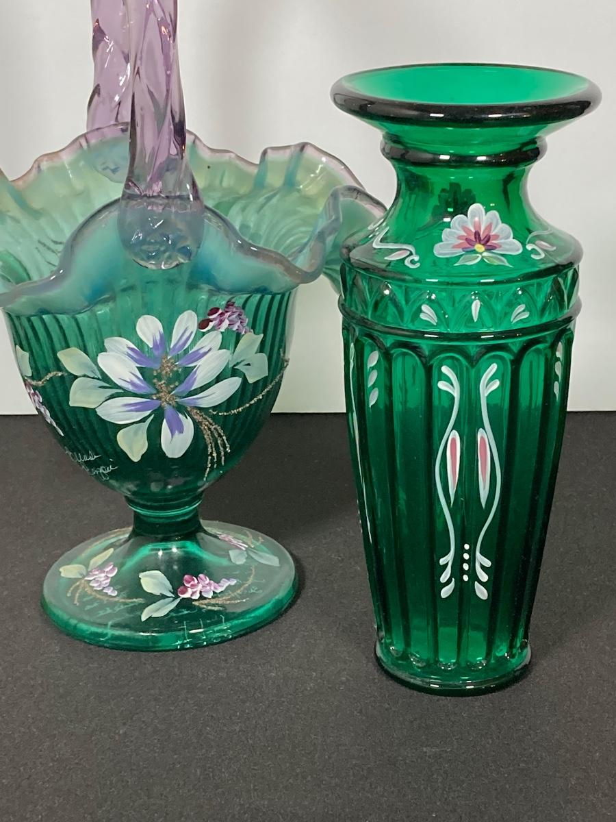 LOT 43J: Fenton Green Vase with New Century Collection Lavender and Green Basket