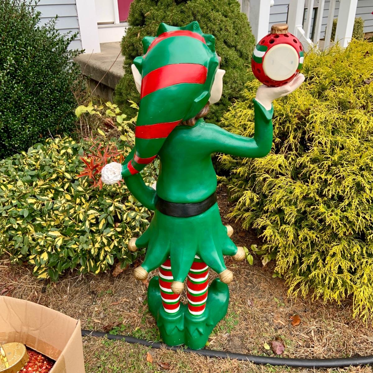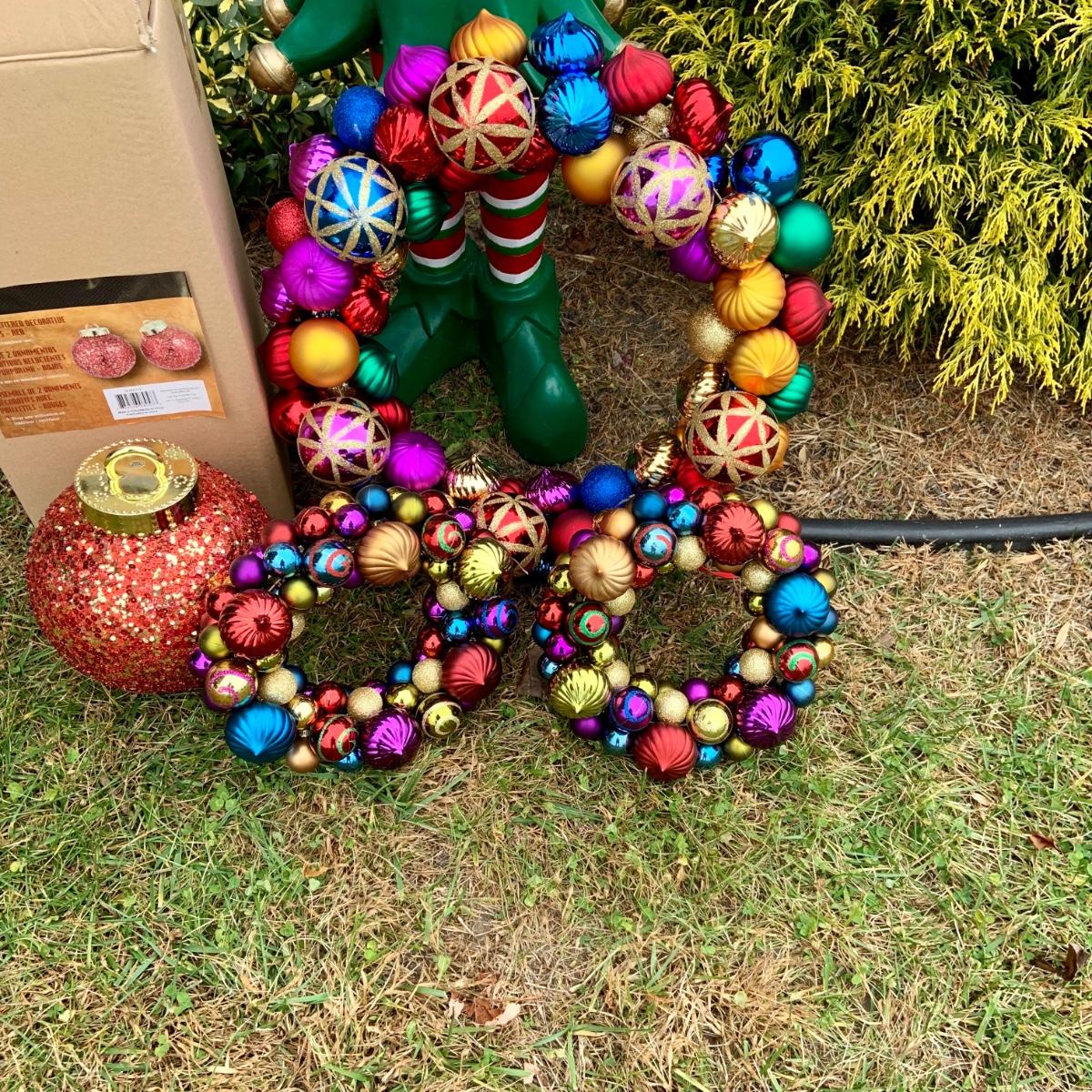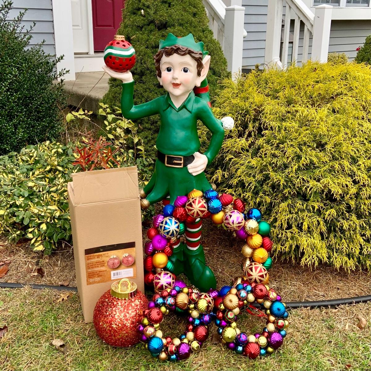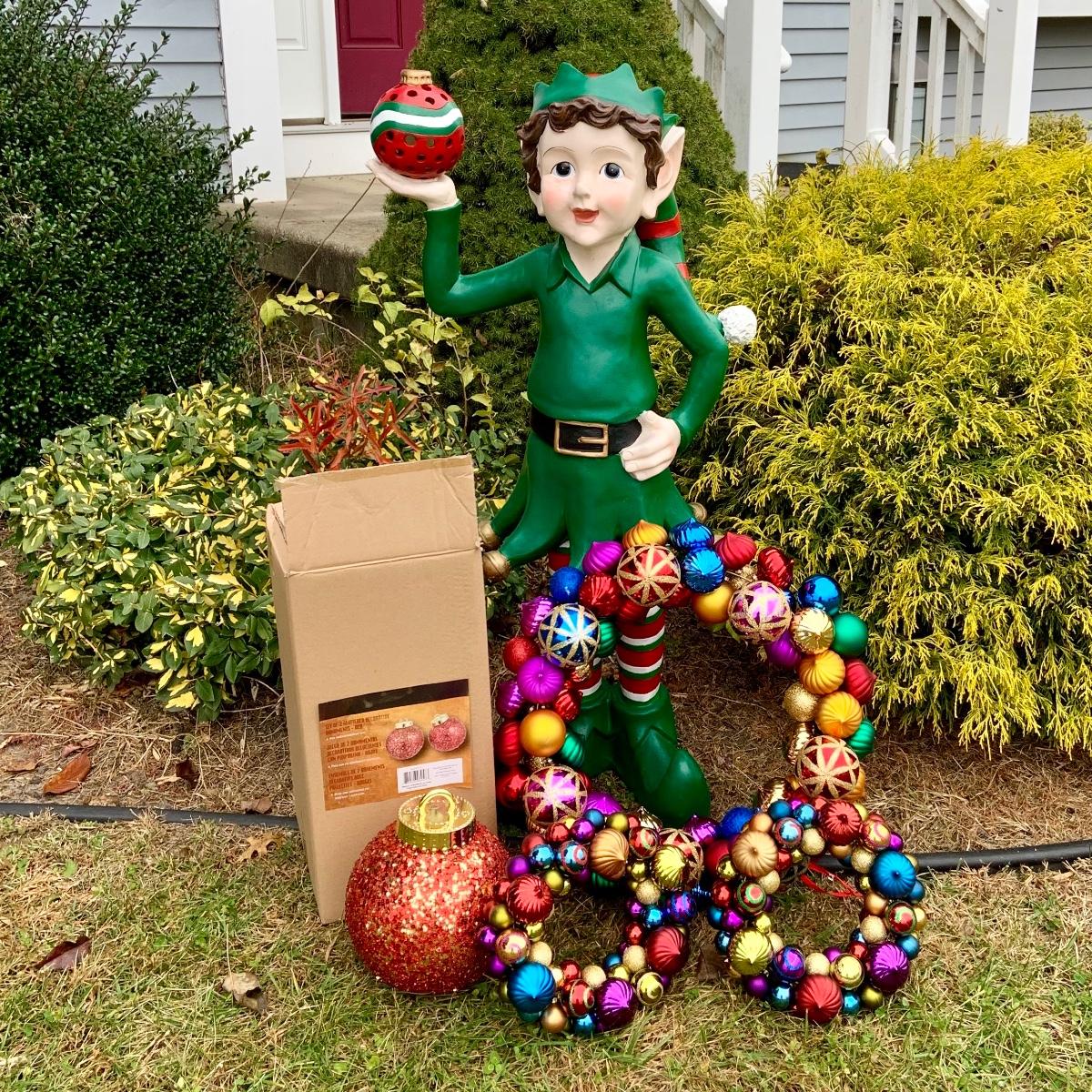 LOT:55G: Large Holiday Elf Outdoor Decoration; Oversized Christmas Bulb and Glass Bulb Wreaths