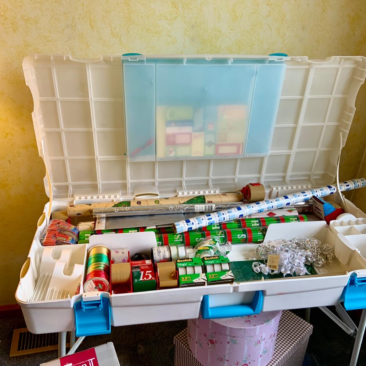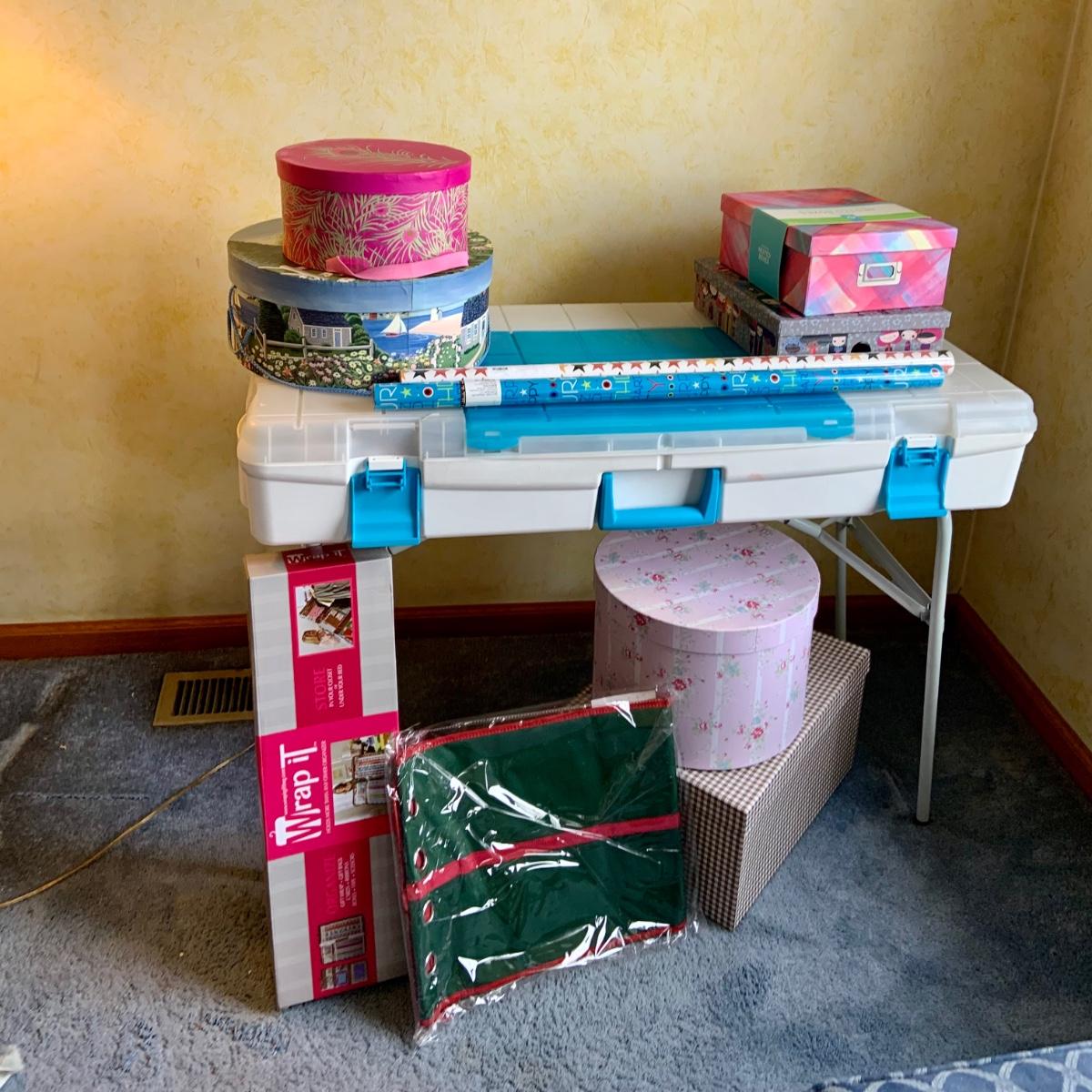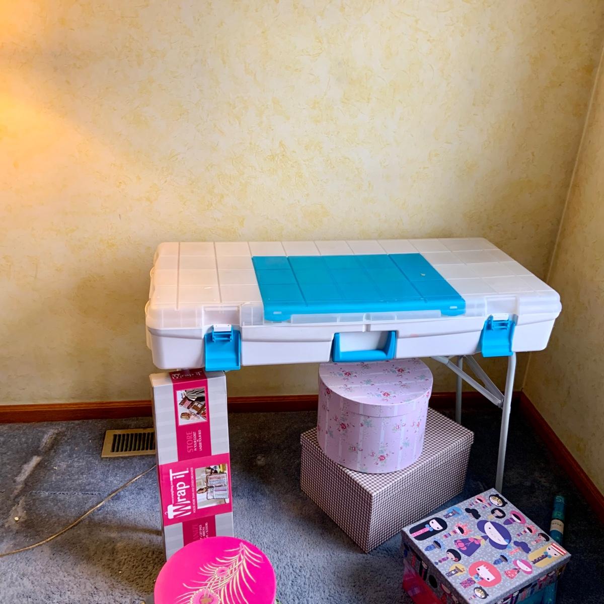 LOT:58G: Snapware Portable Gift Wrap and Crafting Table with Storage Loaded with Tape, Ribbon Gift-wrap and More; Stackable Boxes, Bins and Much More