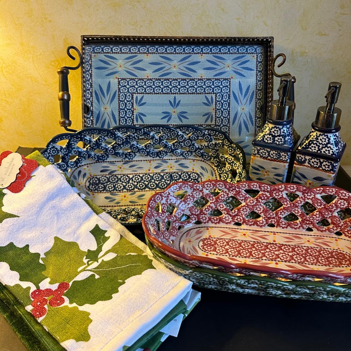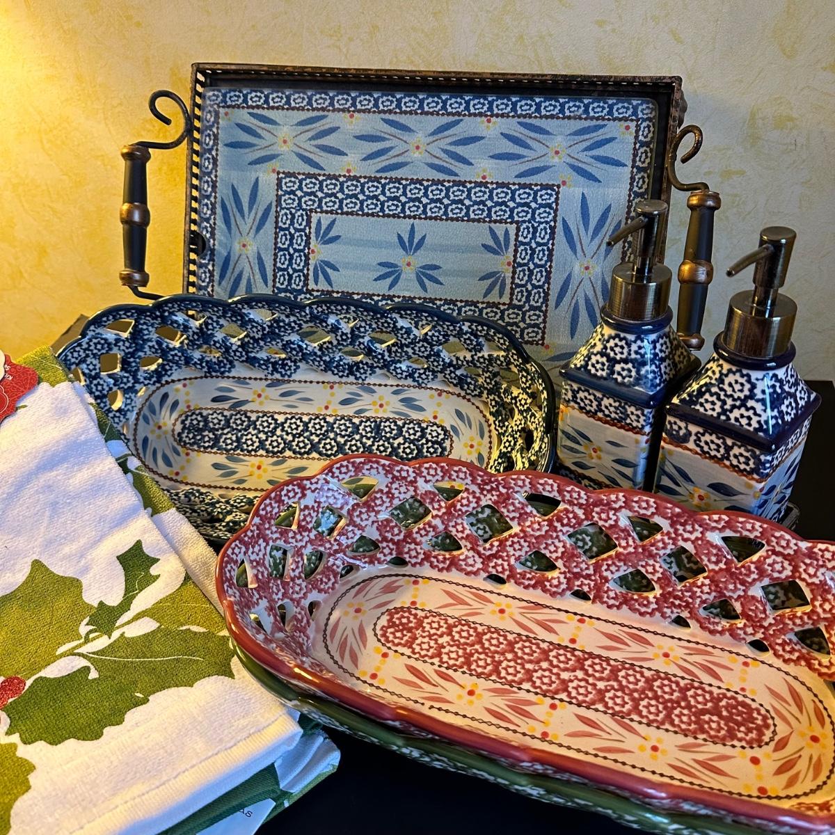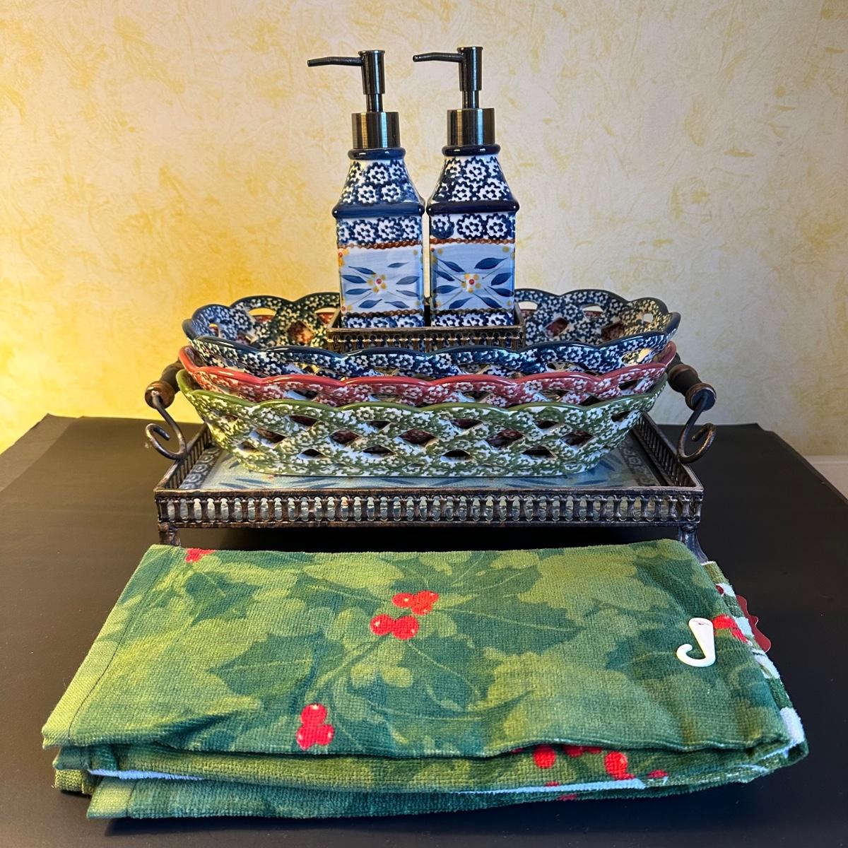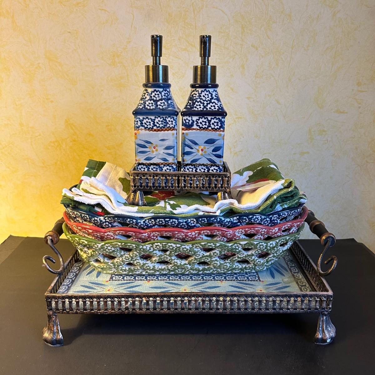 LOT 72N: Temp-tations 6 Piece set - Old World Bread Baskets, Serving Tray, Soap Dispenser And Towels