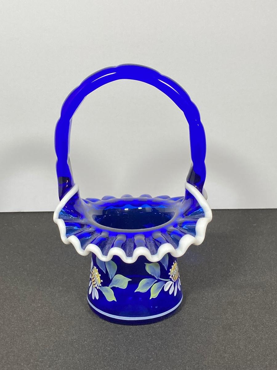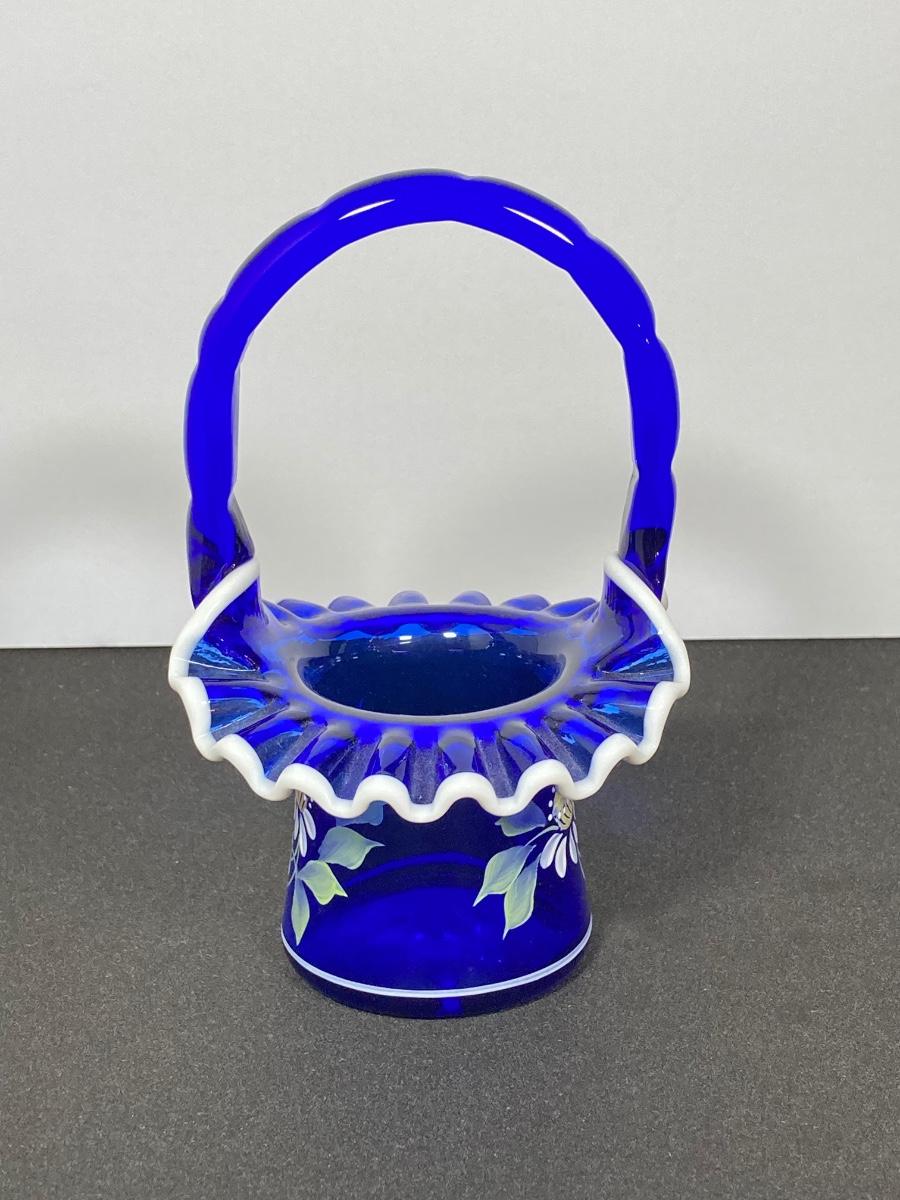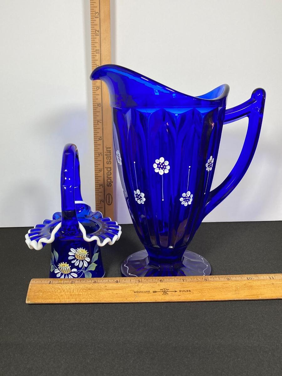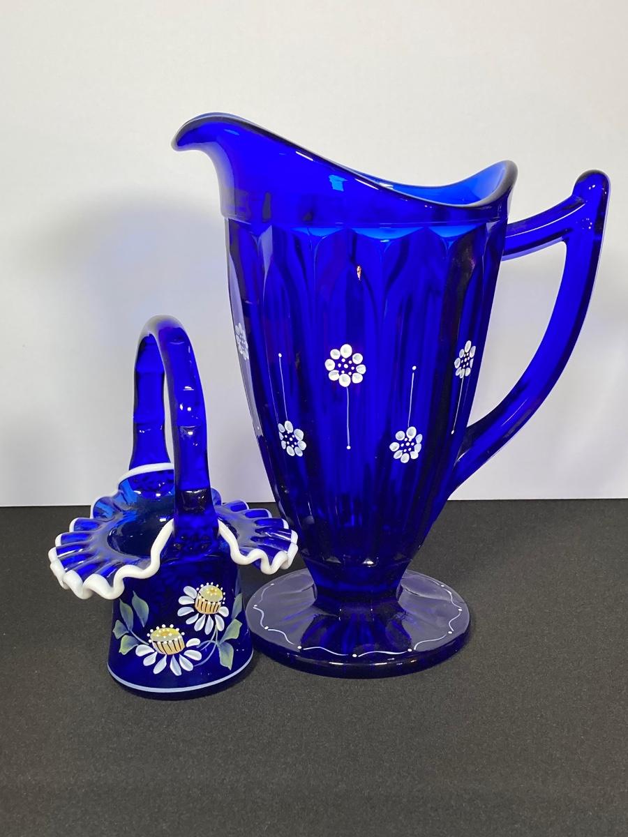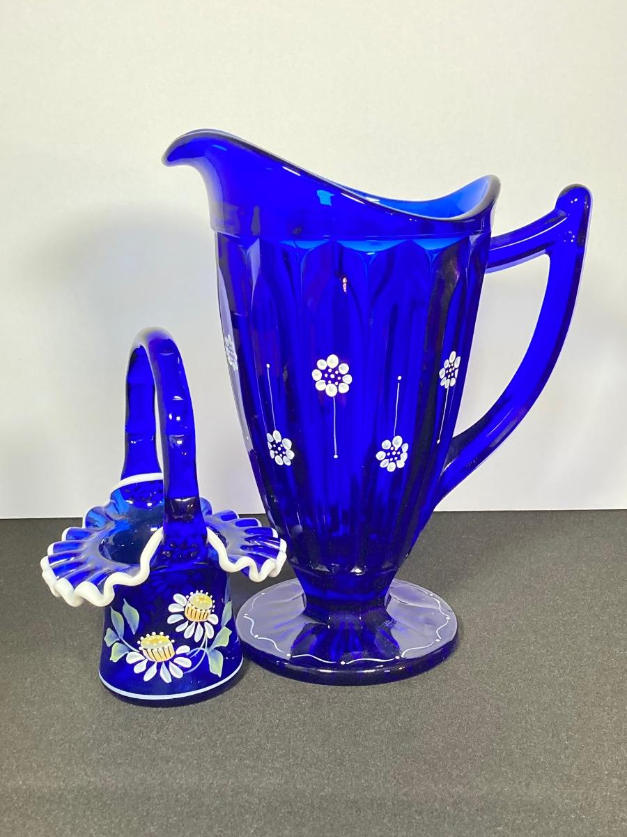 LOT 127J: Fenton - Large Cobalt Blue Pitcher and Basket with Flowers