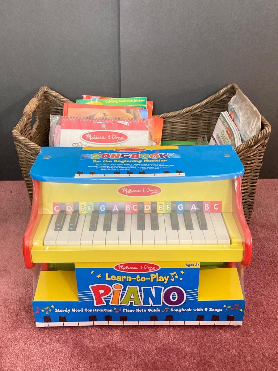 LOT 135J: Melissa & Doug's Learn to Play Piano with Basket Full of Children's Books and More