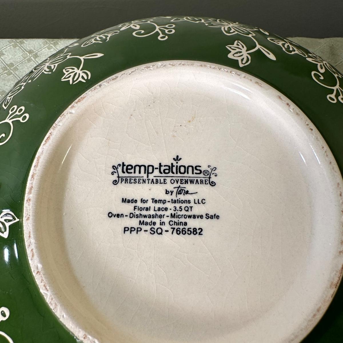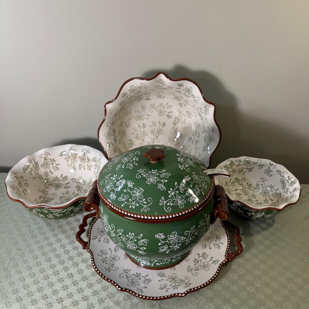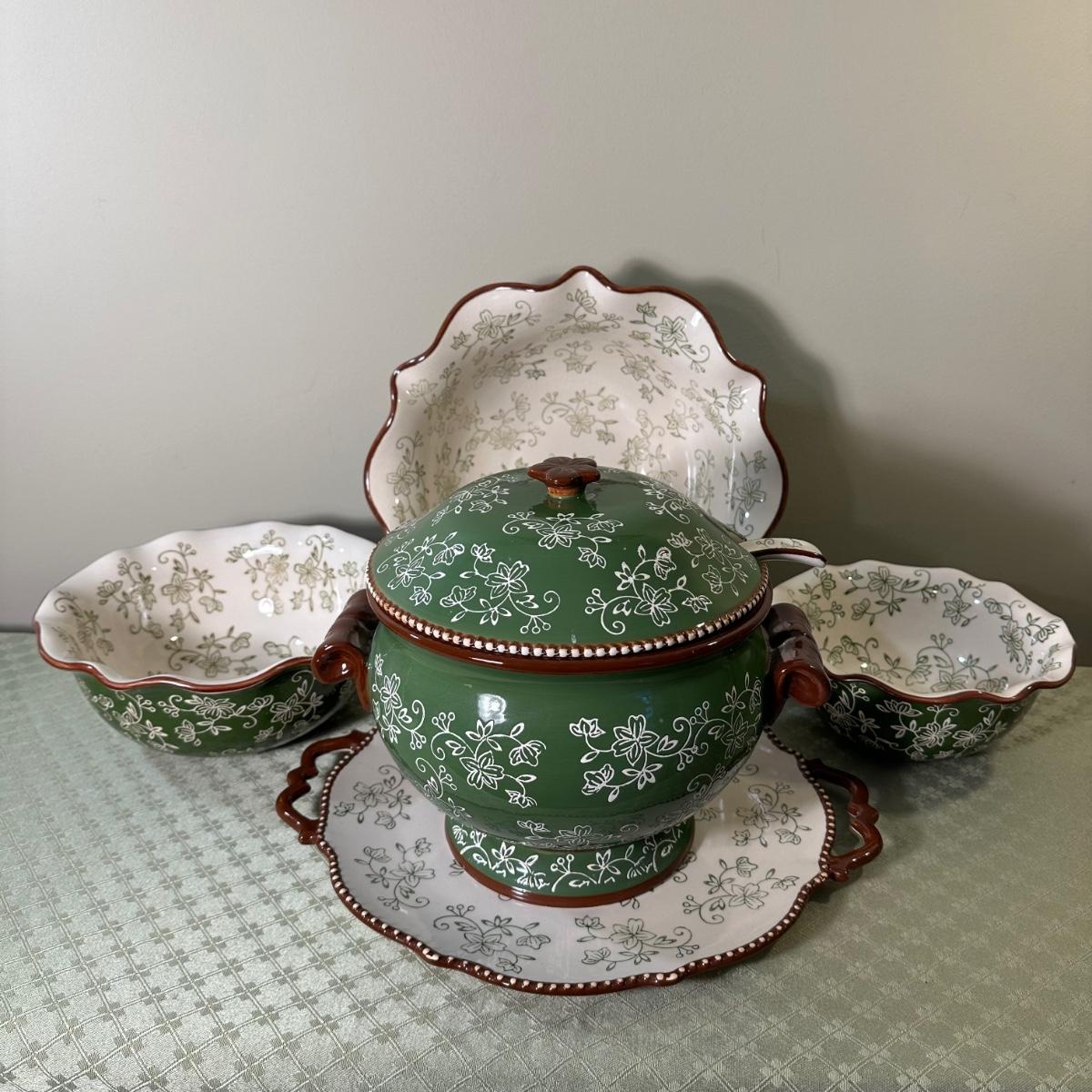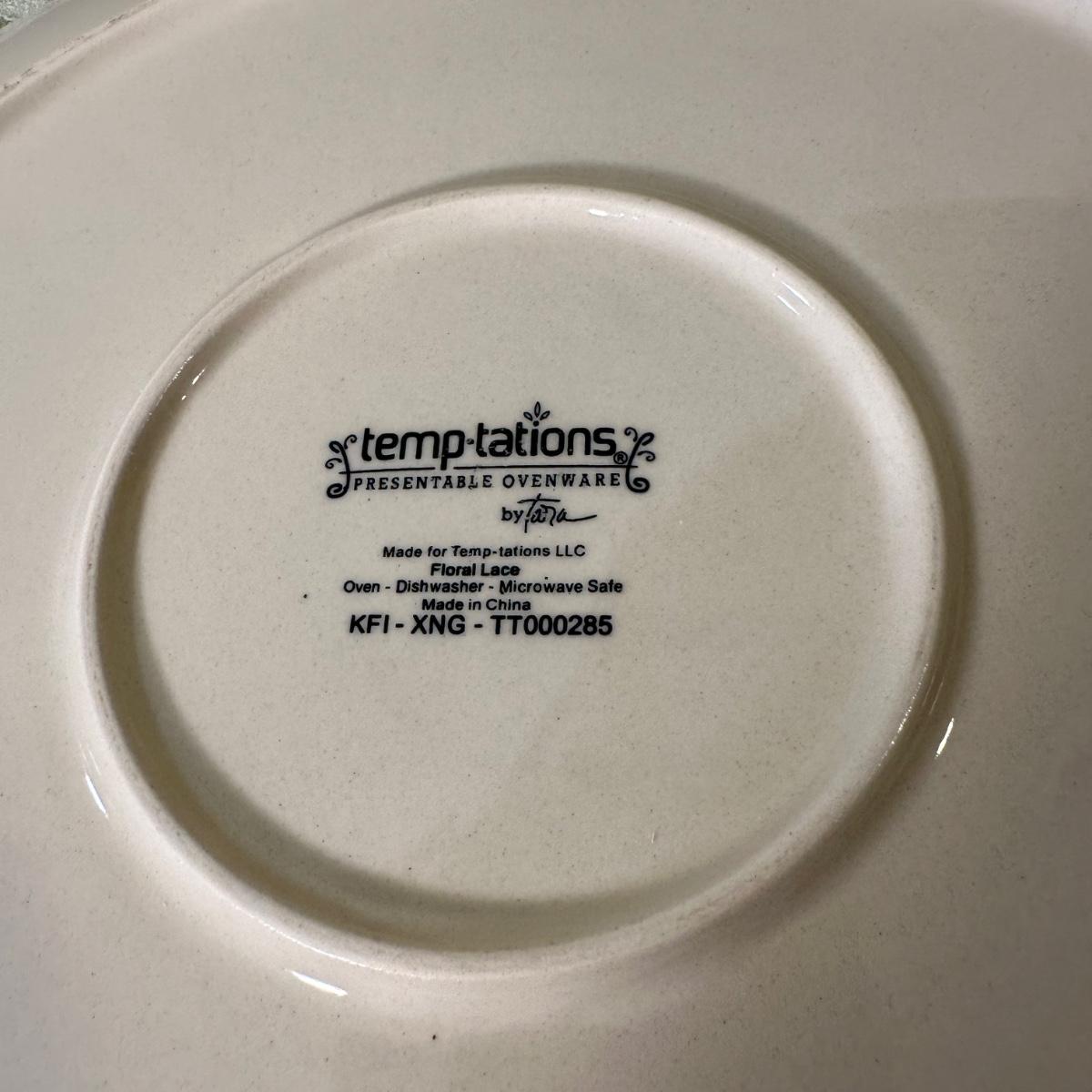 LOT 178N: Temp-tations Floral Lace 6 Piece Set - Cake Plate, 3 Bowls, 3qt Soup Tureen
