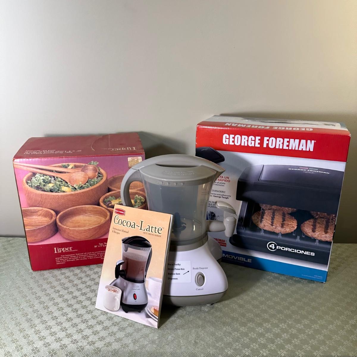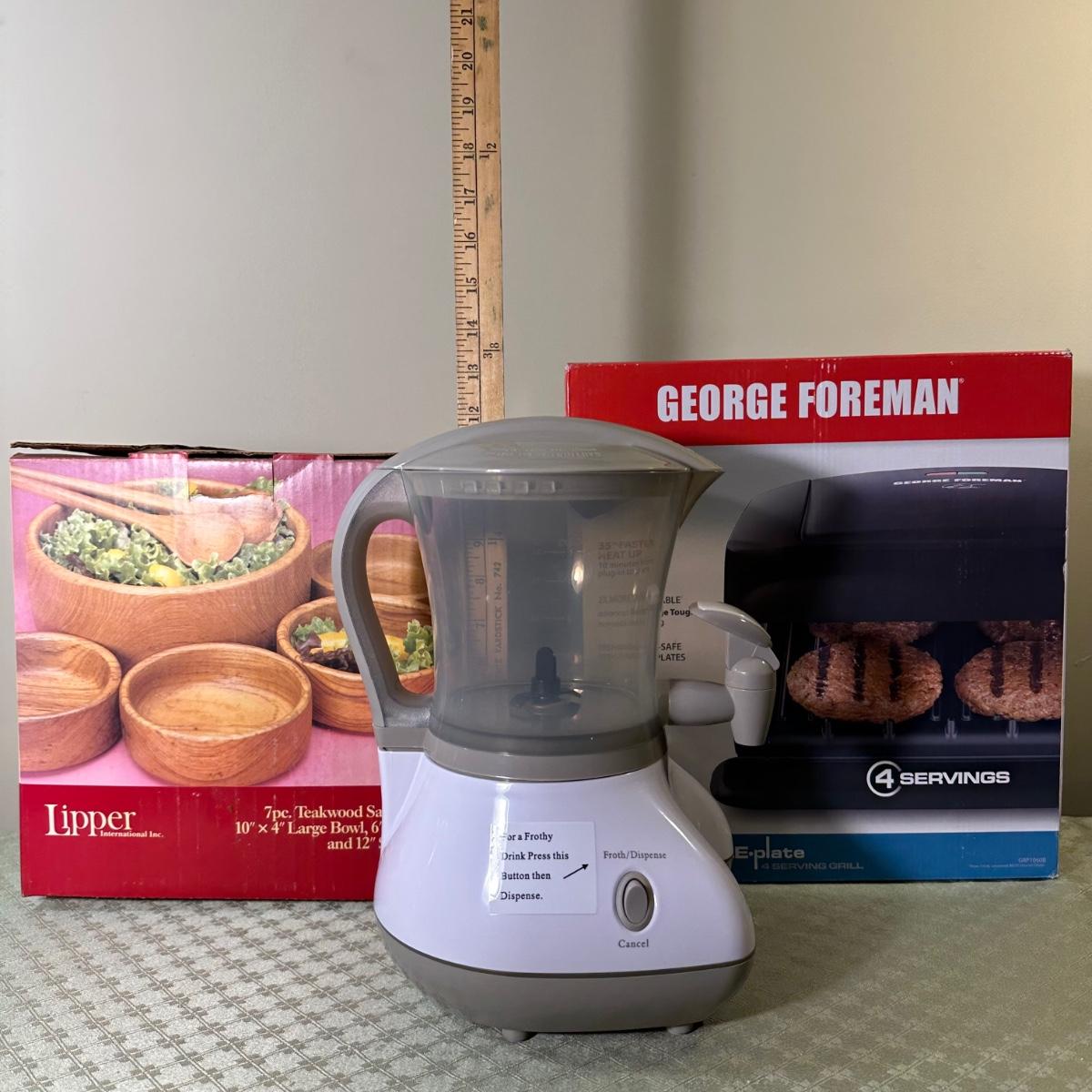 LOT 181N: Kitchen Appliences And Bowls - George Foreman Grill, Cocoa Latte, 7 Piece Wooden Bowl Set