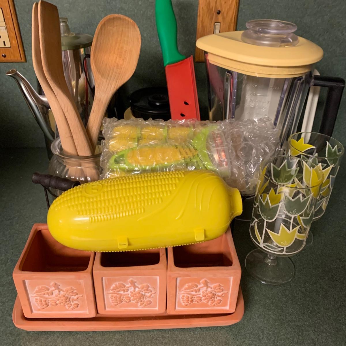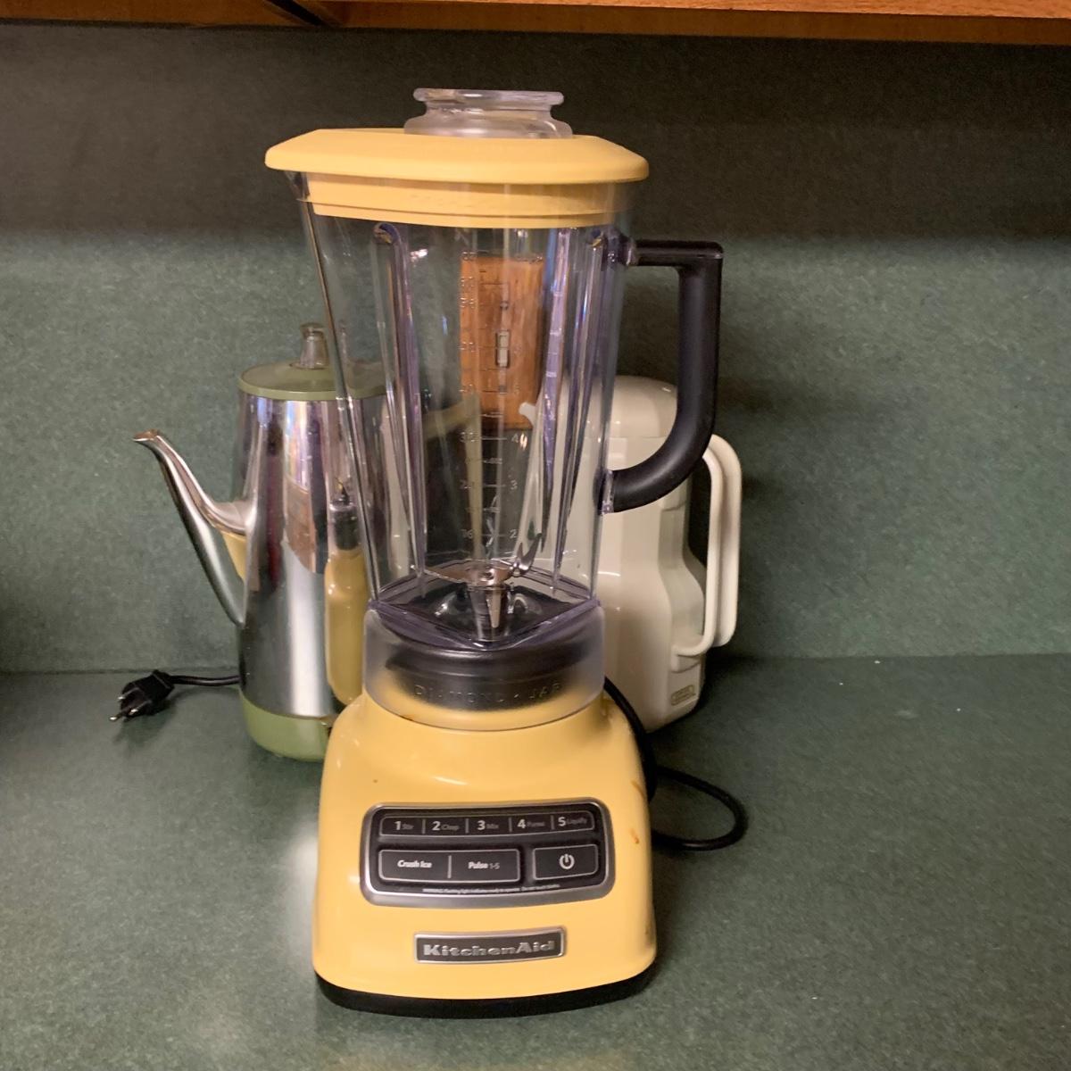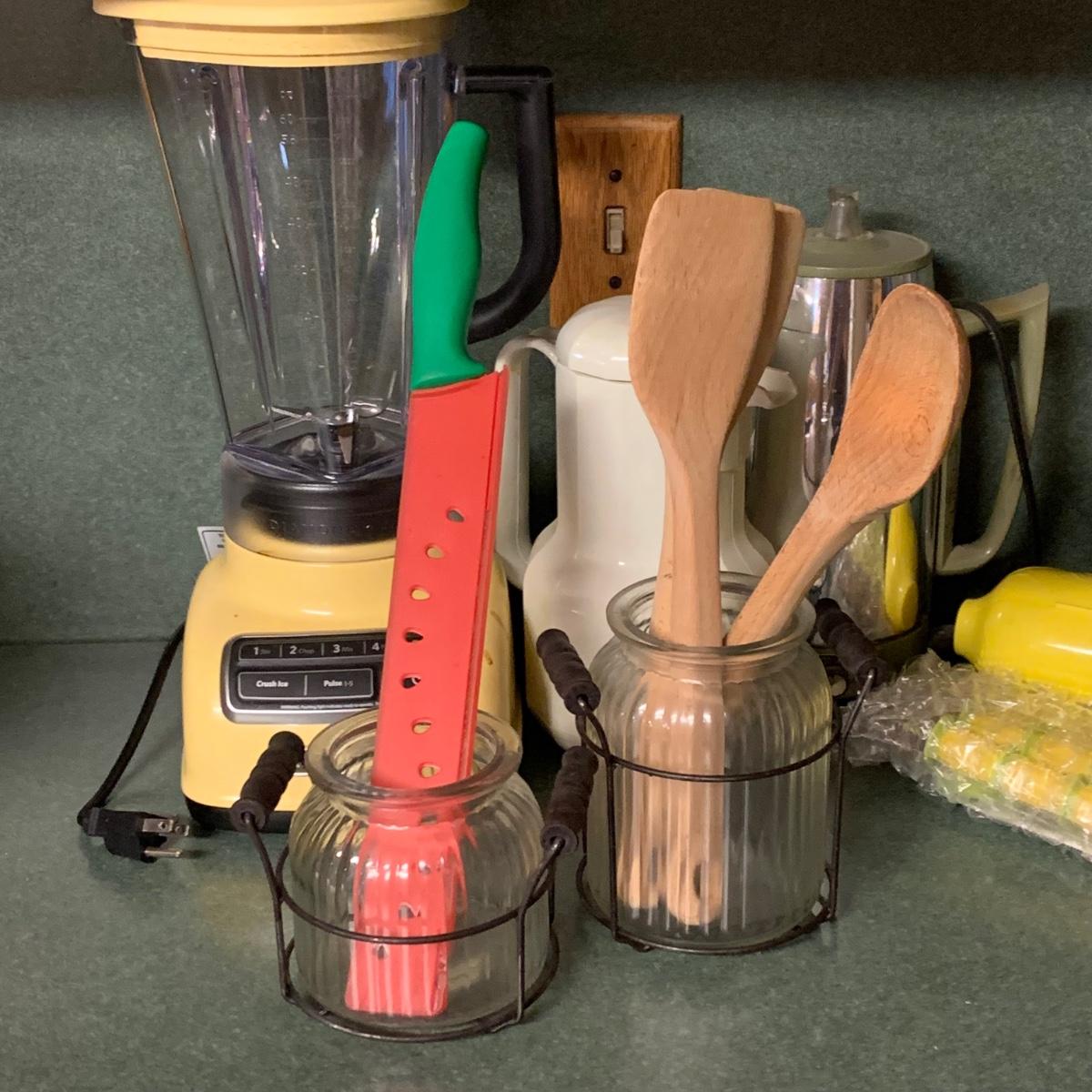 LOT 215R: Kitchen Collection: KitchenAid Blender, Corning Thermique Carafe, GE Coffee Electric Coffee Pot, Vintage Tulip Glasses & More