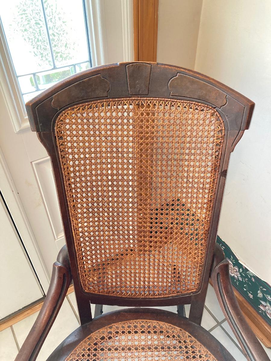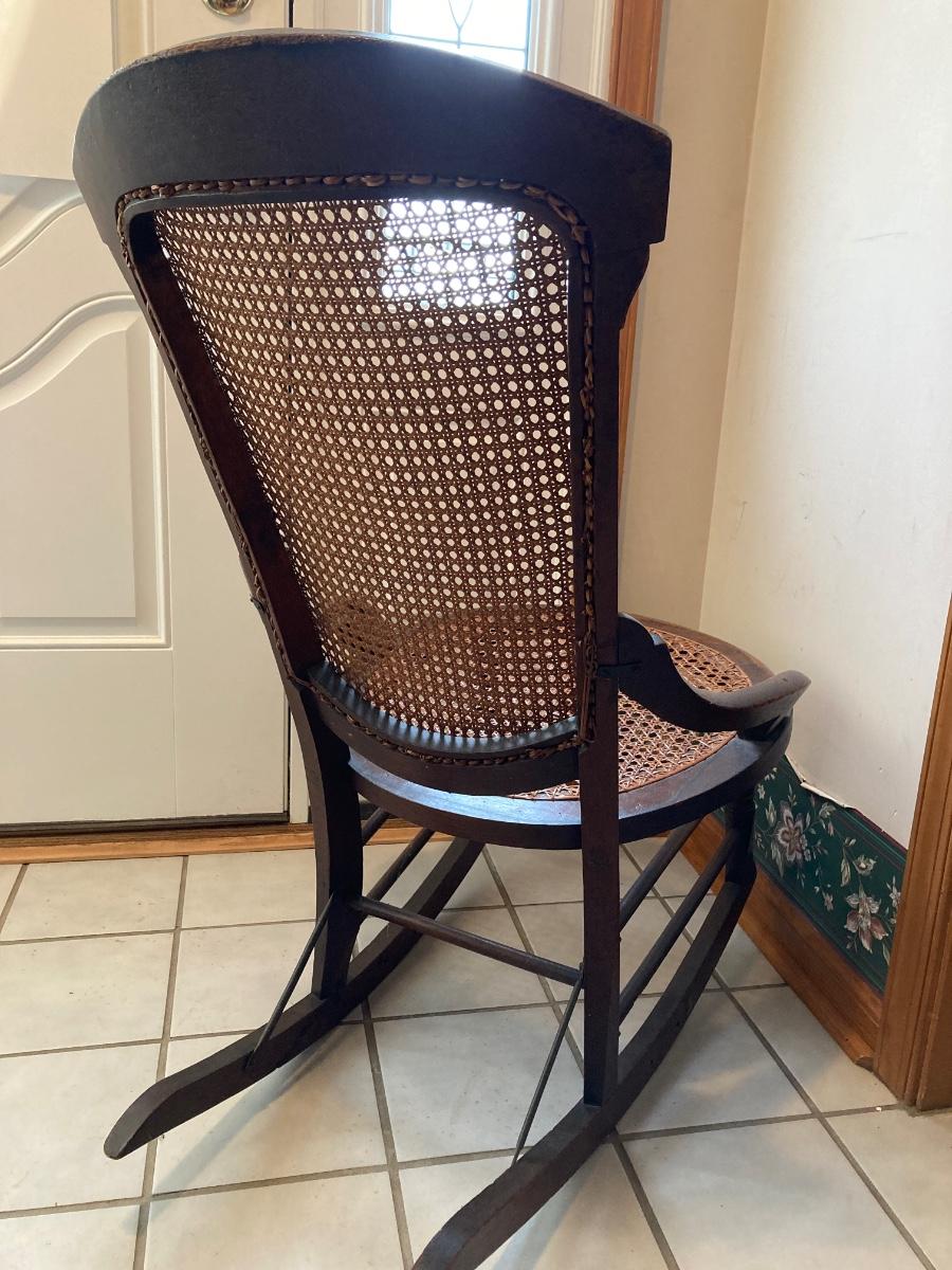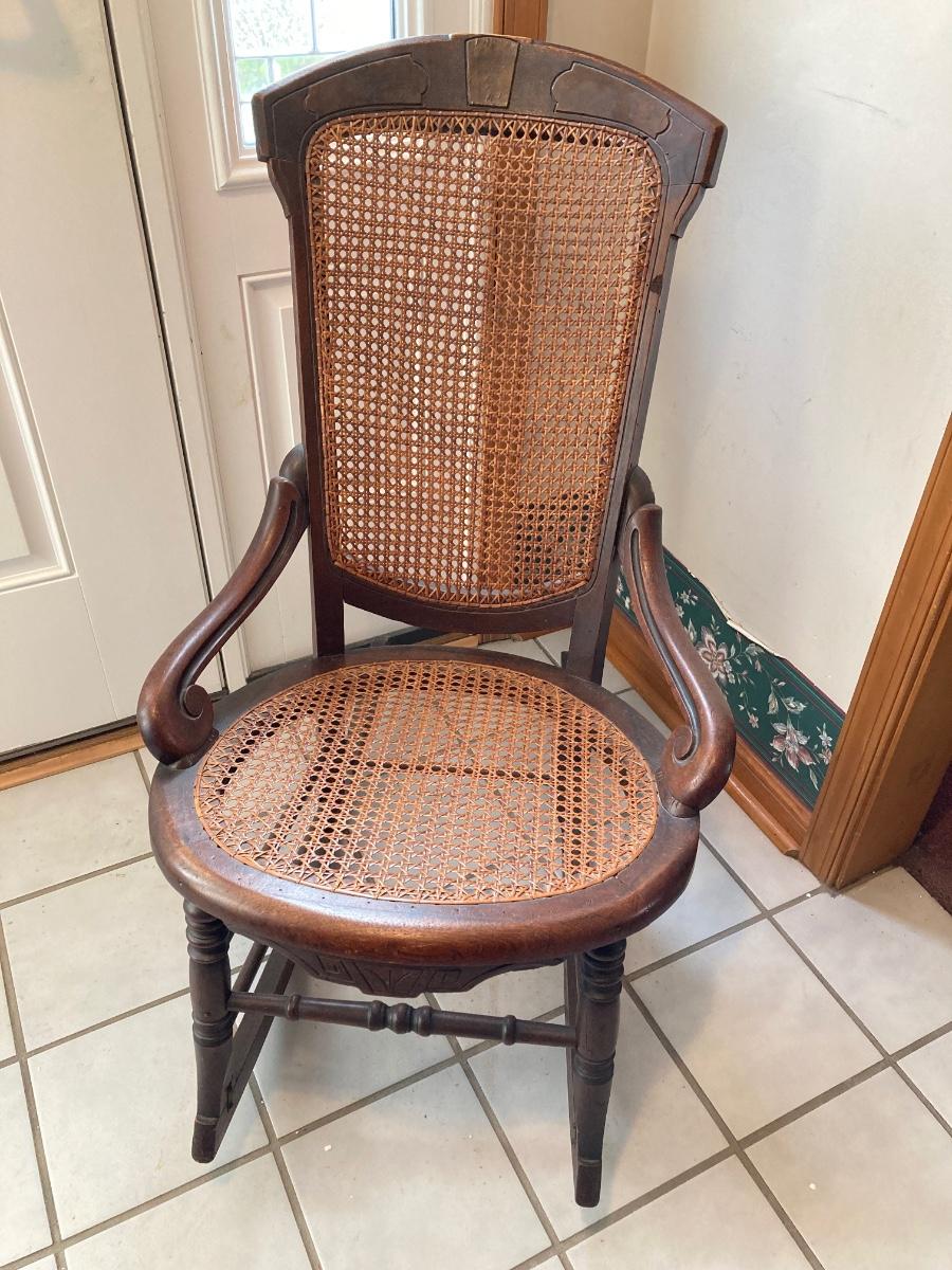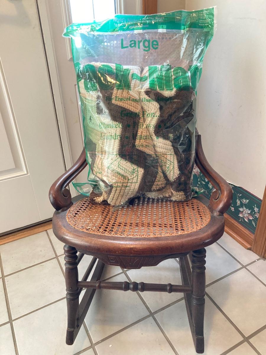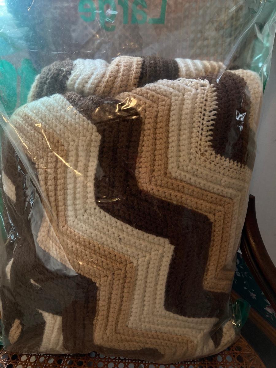 LOT 220J: Vintage Wooden Rocking Chair with Brown / Cream Colored Crocheted Blanket