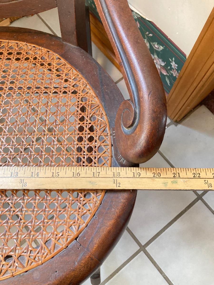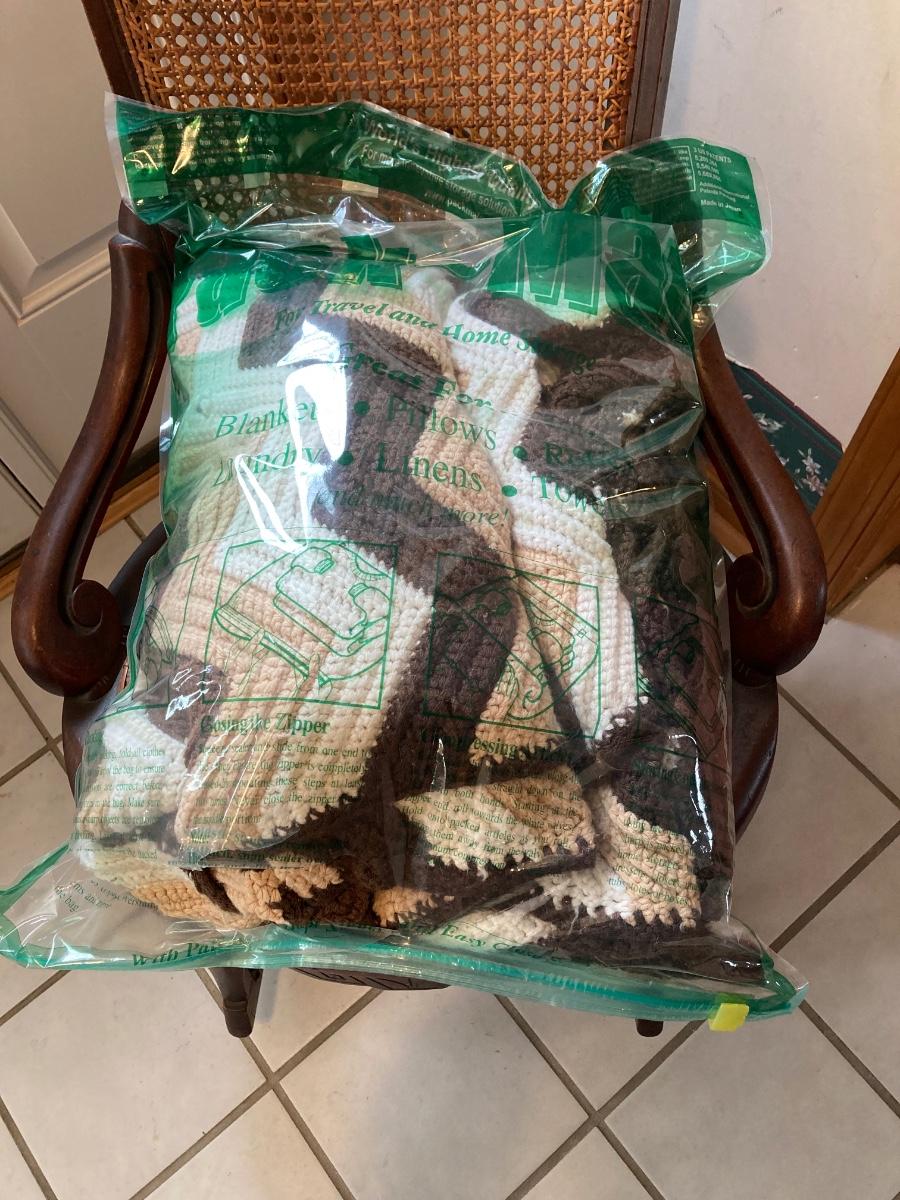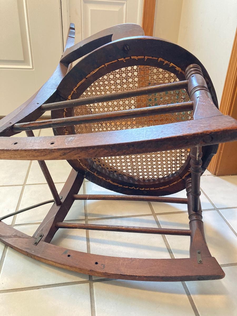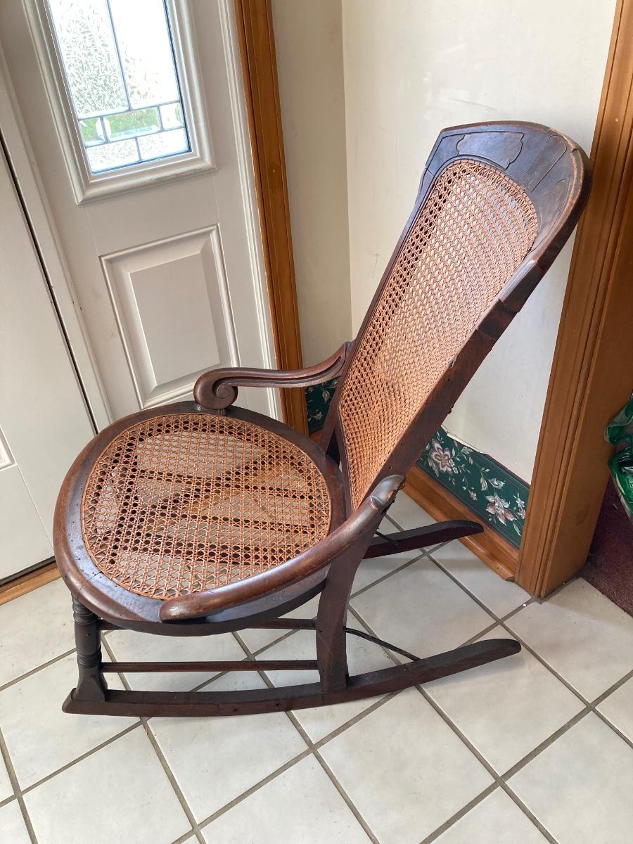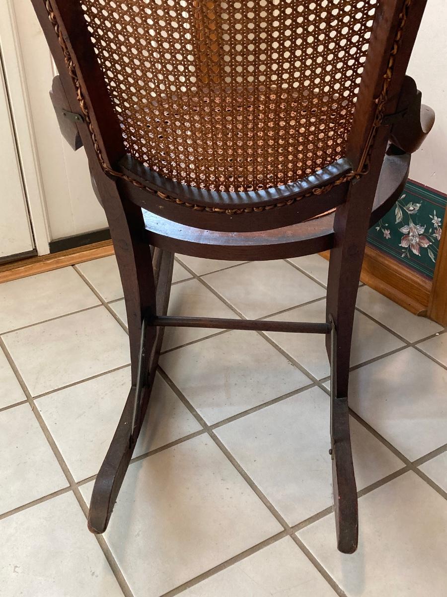 LOT 220J: Vintage Wooden Rocking Chair with Brown / Cream Colored Crocheted Blanket