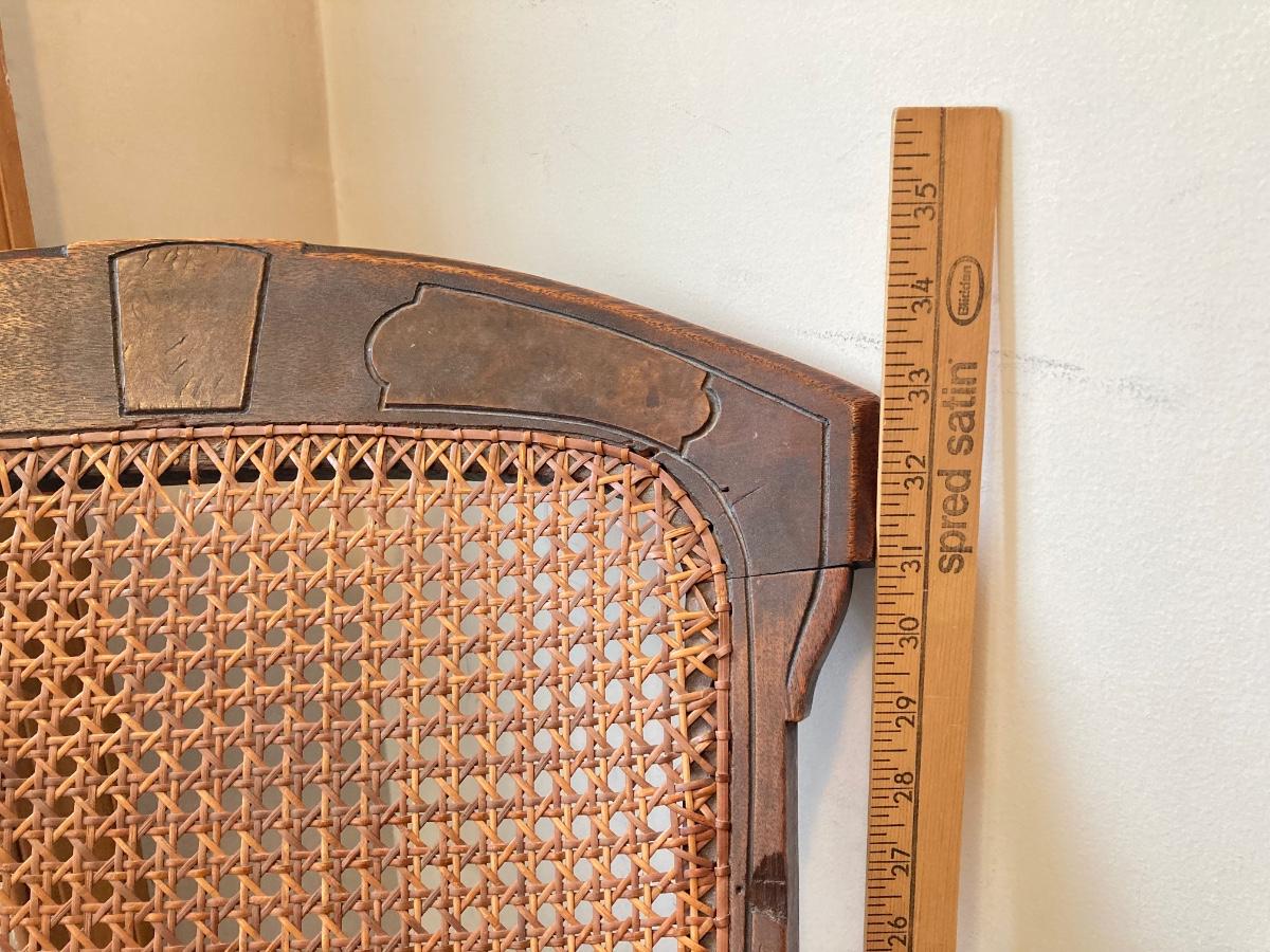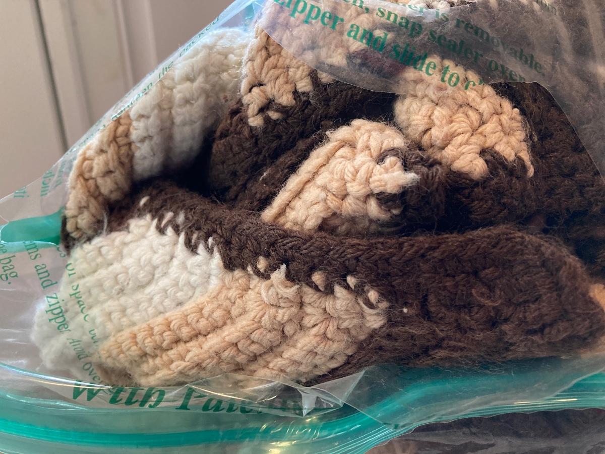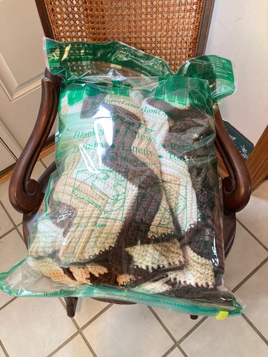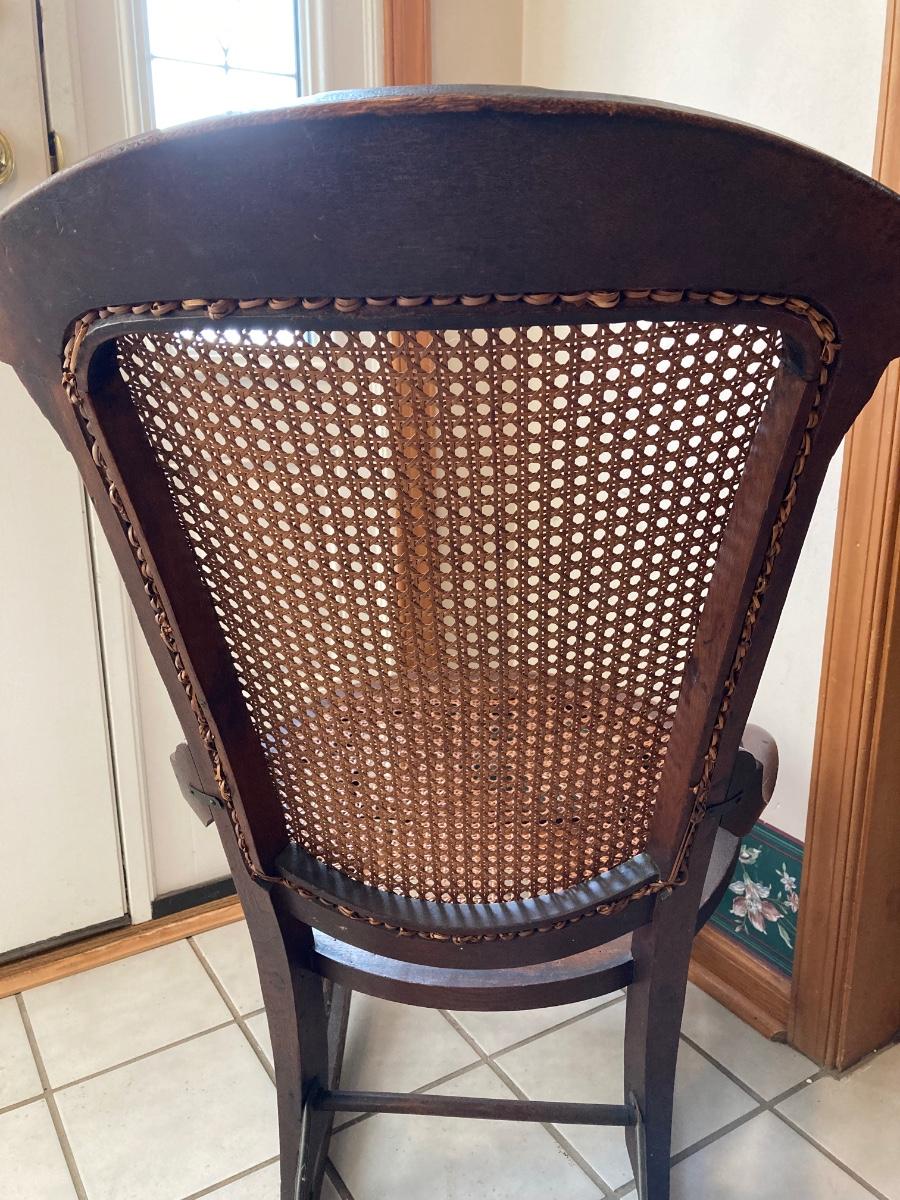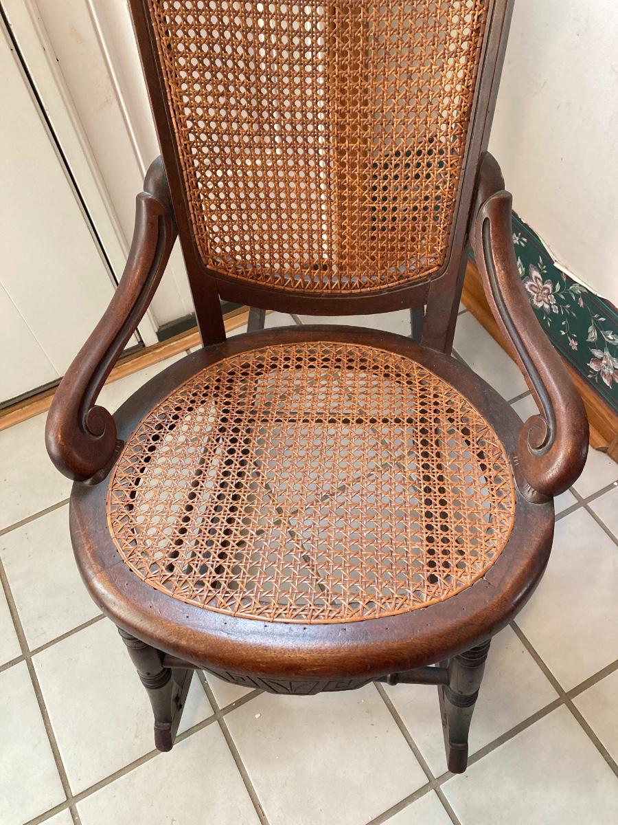 LOT 220J: Vintage Wooden Rocking Chair with Brown / Cream Colored Crocheted Blanket