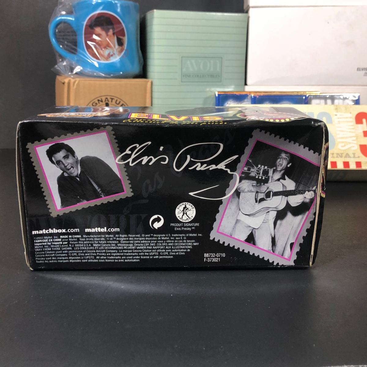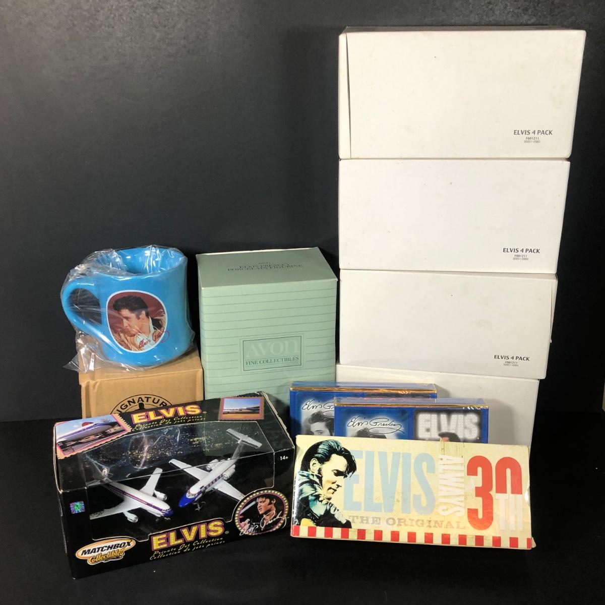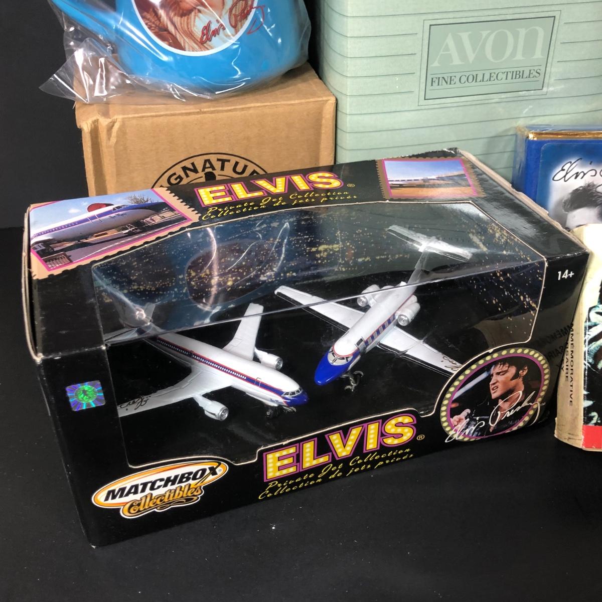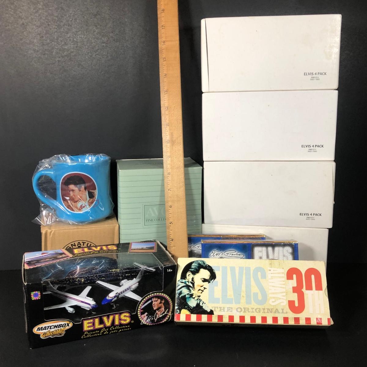 LOT 14L: Elvis Presley Collection - Matchbox Private Jets, 30th Anniversary Commemorative Watch, Velour Playing Cards, Mug, 1987  Avon Porcelain Figurine & 4-Pack Matchbox Sets (4 Sealed Boxes)