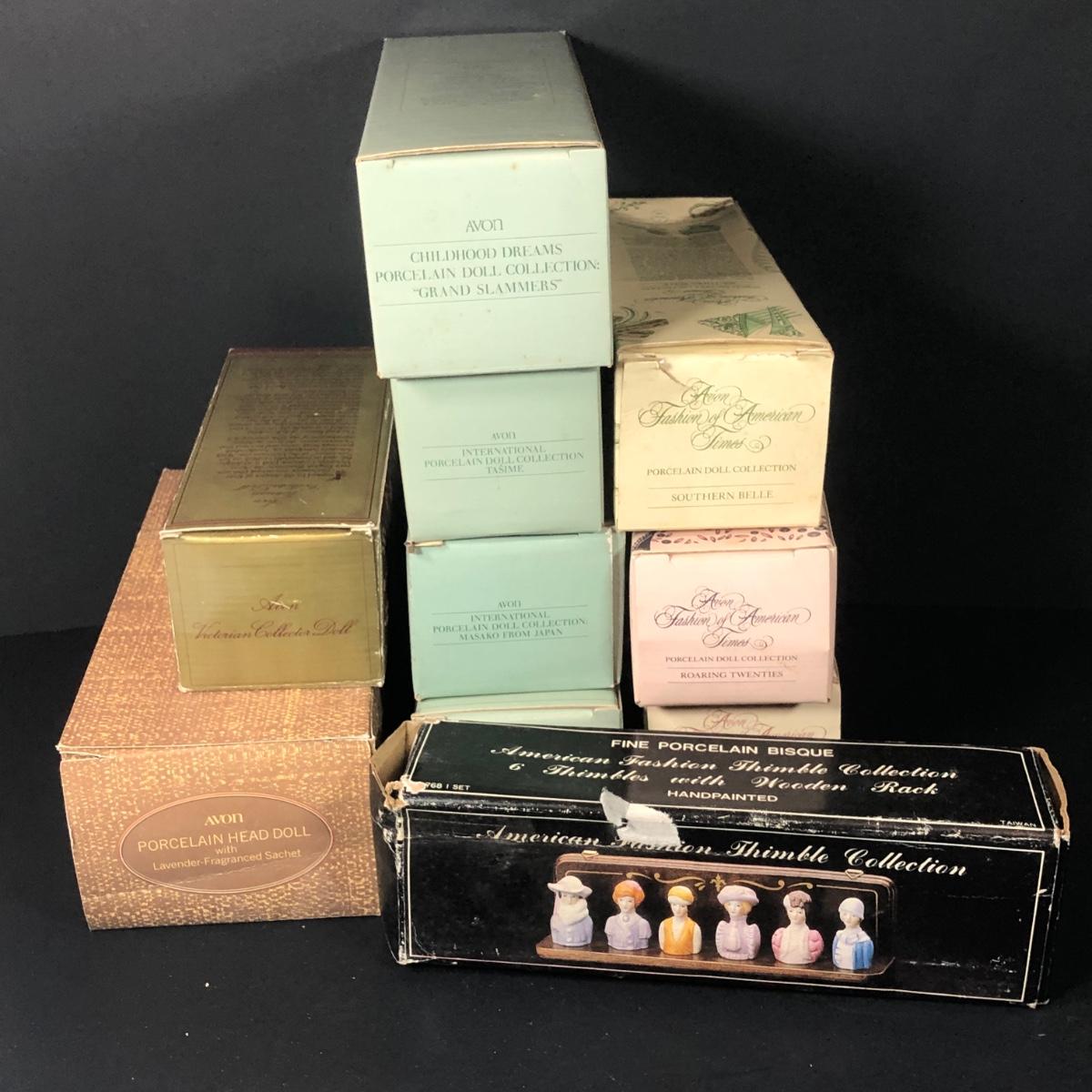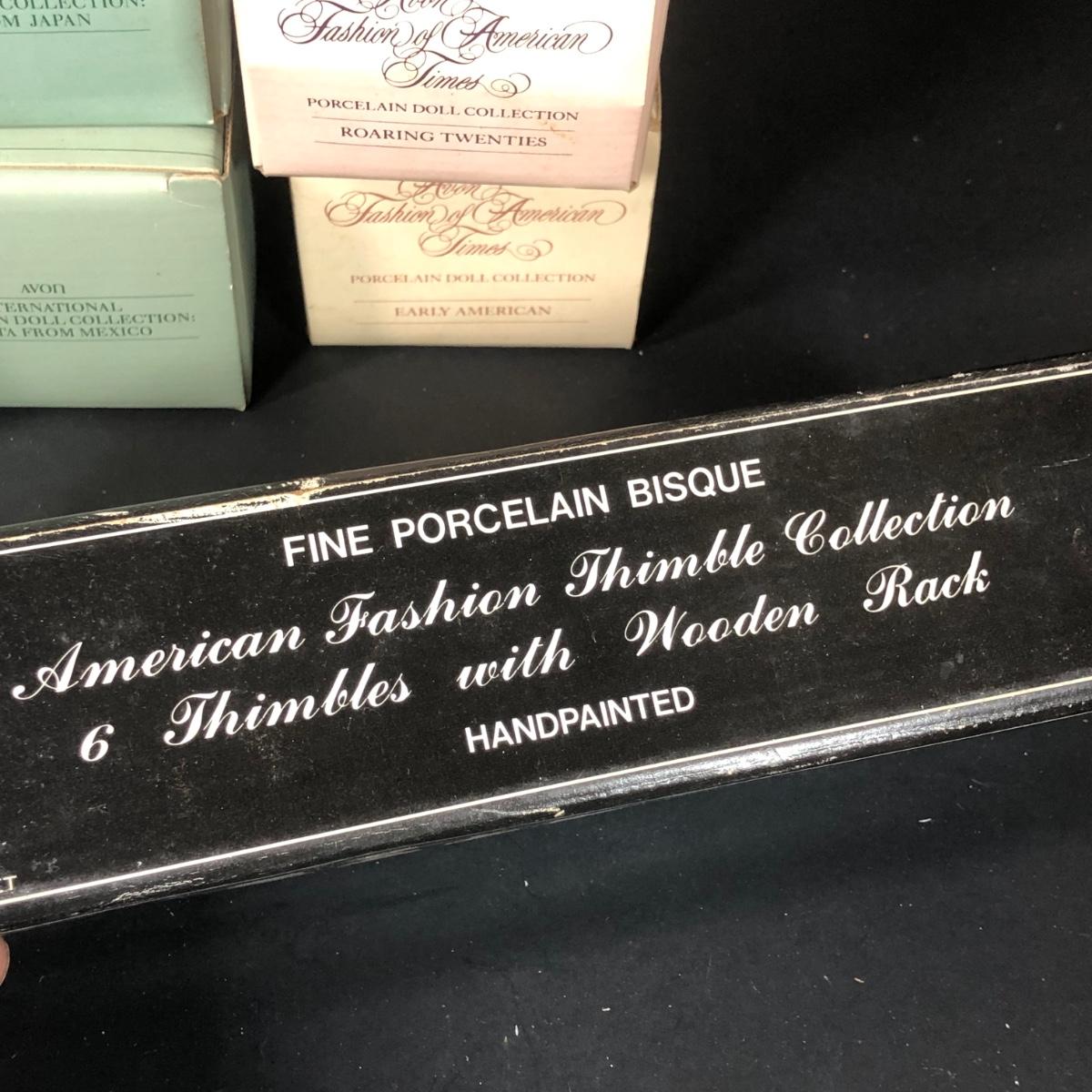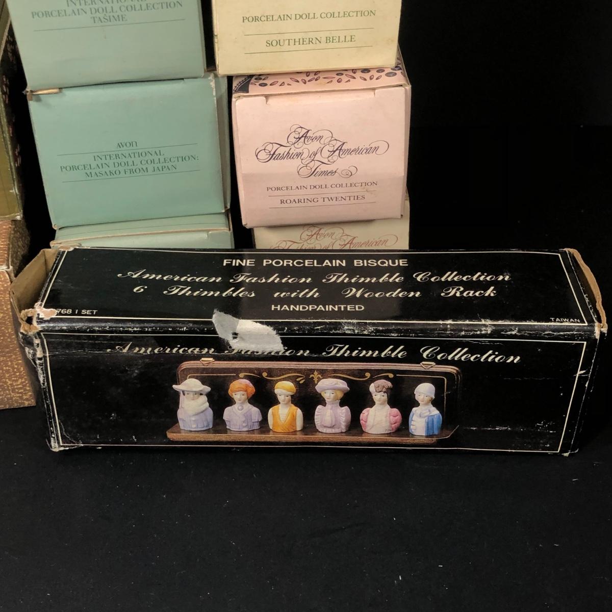 LOT 23L: American Fashion Porcelain Thimble Collection & Avon Porcelain Dolls - Fashion of American Times, International, Childhood Dreams, Victorian Doll & American Heirloom Doll