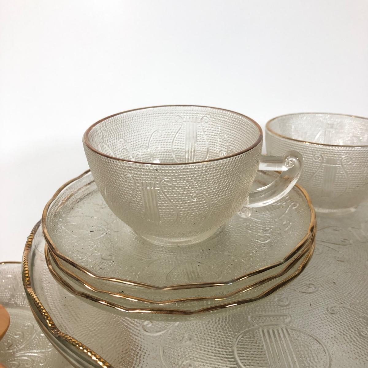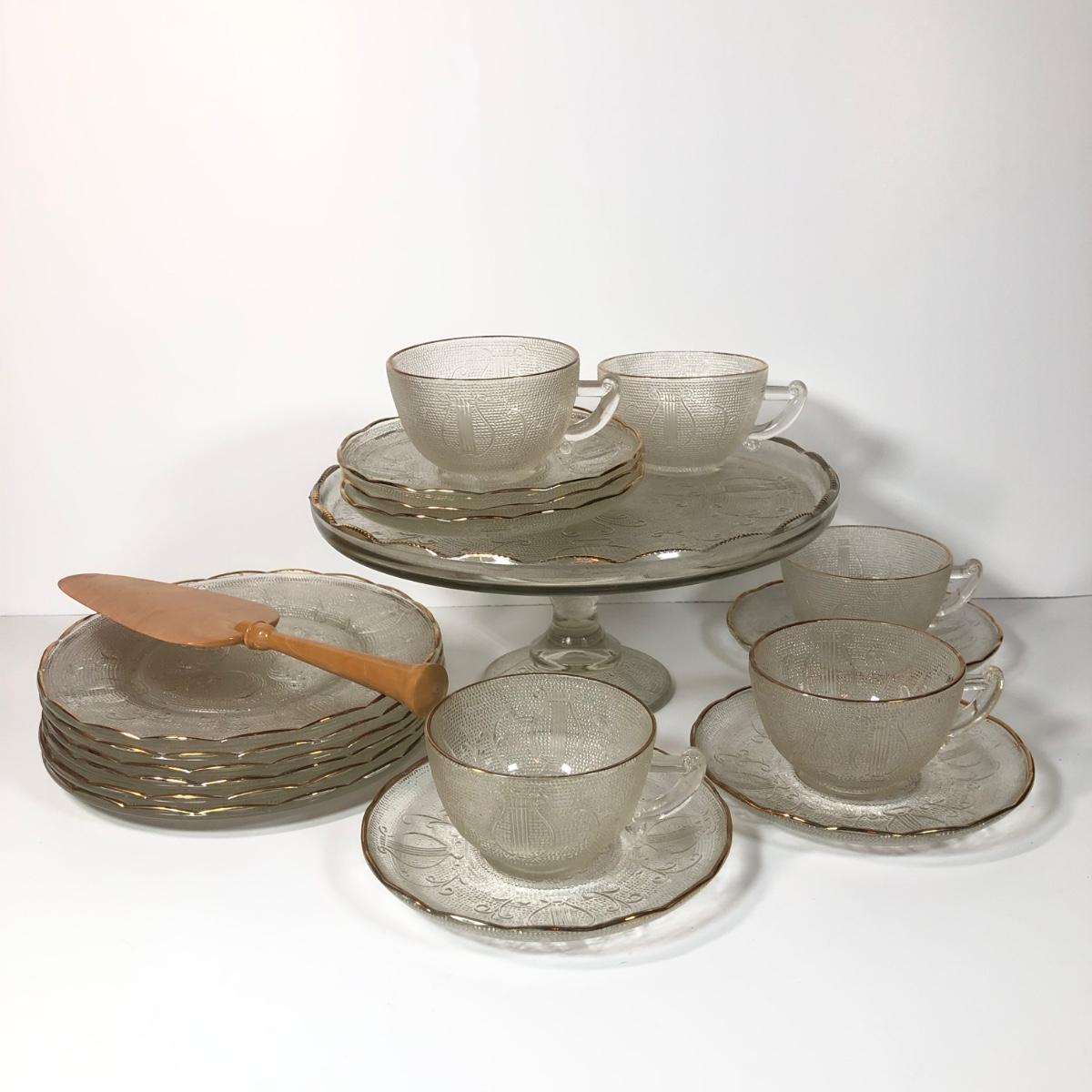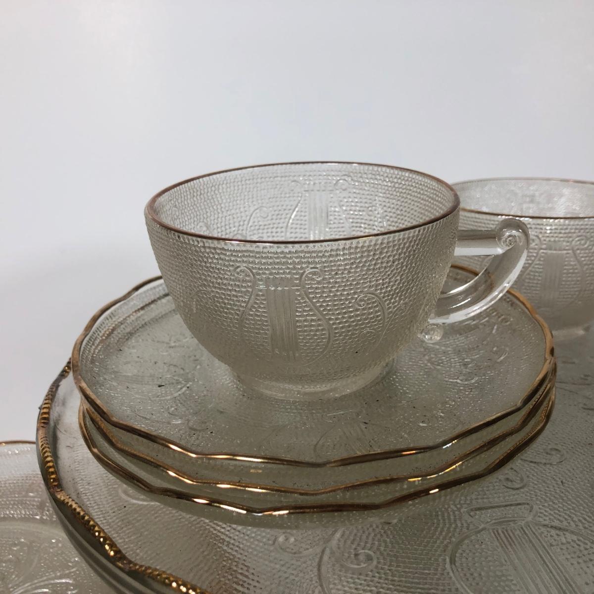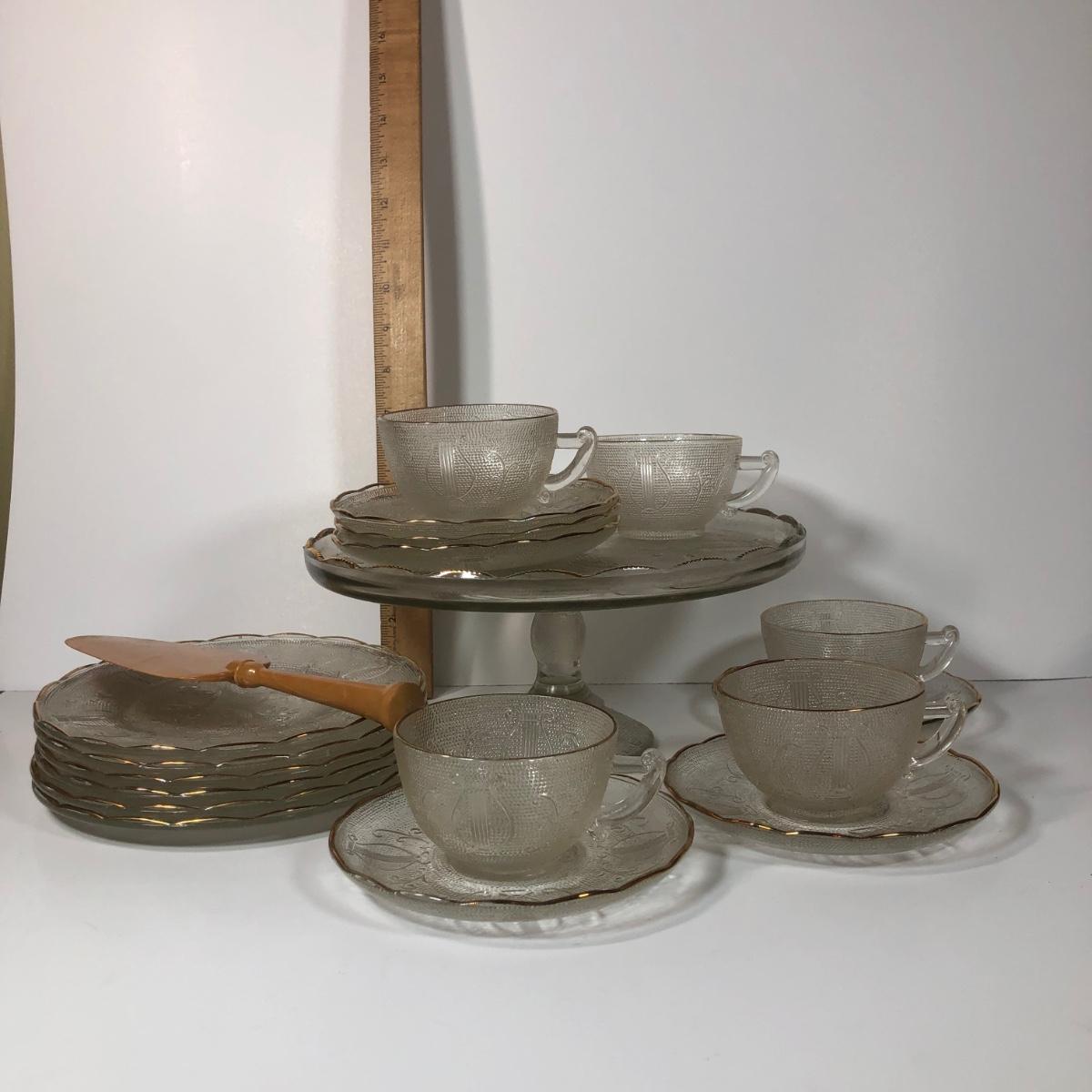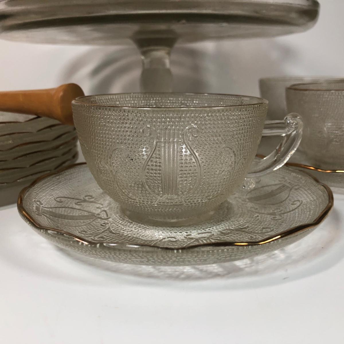 LOT 25L: Vintage Jeannette Harp Glass Dish Set - Tea cups, Saucers, Cake Stand & Dessert Plates