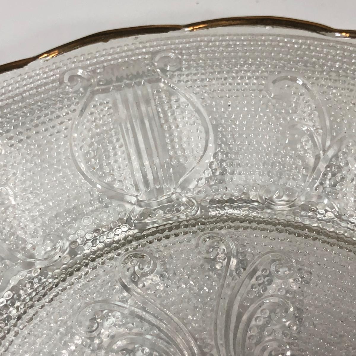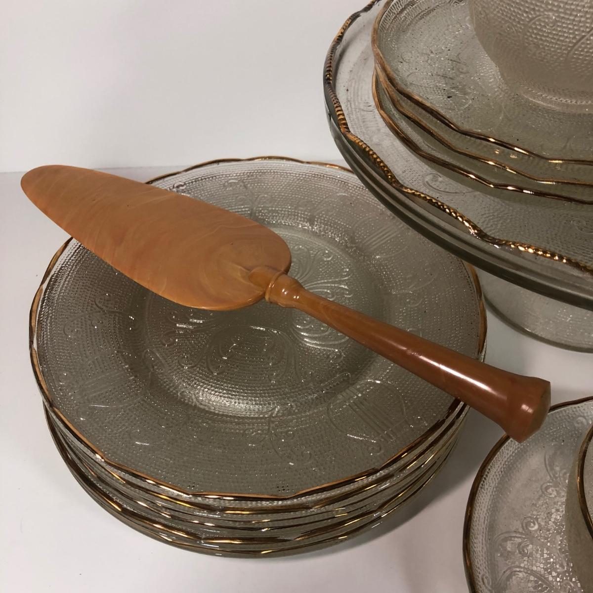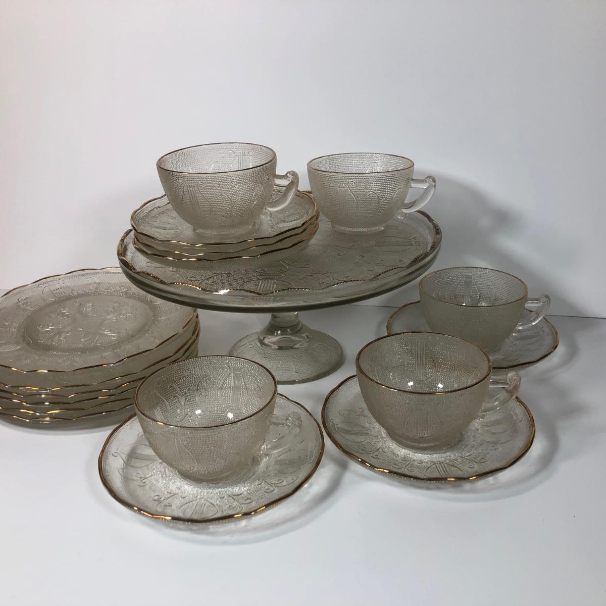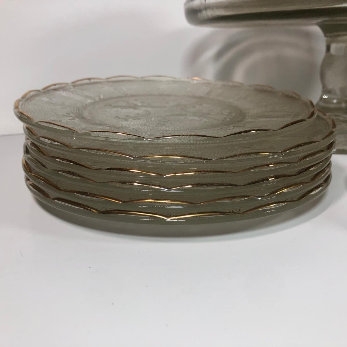 LOT 25L: Vintage Jeannette Harp Glass Dish Set - Tea cups, Saucers, Cake Stand & Dessert Plates