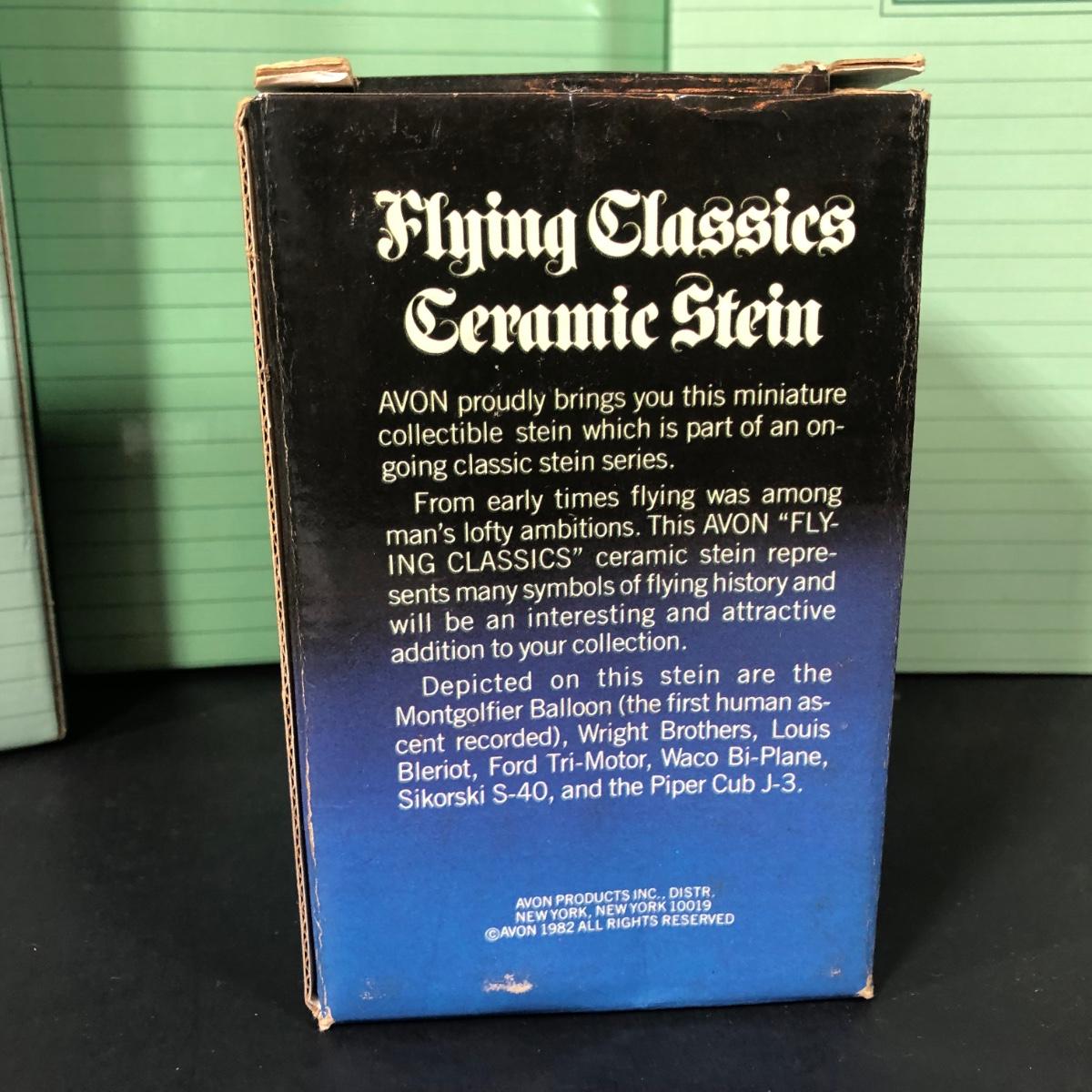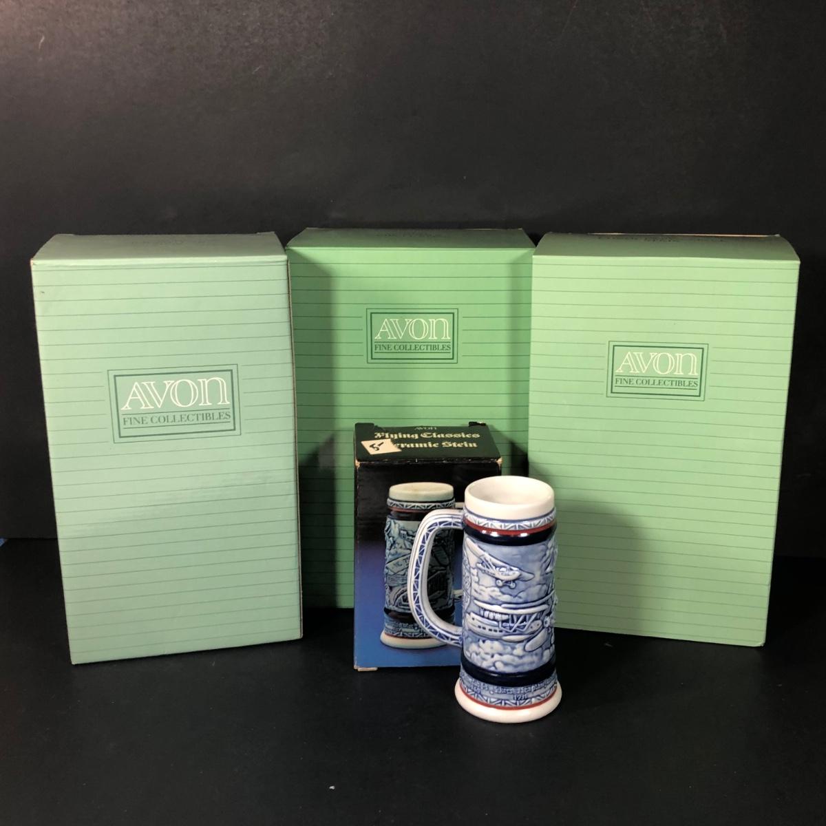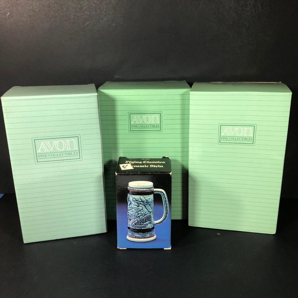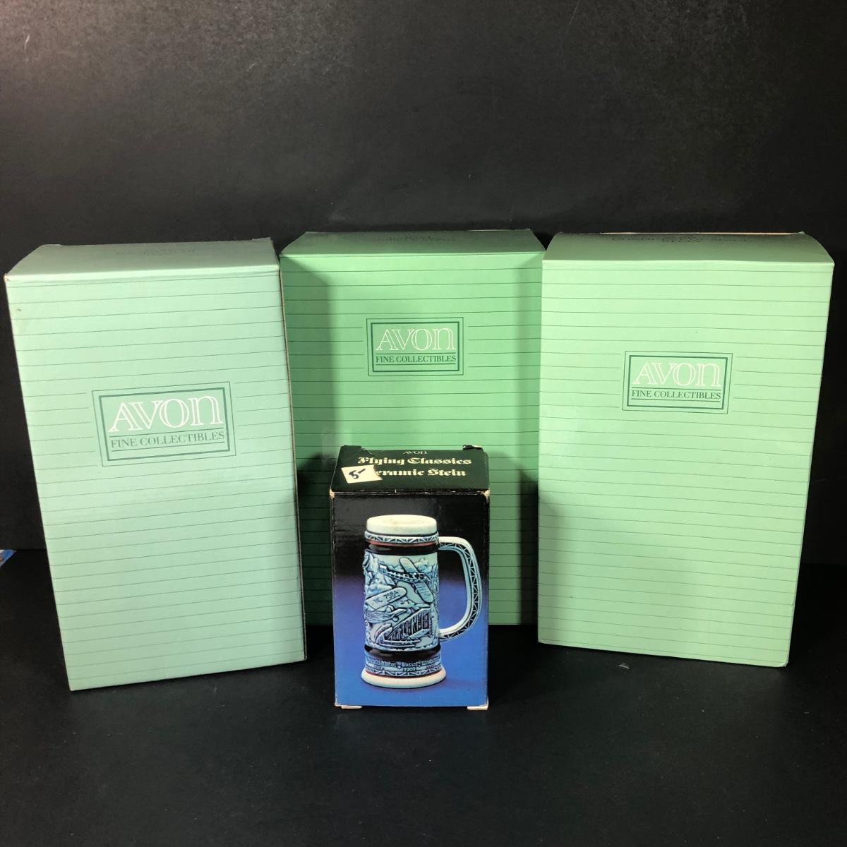 LOT 51L: Packaged Avon Steins - 1982 Flying Classics, 1989 Racing Car, 1992 Winner's Circle & 1991 Conquest of Space