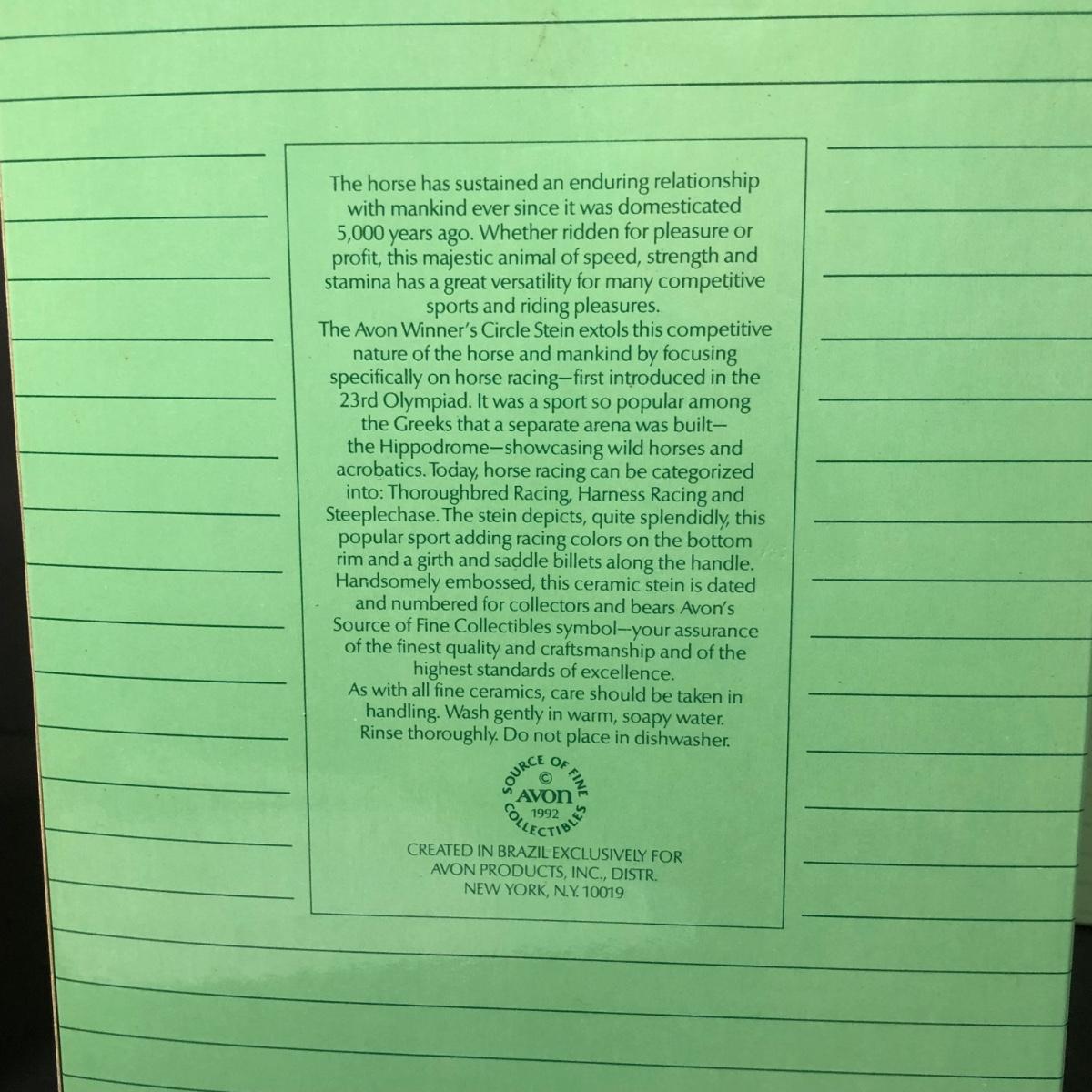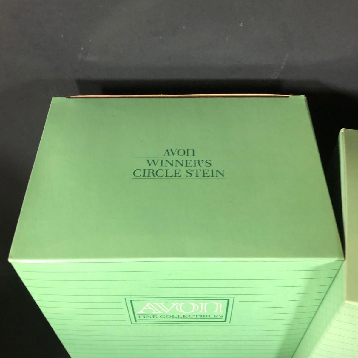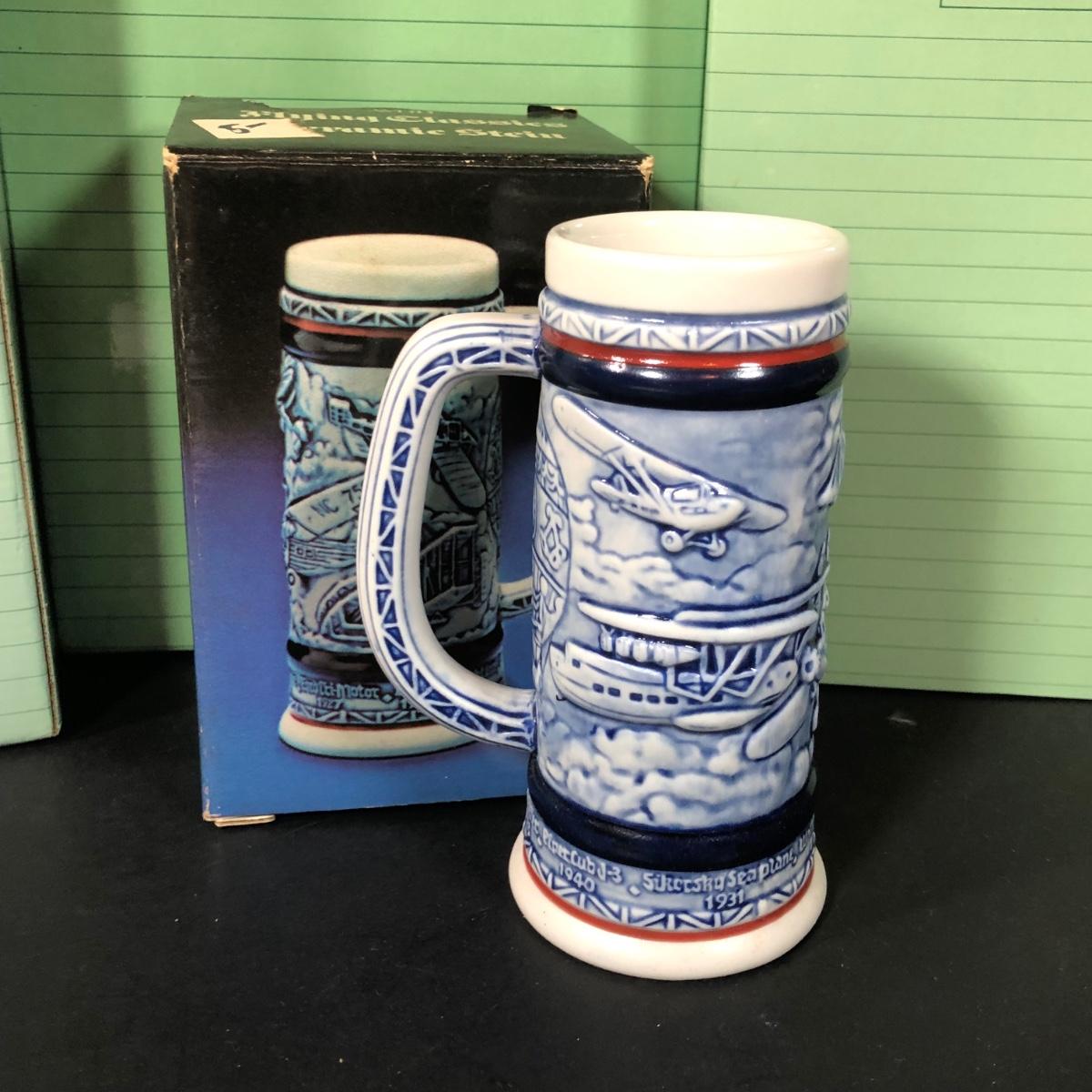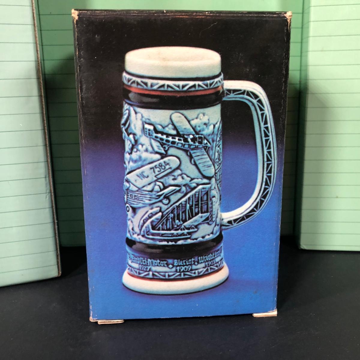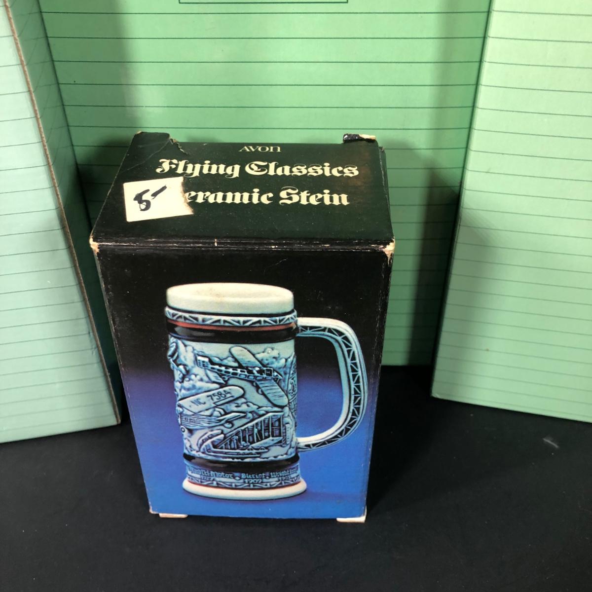 LOT 51L: Packaged Avon Steins - 1982 Flying Classics, 1989 Racing Car, 1992 Winner's Circle & 1991 Conquest of Space
