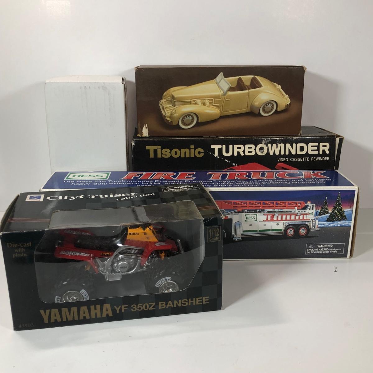 LOT 60L: Avon 1937 Ceramic Cord, 2000 Hess Firetruck, 1/12 Scale Yamaha YF 250z Banshee Model, Tisonic Turbowinder Red Car Shaped VHS Rewinder RE-7000VHS & More