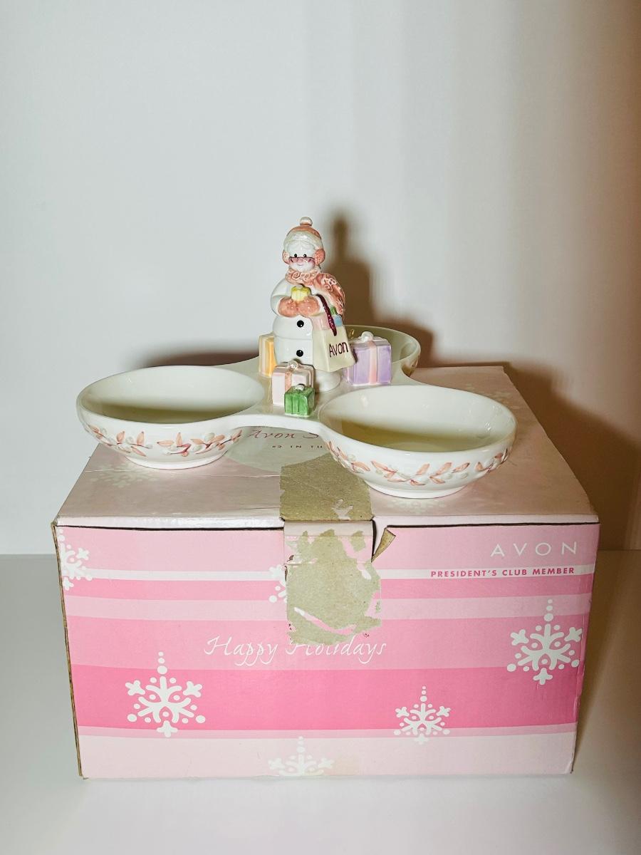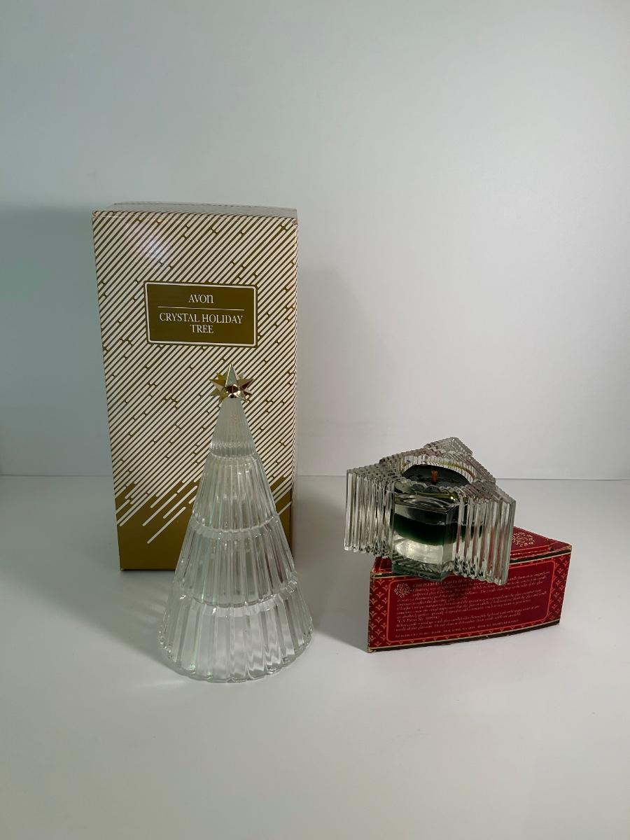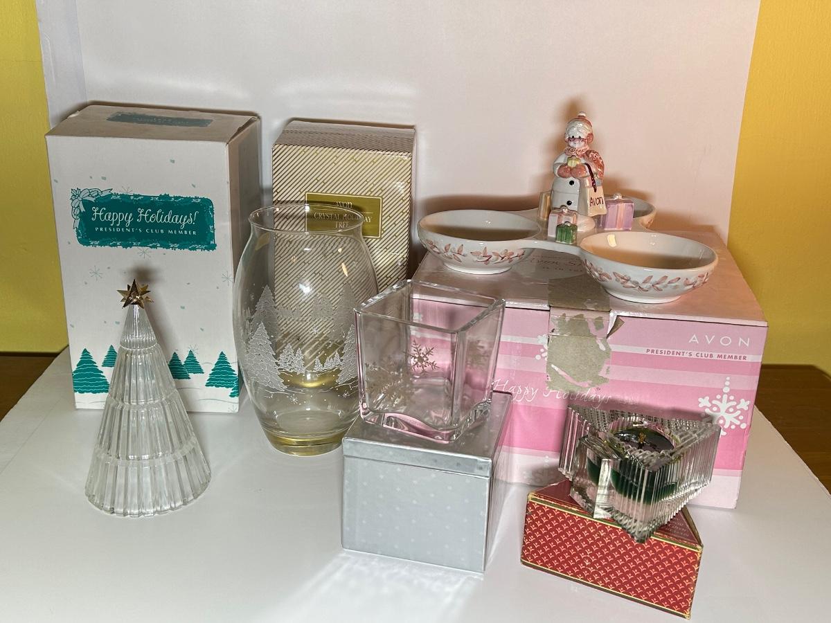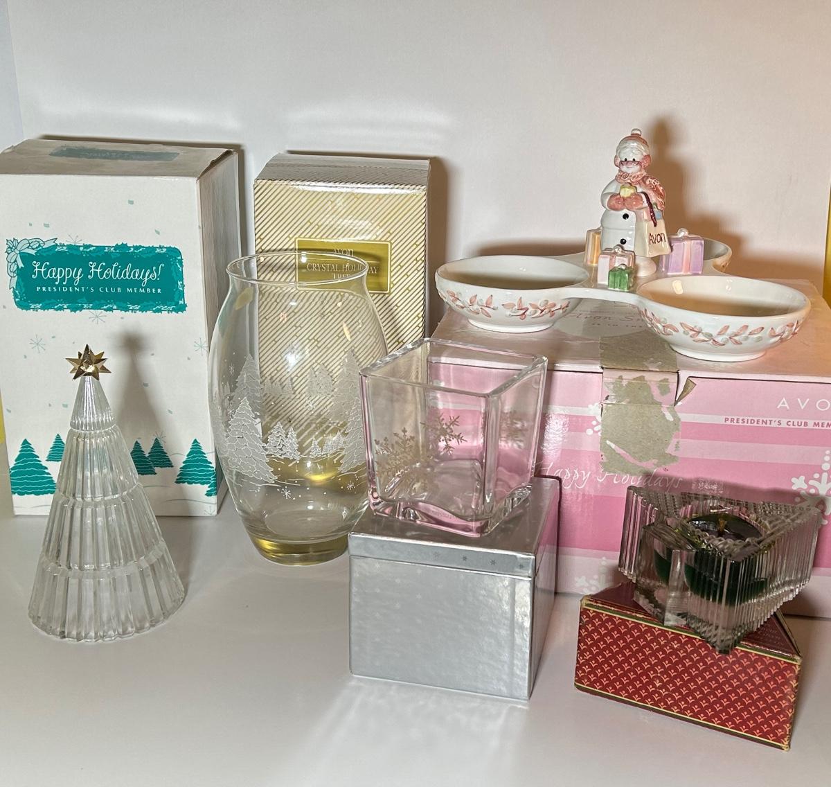 Vintage Avon Christmas decor with original boxes. Candle holders, Vase, serving dish and more