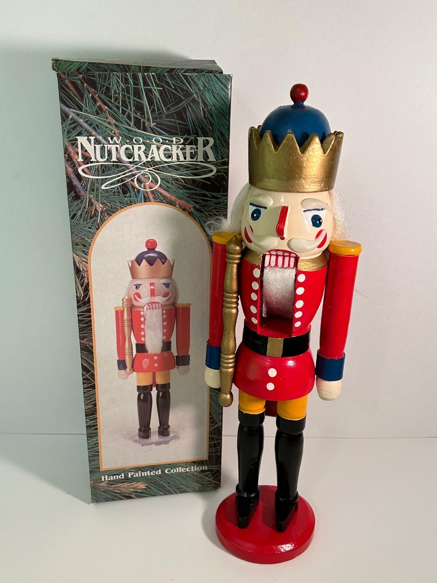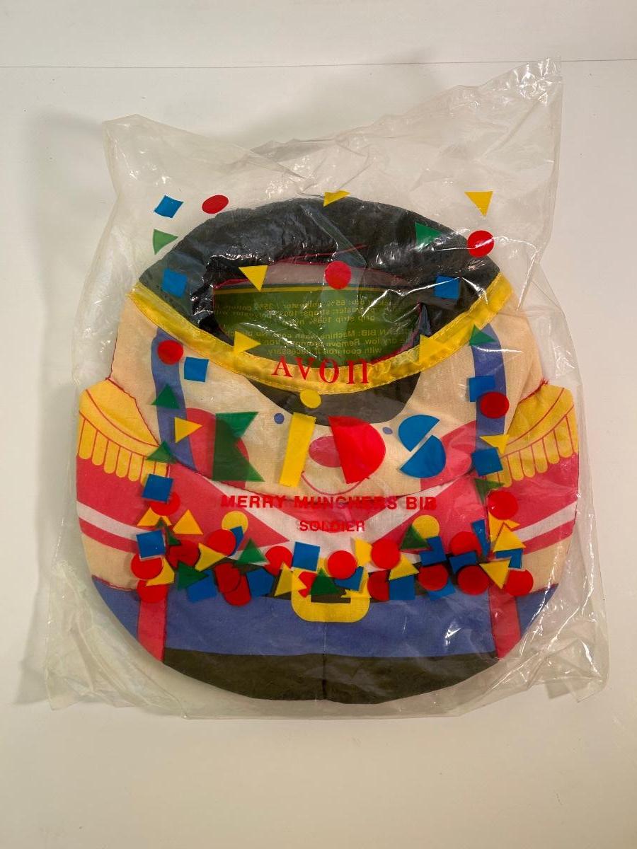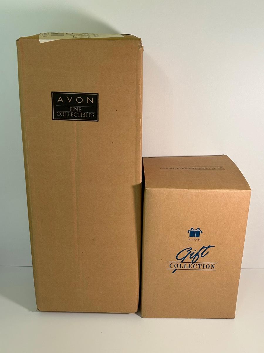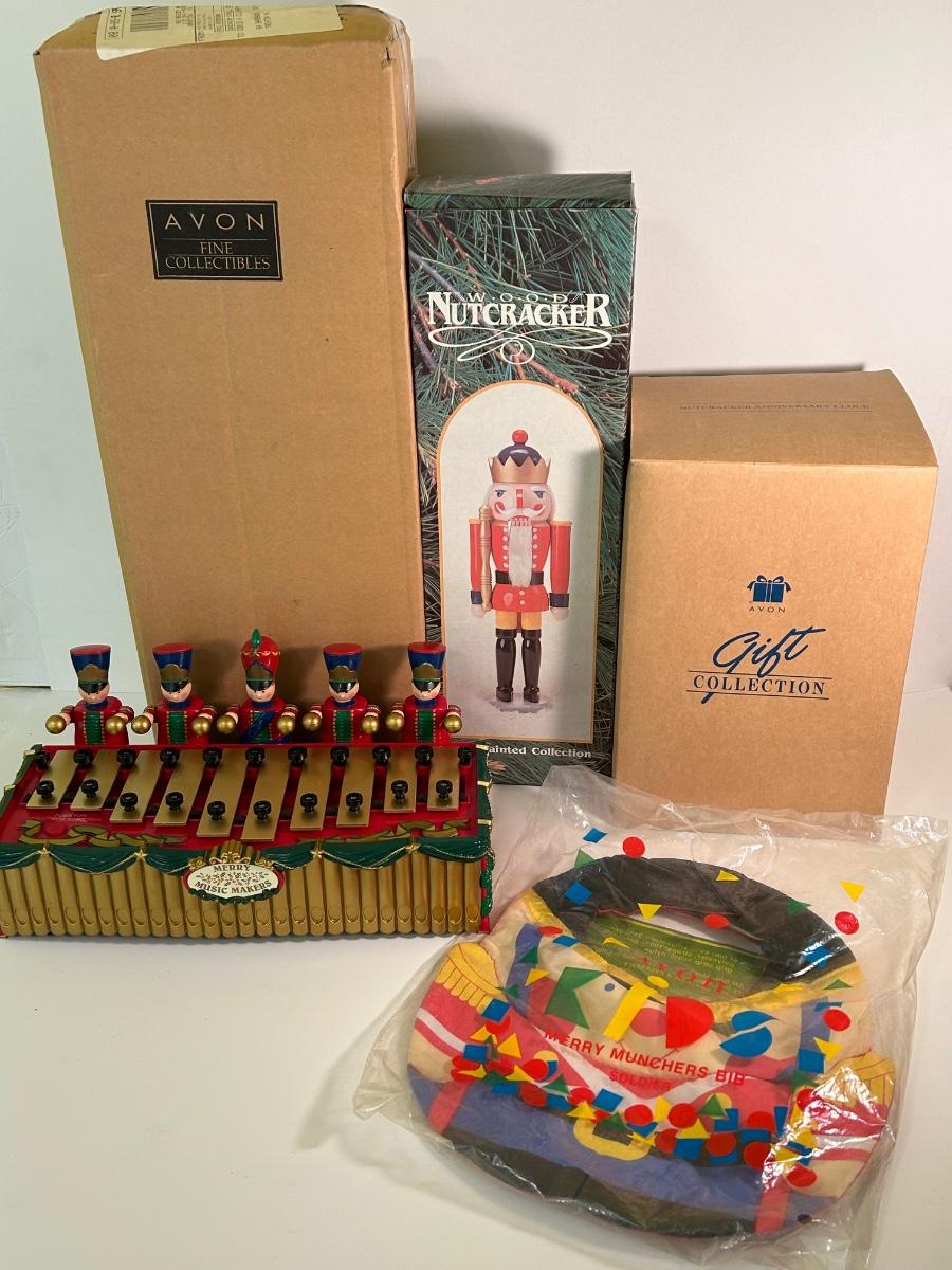 New in box Avon collectables. Nutcracker anniversary clock, Musical soldiers, Avon nutcracker baby bib and handprinted wood nutcracker.