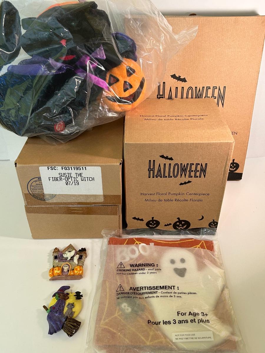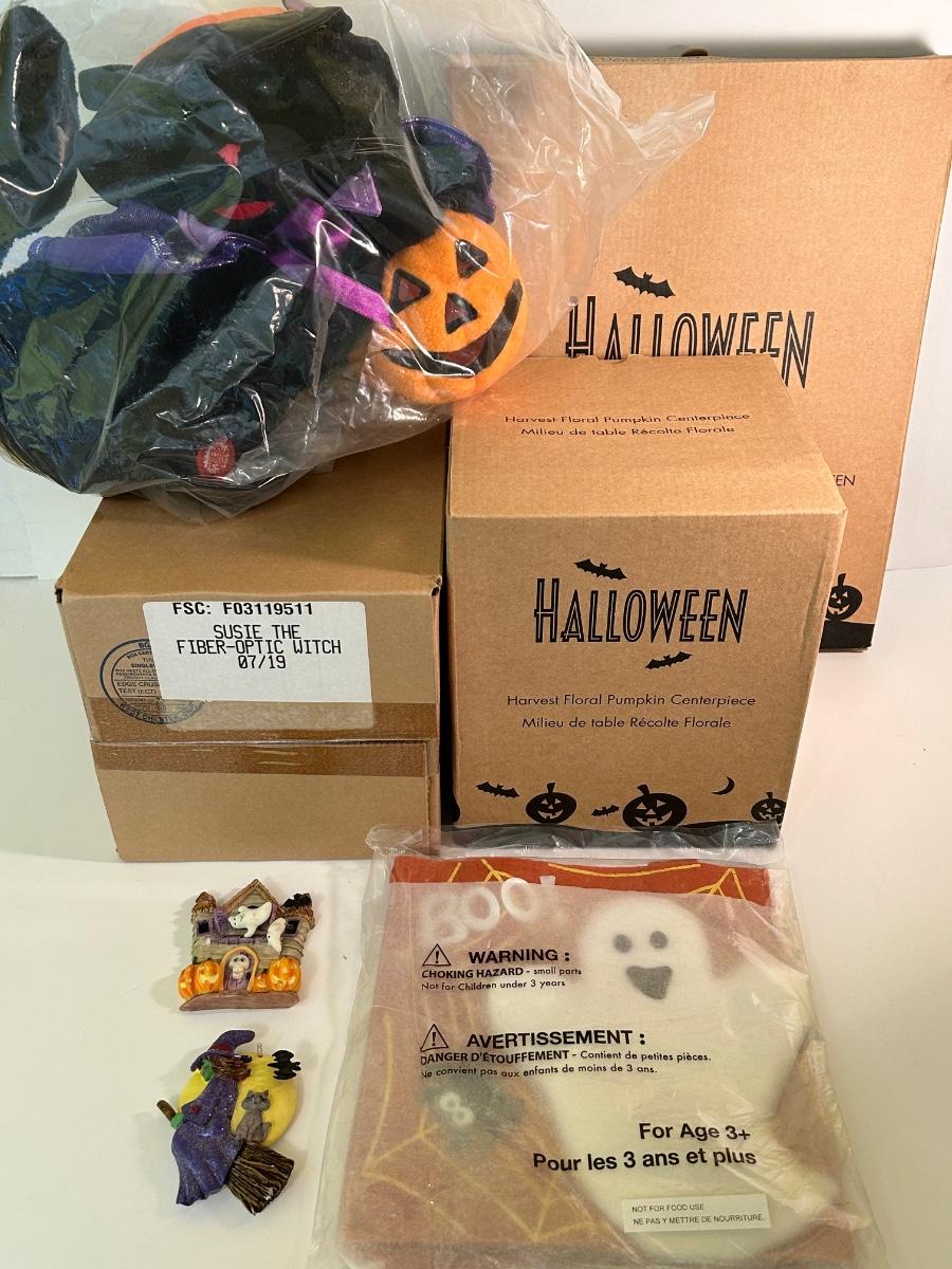 Fiber optic witch, Light up witch, harvest centerpiece, magnets, plush cat and more.