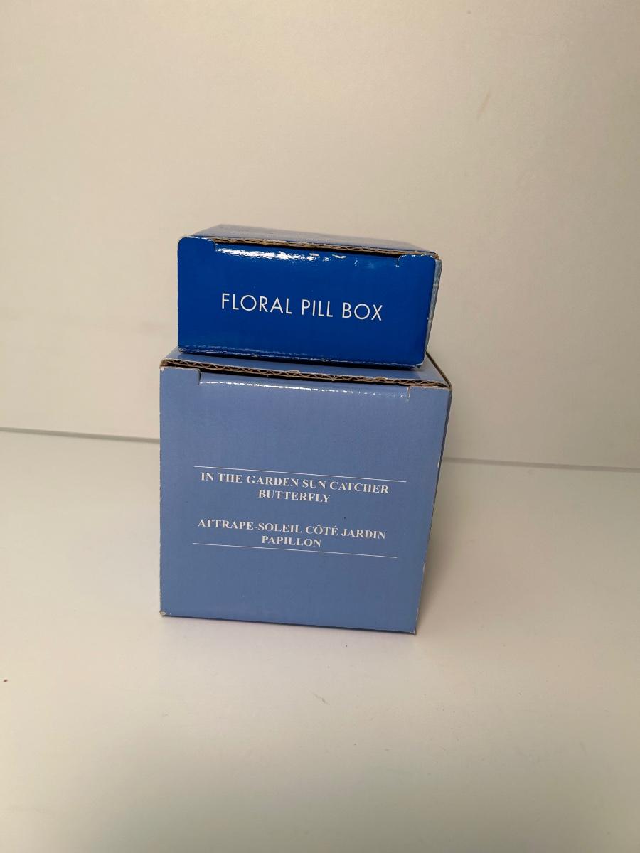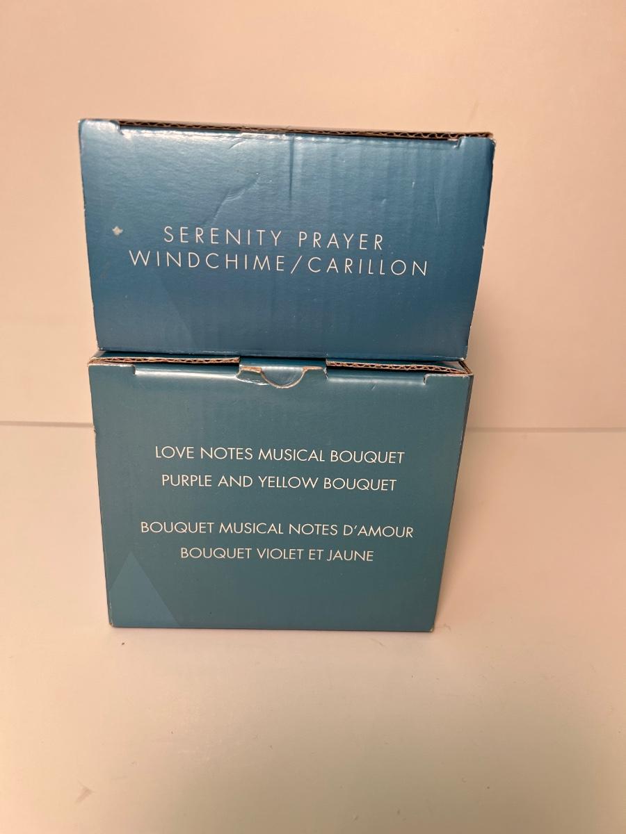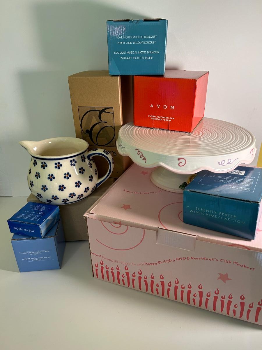 Musical bouquet, watering can, cake dish, tea pot, floral pill box, butterfly sun catcher and wind chimes.