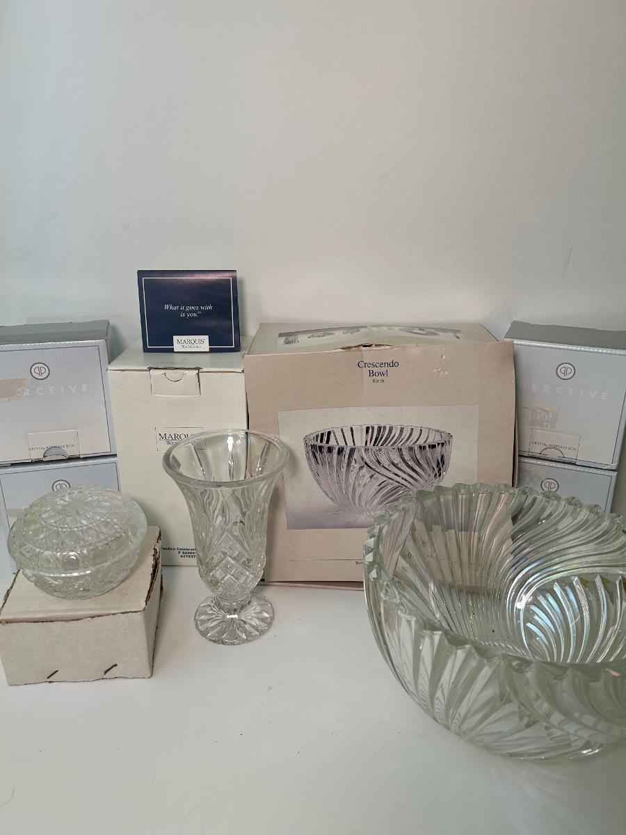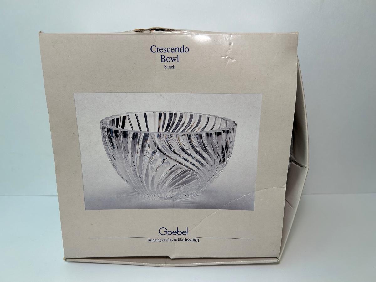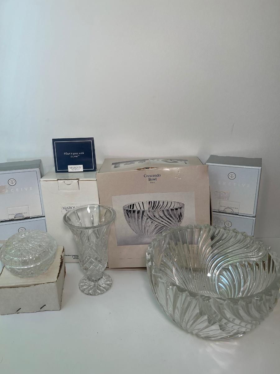 Marquis Waterford Crystal festive celebration vase, Goebel Crescendo 8 inch bowl, Perceive crystal keepsake box and more. Items include original boxes.