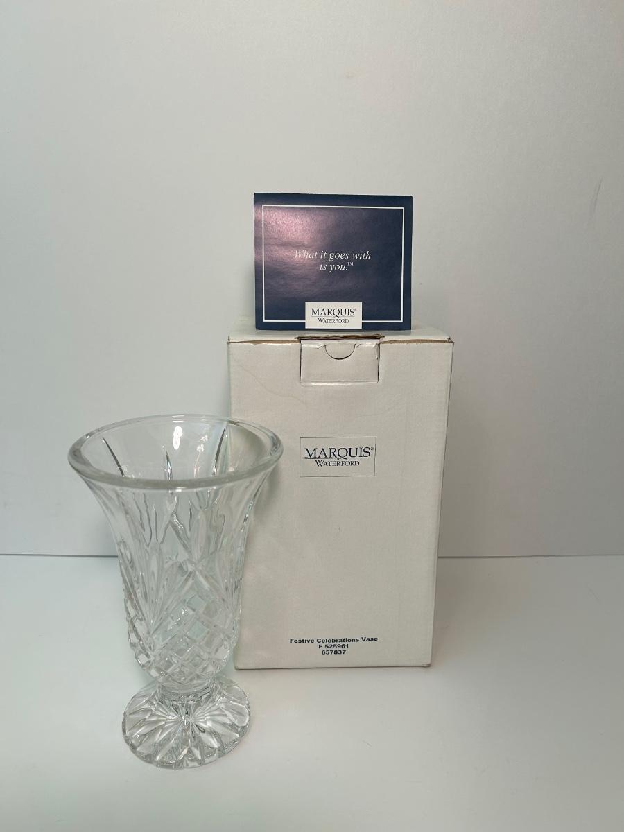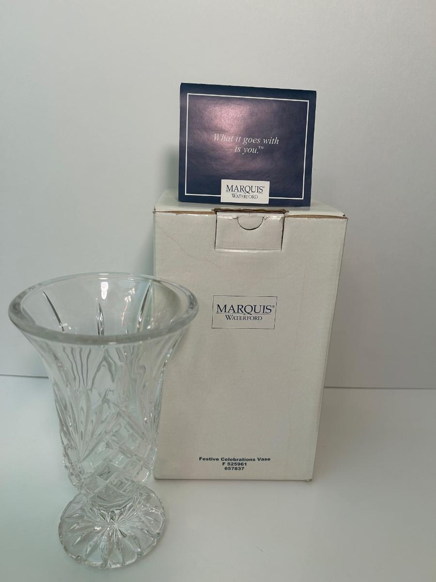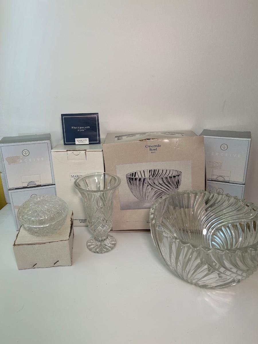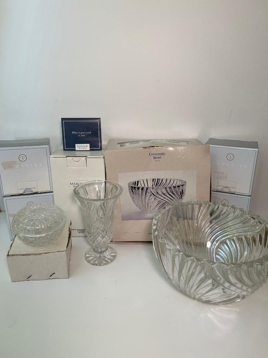 Marquis Waterford Crystal festive celebration vase, Goebel Crescendo 8 inch bowl, Perceive crystal keepsake box and more. Items include original boxes.