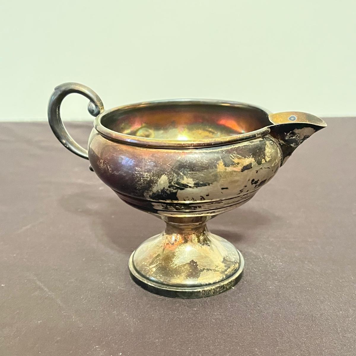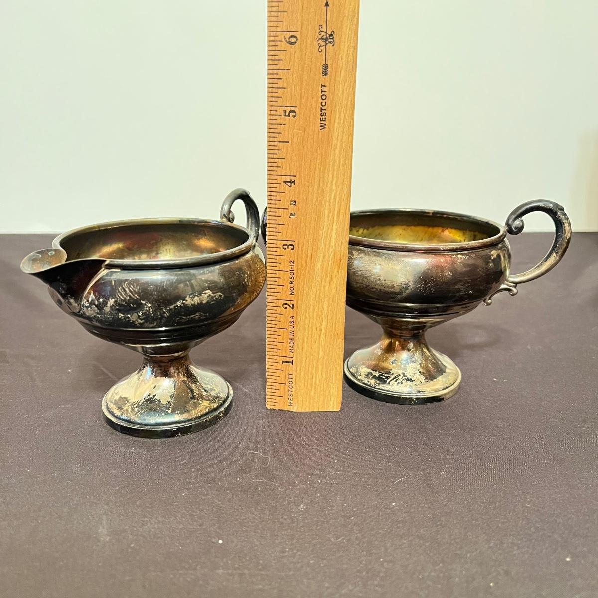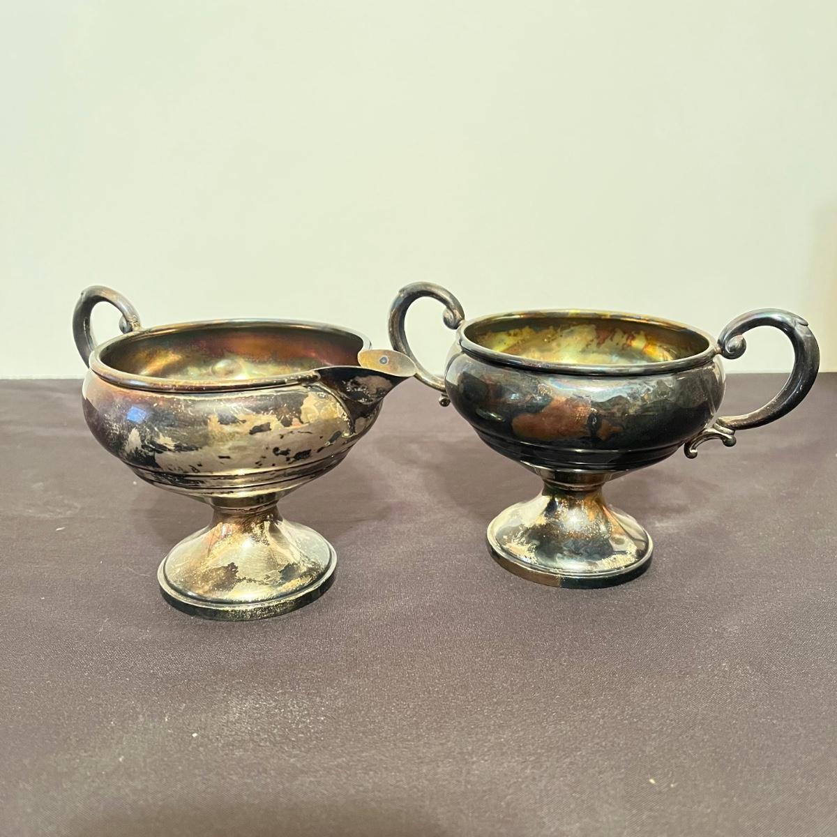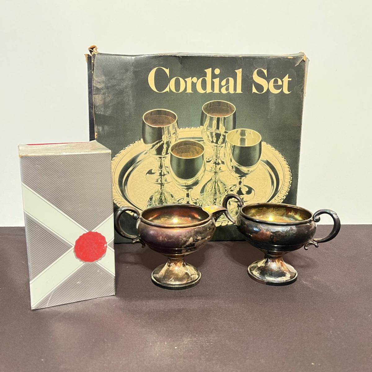 LOT 161D: Weighted Sterling Silver Cream & Sugar Set + Silver Plated Cordial Set and Dinner Bell