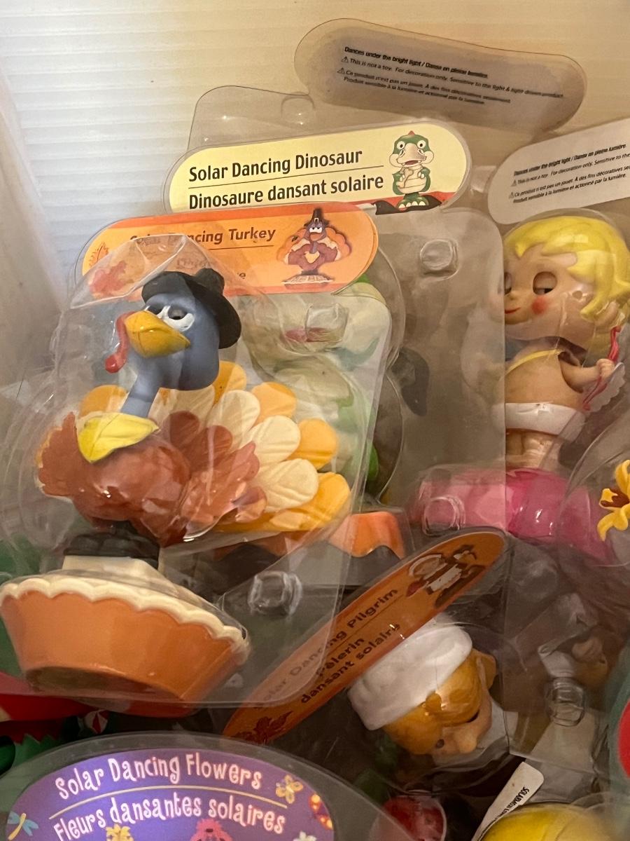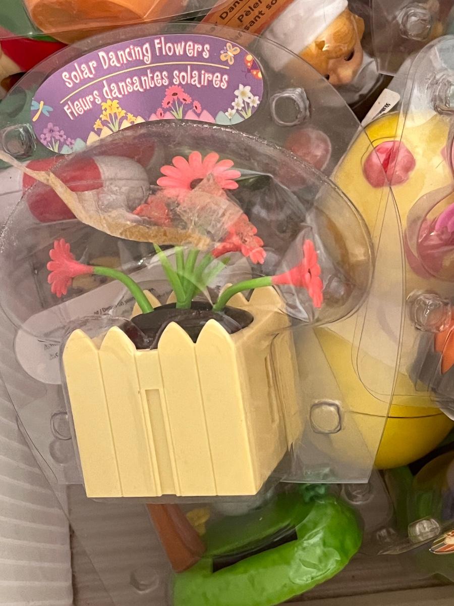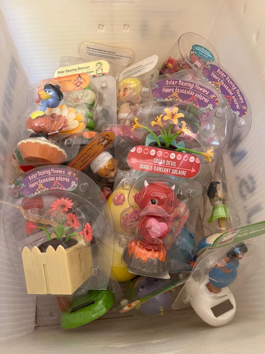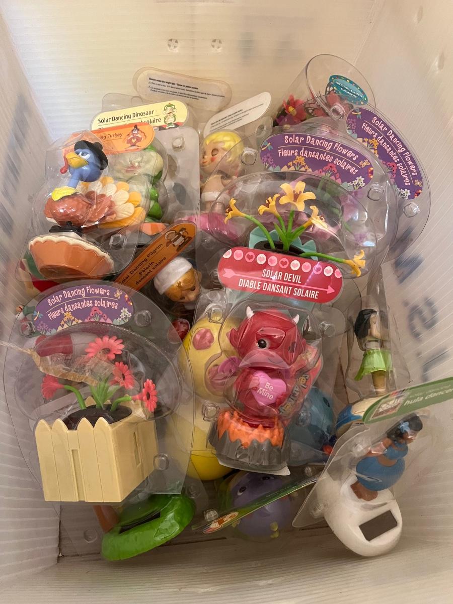 LOT 194D: Bin Full of Solar Dancer Novelty Toys - Hula Dancers, Flowers, Butterflies, More