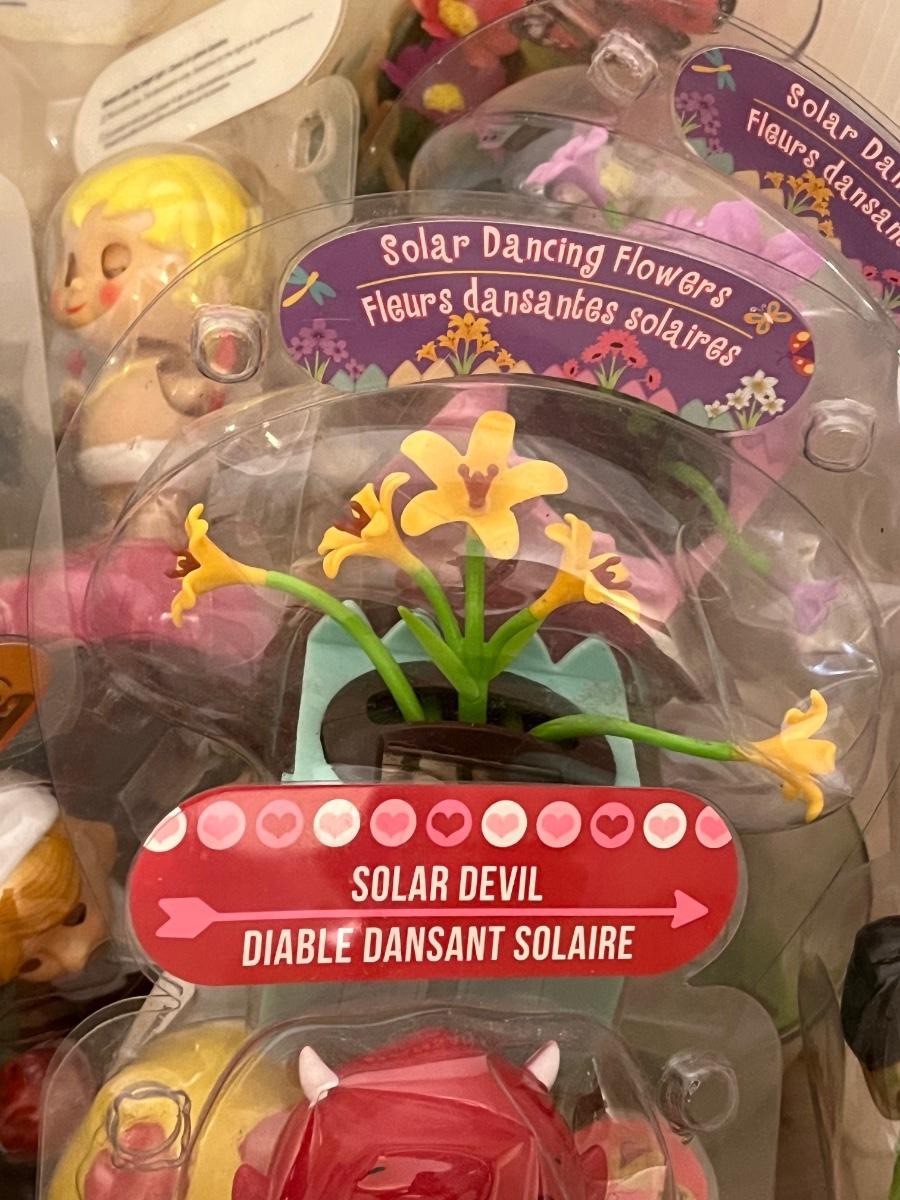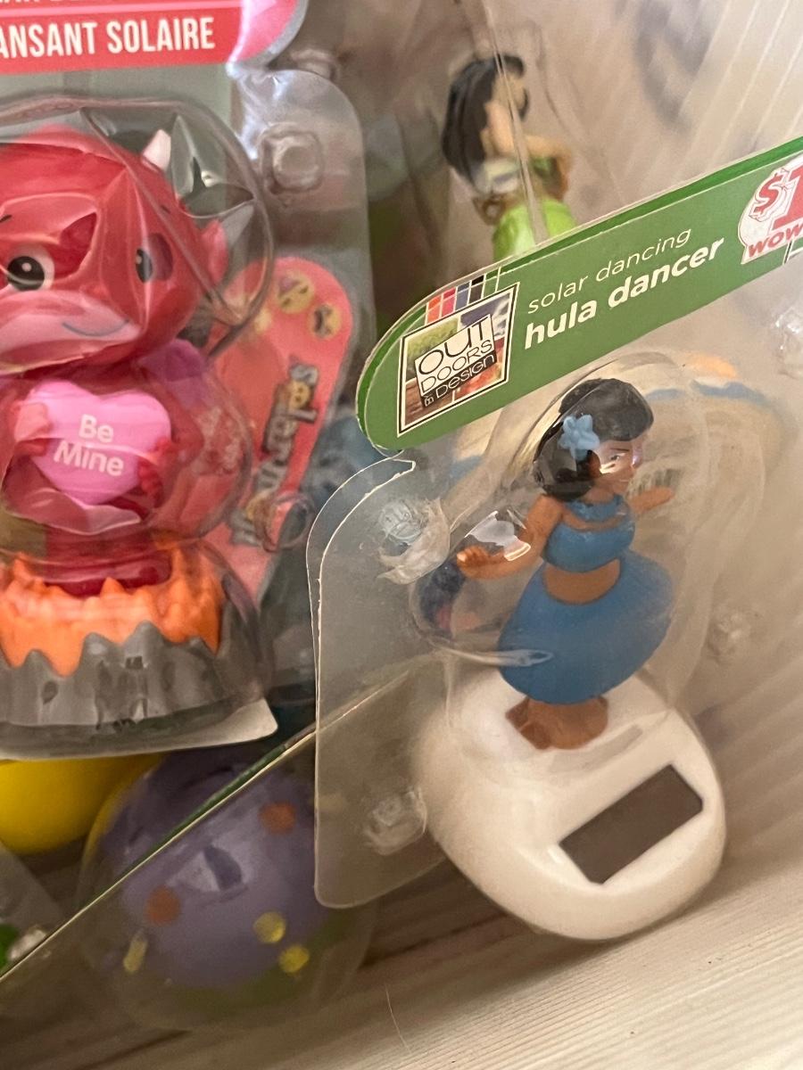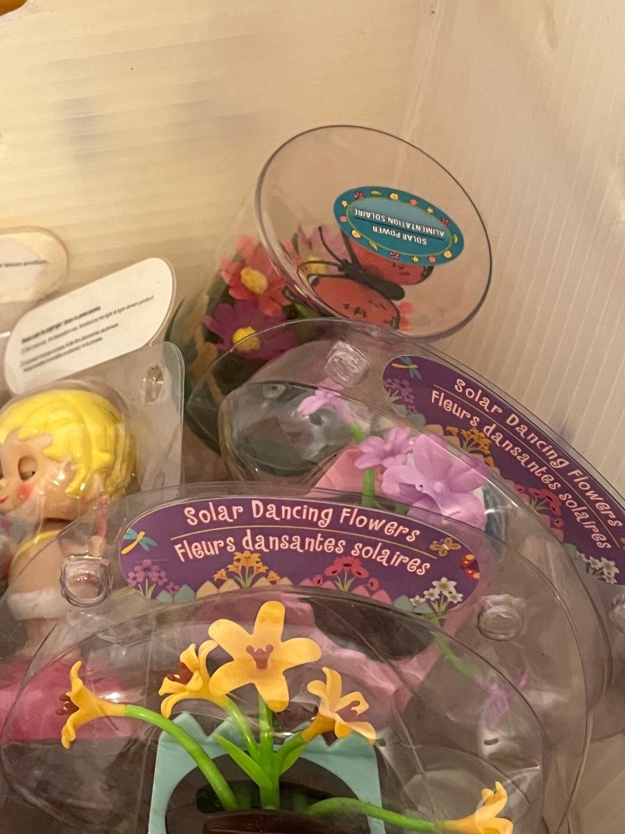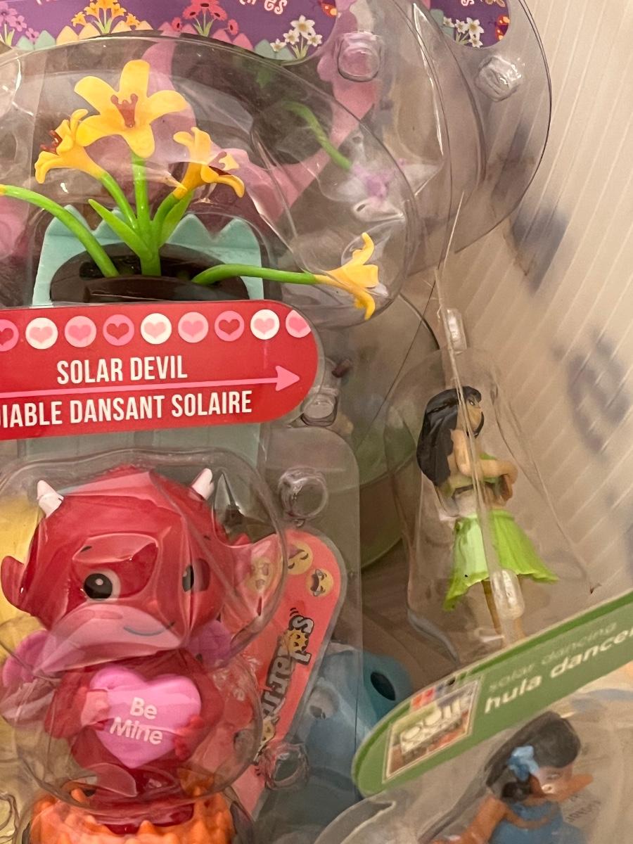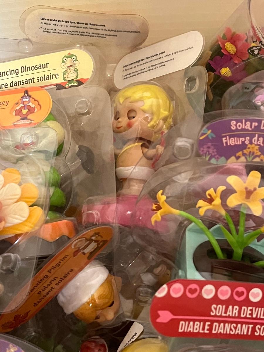 LOT 194D: Bin Full of Solar Dancer Novelty Toys - Hula Dancers, Flowers, Butterflies, More
