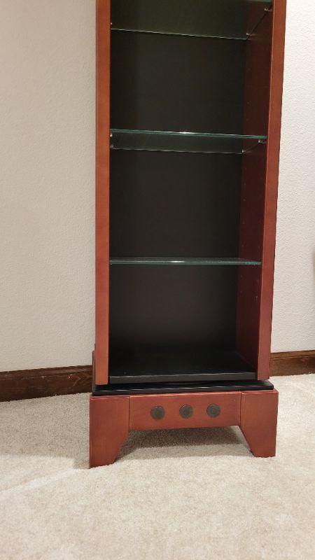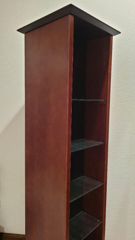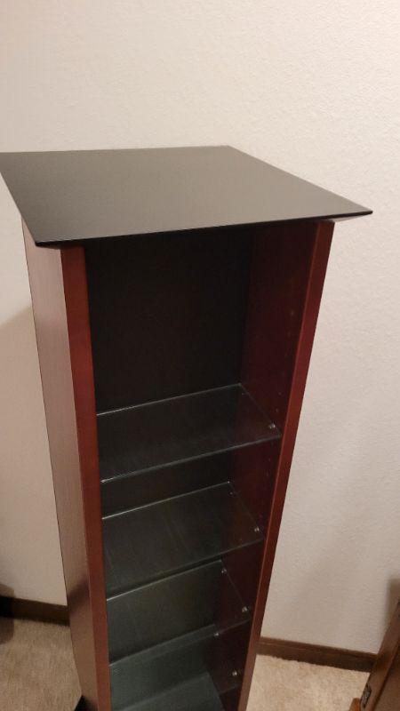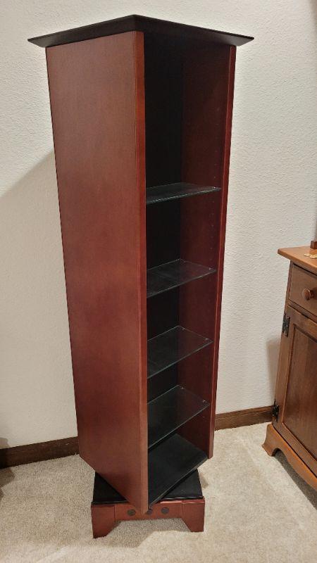 Lot 966: Vintage Swivel Base w/ Glass Shelves 2-Sided Media Organizer Tower 53.5" x 14.5"