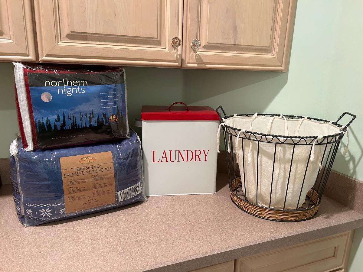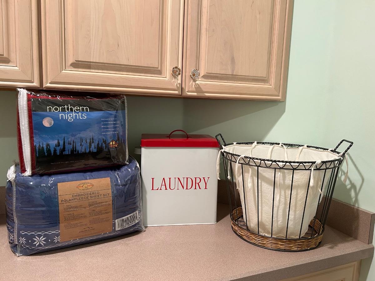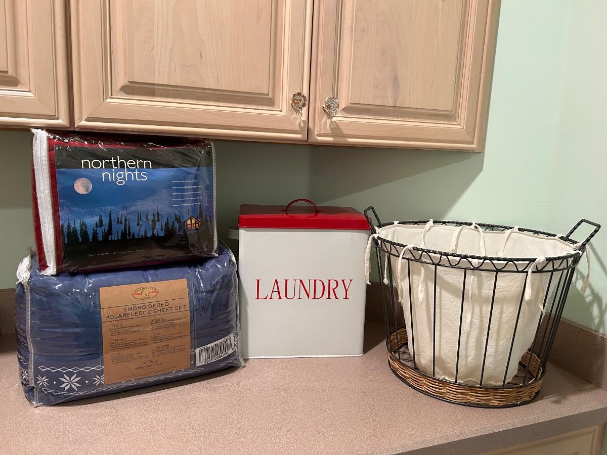 Two sets of queen size flannel sheets. Laundry tin with lid and small laundry basket.