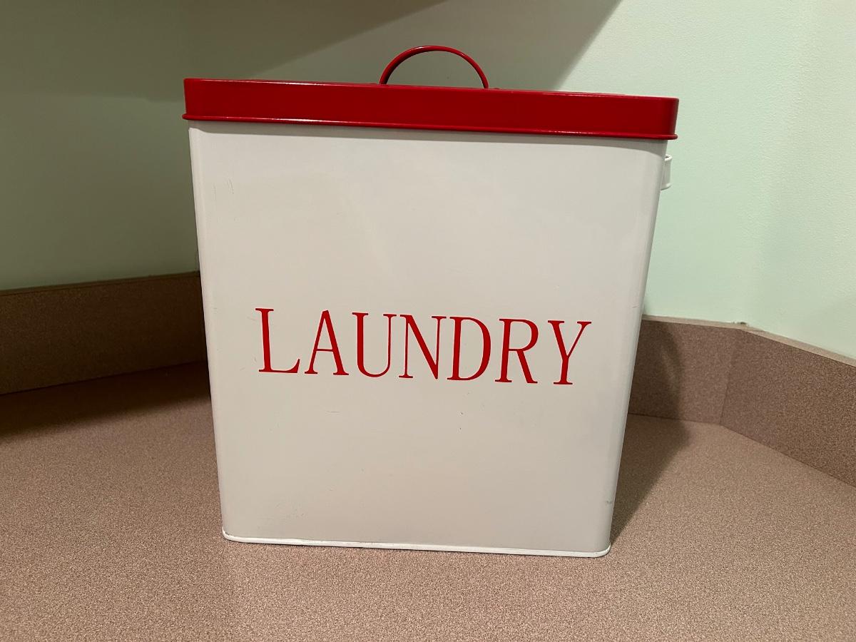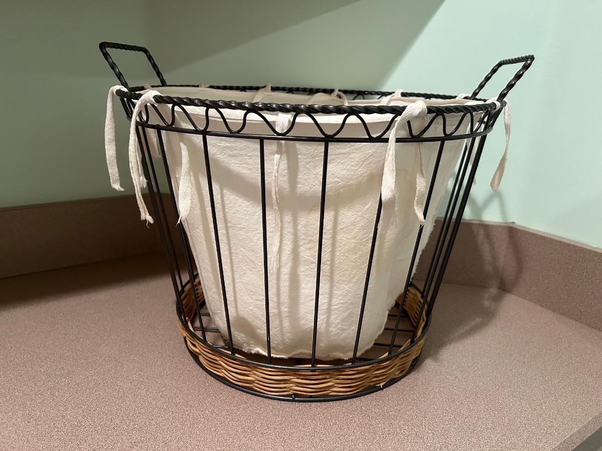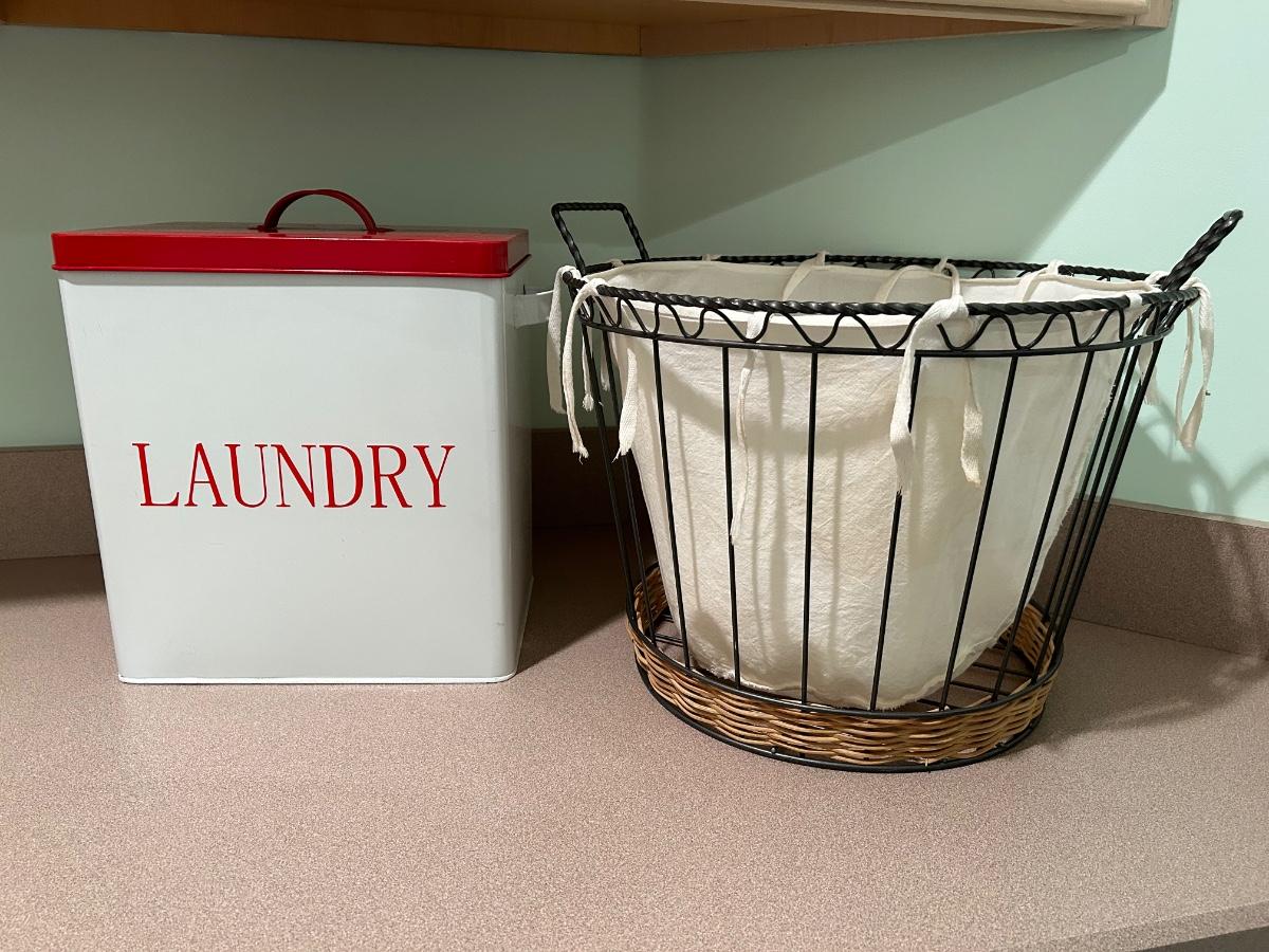 Two sets of queen size flannel sheets. Laundry tin with lid and small laundry basket.