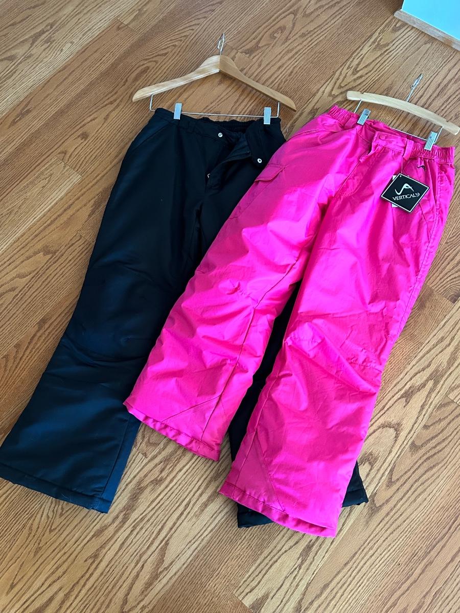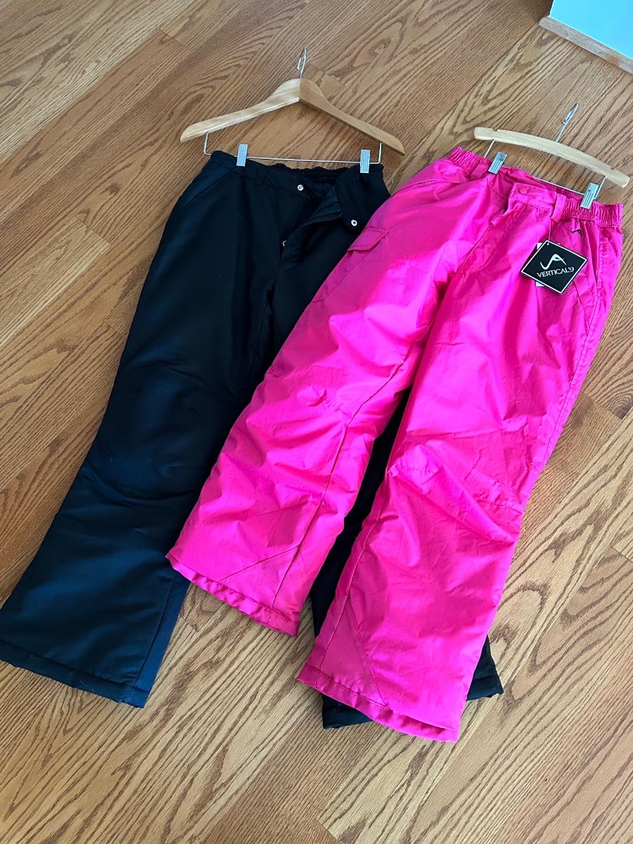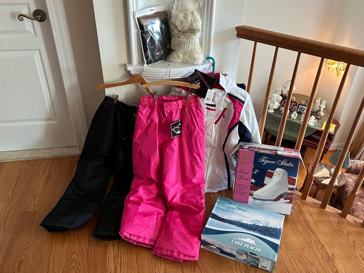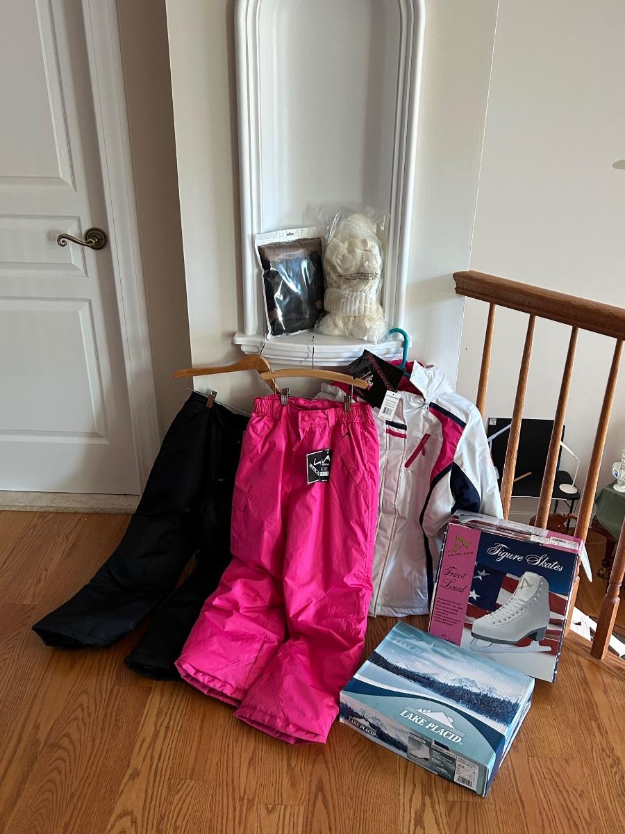 Girls size 14/16 Weatherproof coat, Two pair of snow pants girls large, Aspen Girls Ice Skates size 1, American figure skates size 8. New in package hats and gloves.