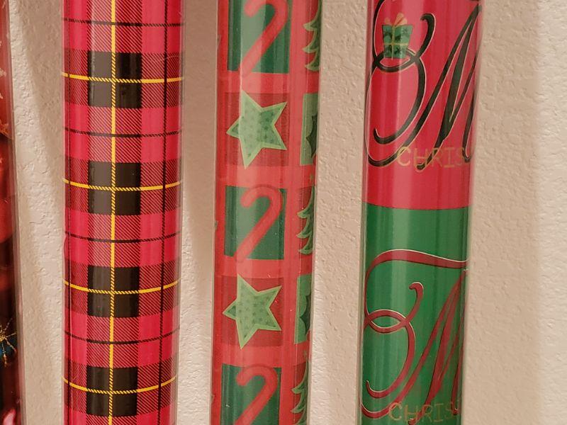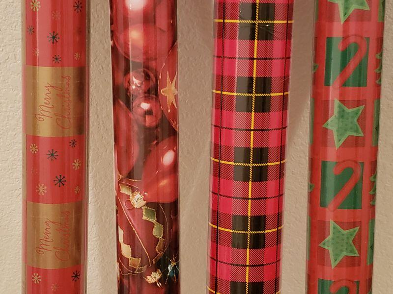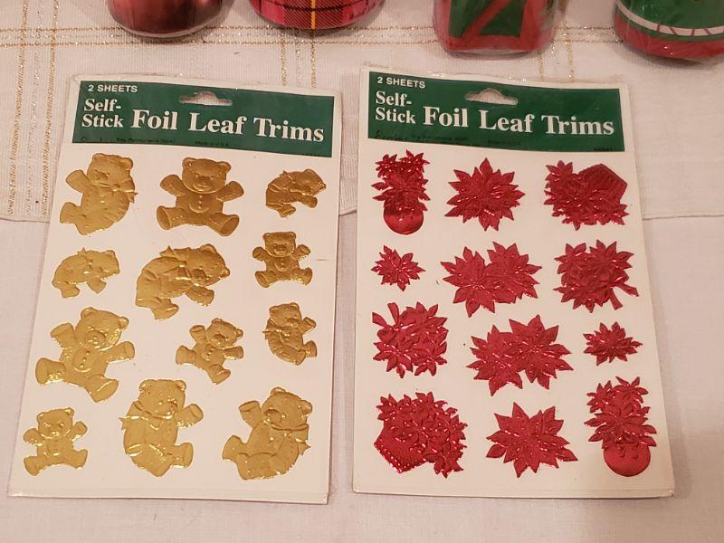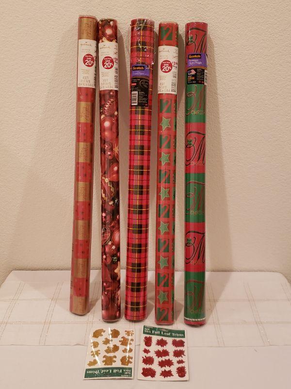 Lot 969: NEW (5) Rolls of Wrapping Paper (reds, greens and gold) and Stickers