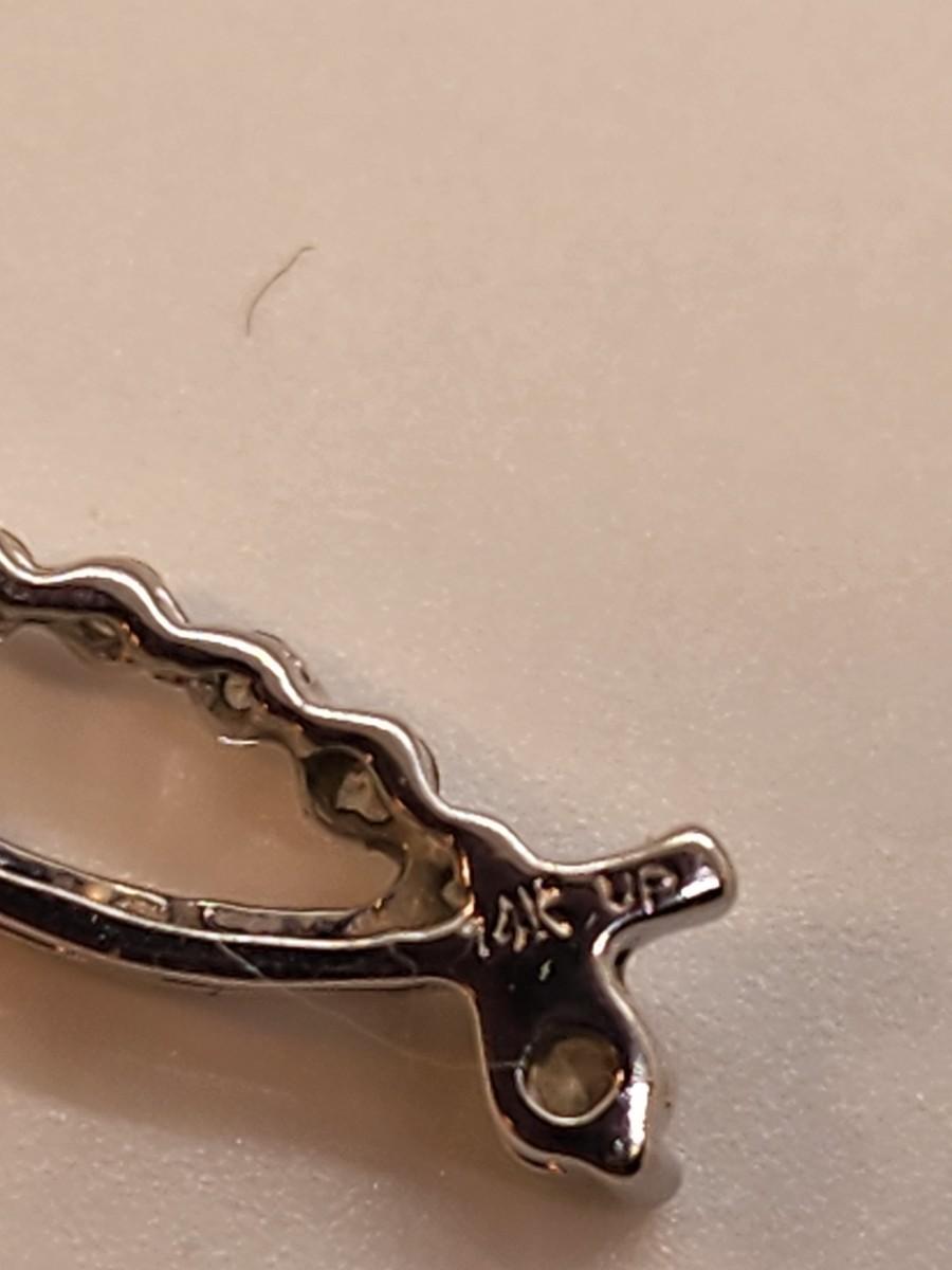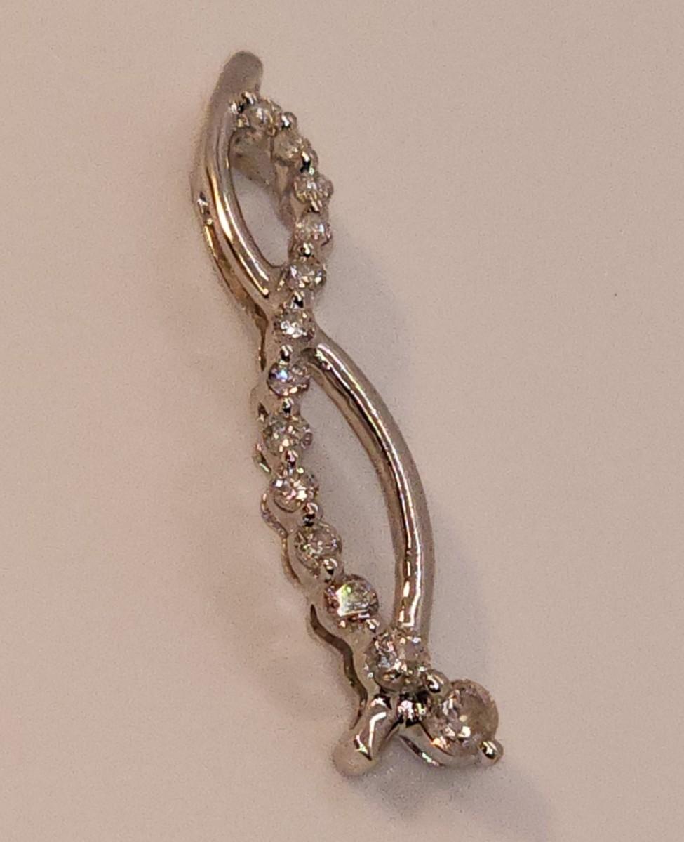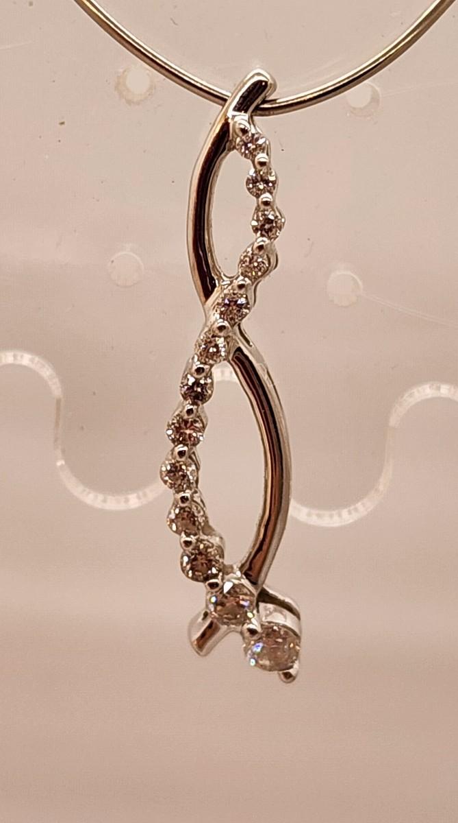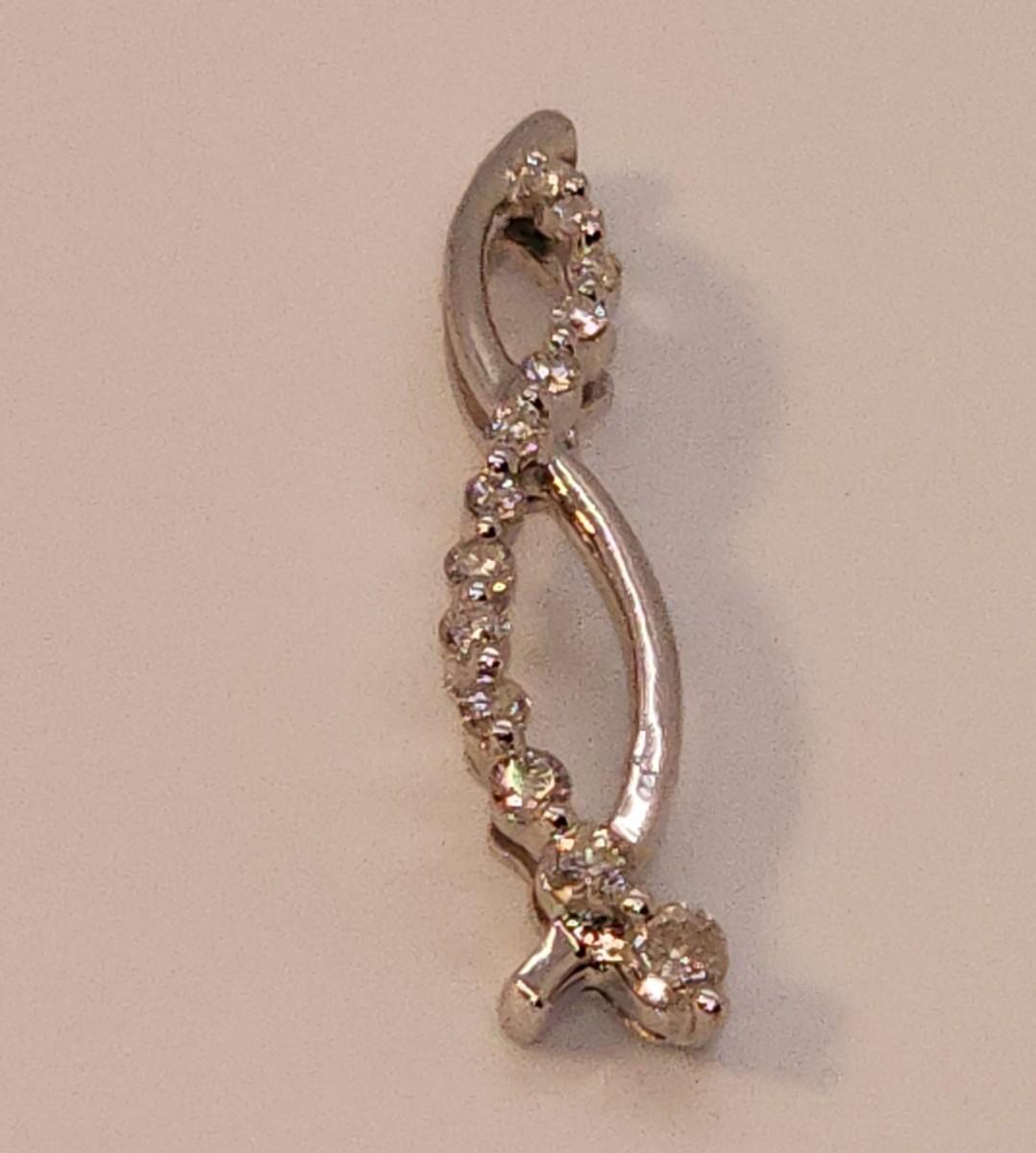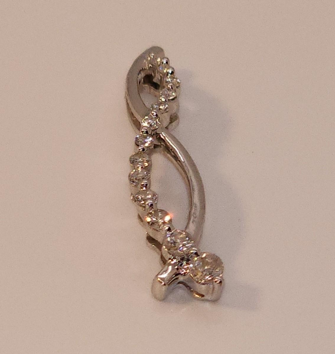 LOT 8:: 1.3g 14k White Gold Diamond Infinety Pendant marked 14k UP has 13 graduated size diamond chipst