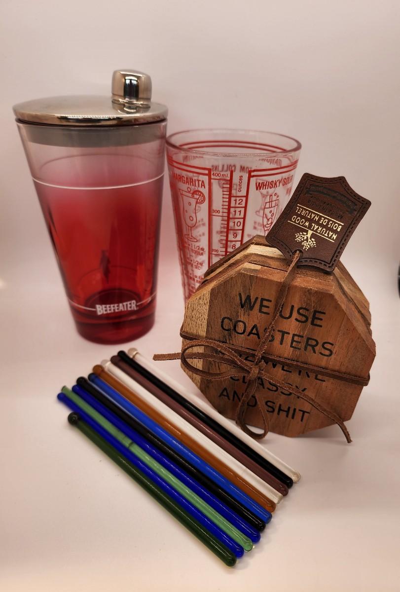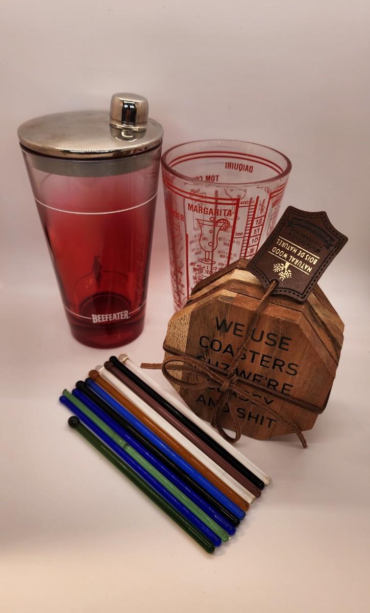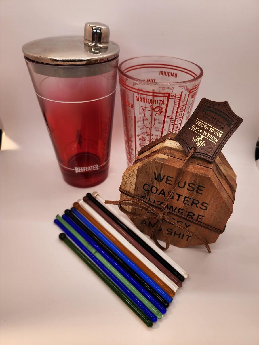 LOT 15:: Bar LOT featuring glass swizzle sticks, vintage shakers and fun coasters