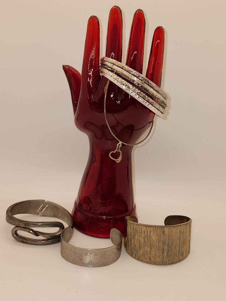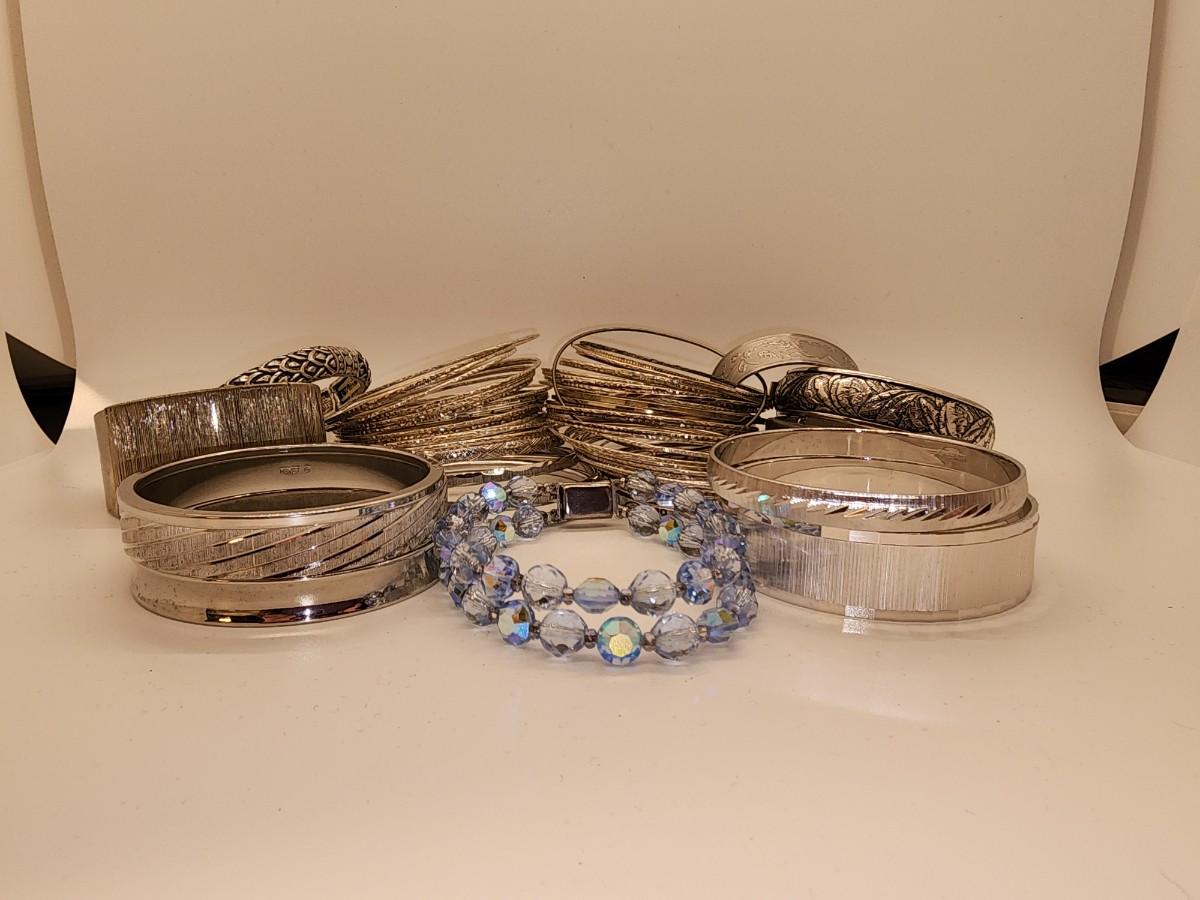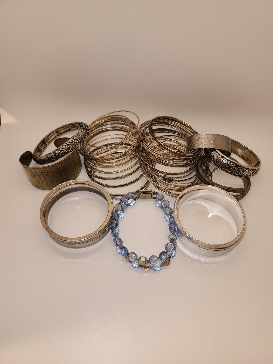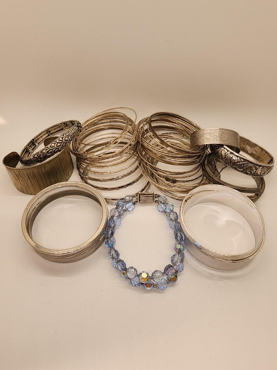 Six Monet bangle bracelets and more Silverton. Bracelet lot featuring a vintage double strand Aurora borealis crystal bracelet with a rhinestone clad clasp. Please see all pictures as they are the best representation of the items. The pictures show condition, measurements if taken, and what is included in the lot. Due to the large amount that we photograph and the time frame, we are not always able to take measurements. All items unless noted, are pre-owned and have been used. If you purchased furniture, you must bring help. We do not allow one person to carry large furniture out on their own. Bring help, tools and a truck for the safety of our client’s homes, and your personal safety. Any damages that result to the property including walls, and floors due to moving of the furniture will be charged to the buyer. Company policy. Thank you.