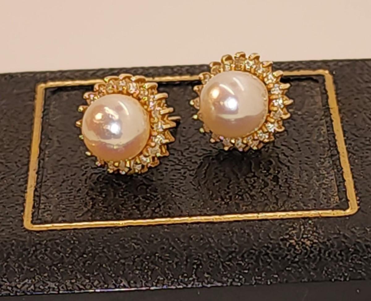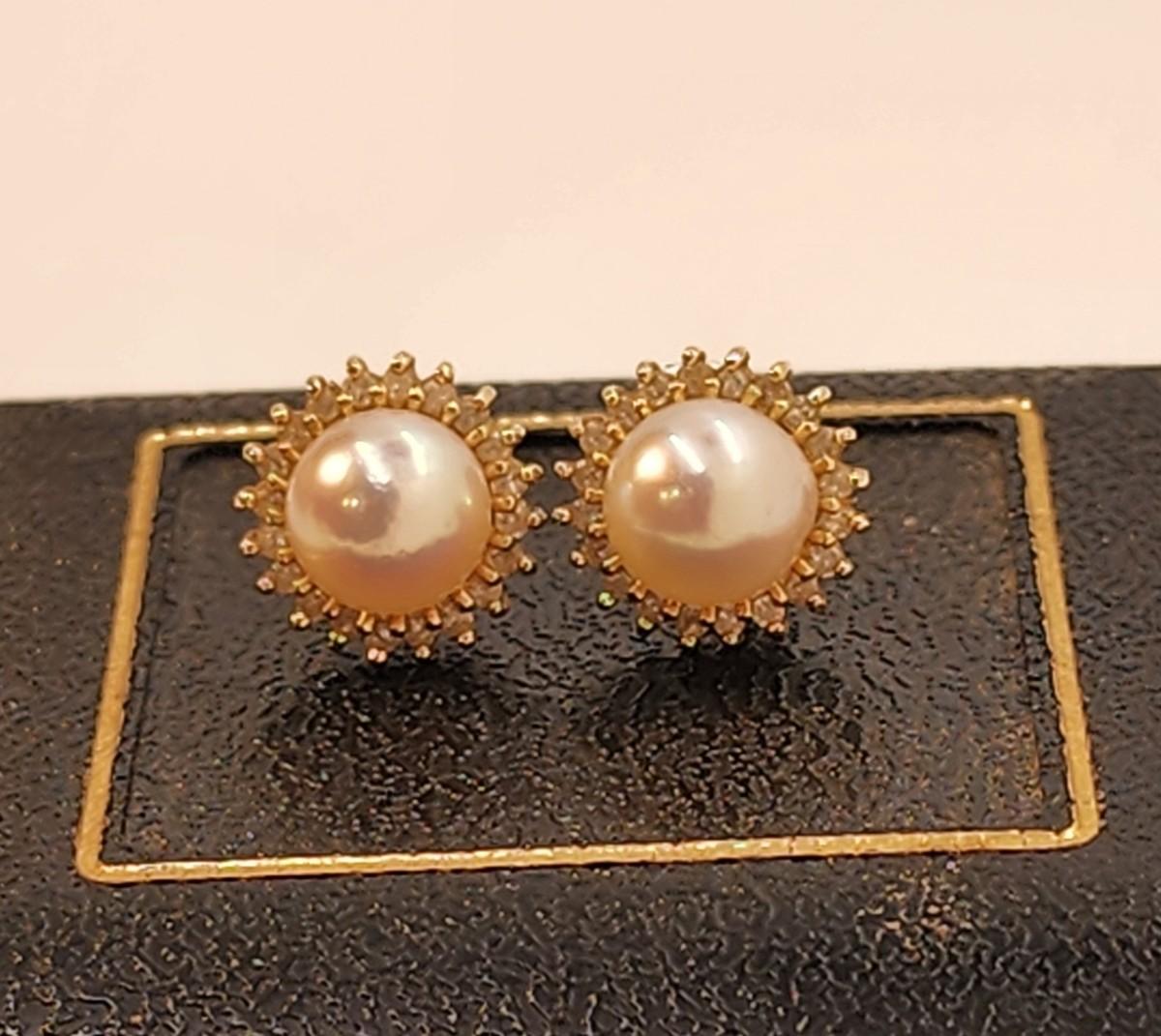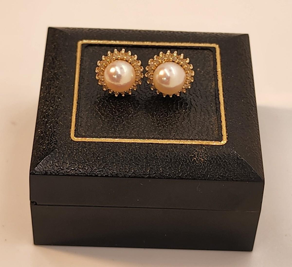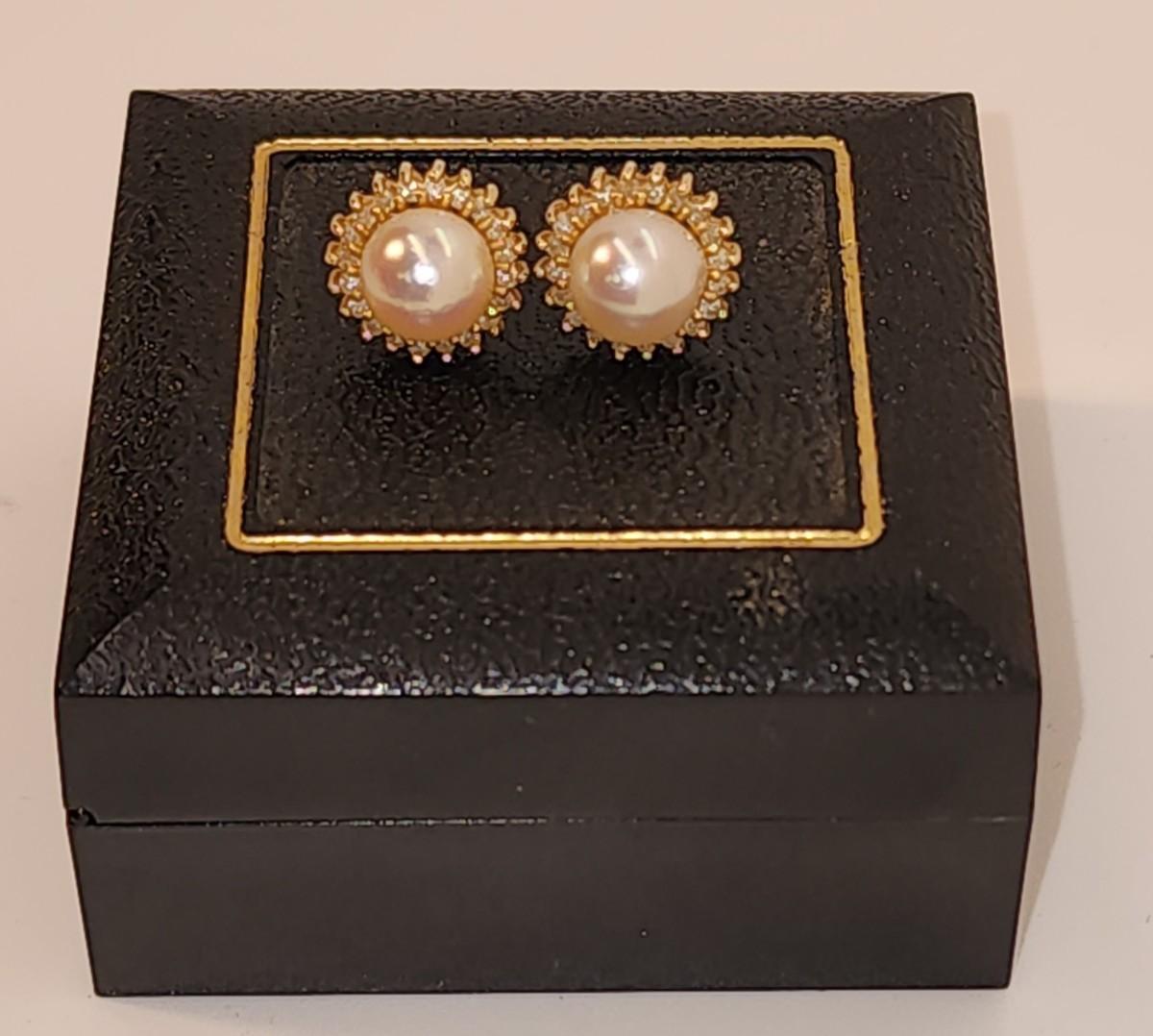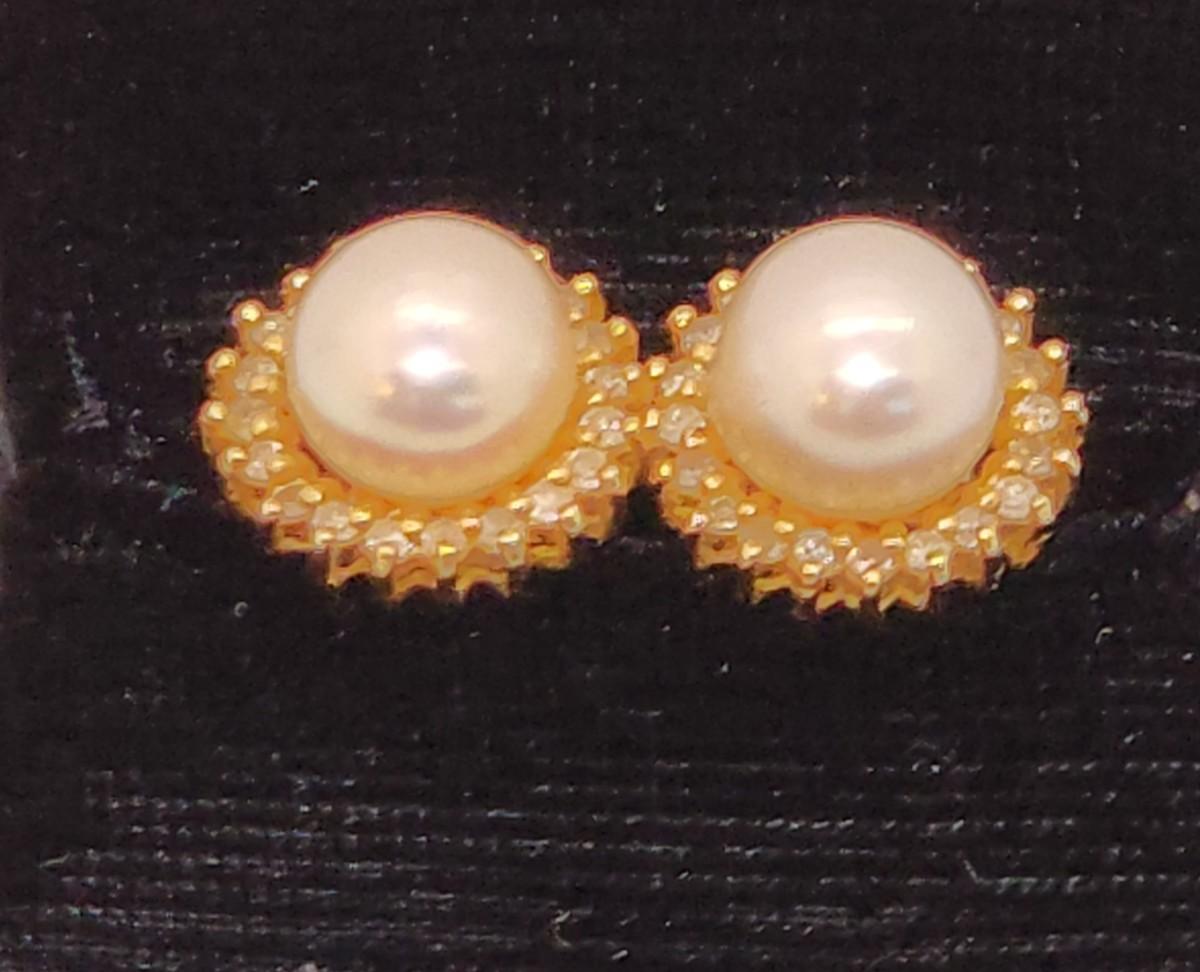 LOT 18:: Gorgeous Cultured Pearl Earrings with a diamond halo set in 14k Yellow gold