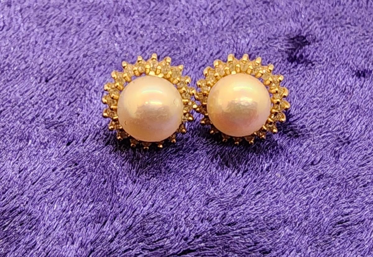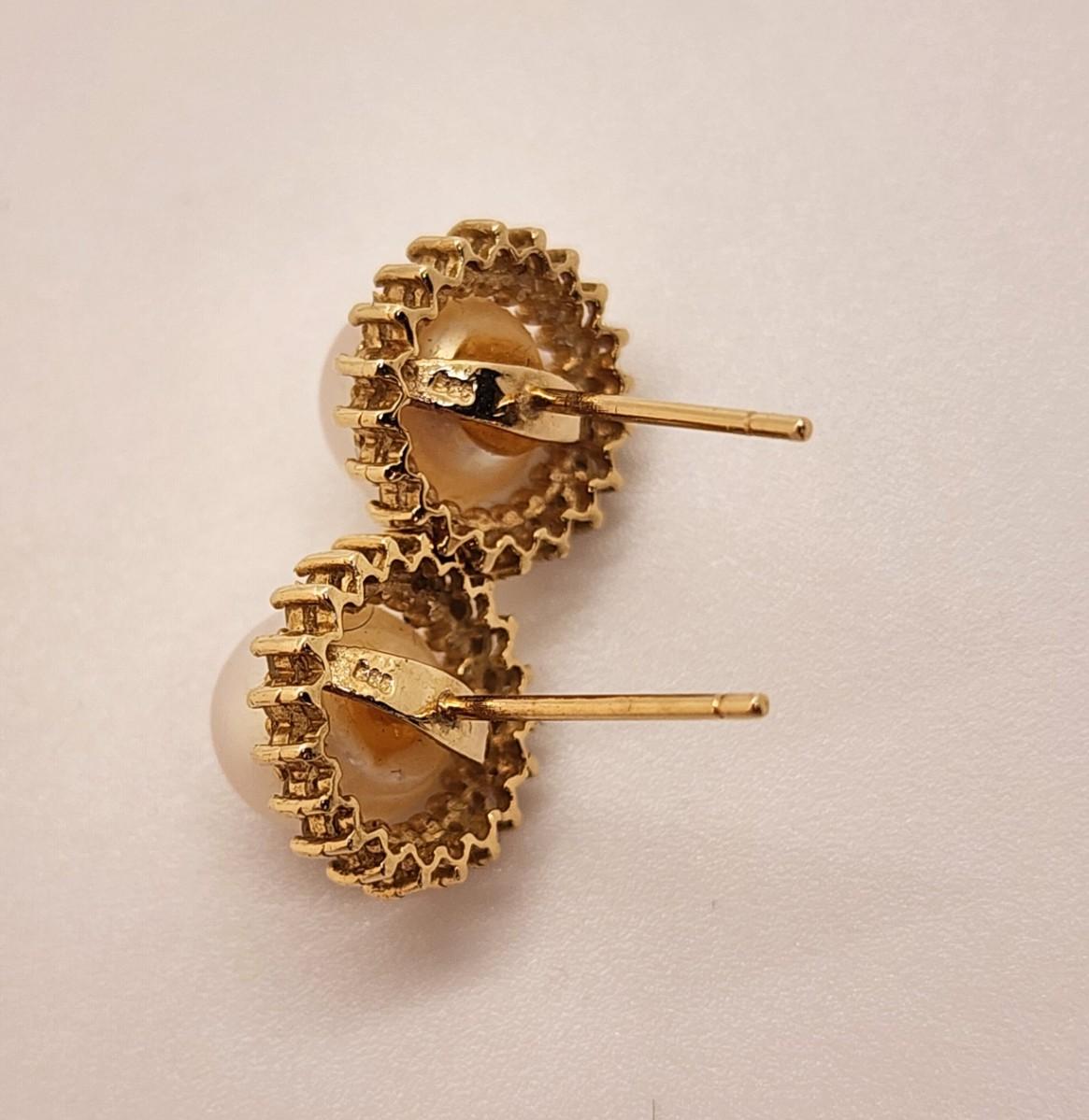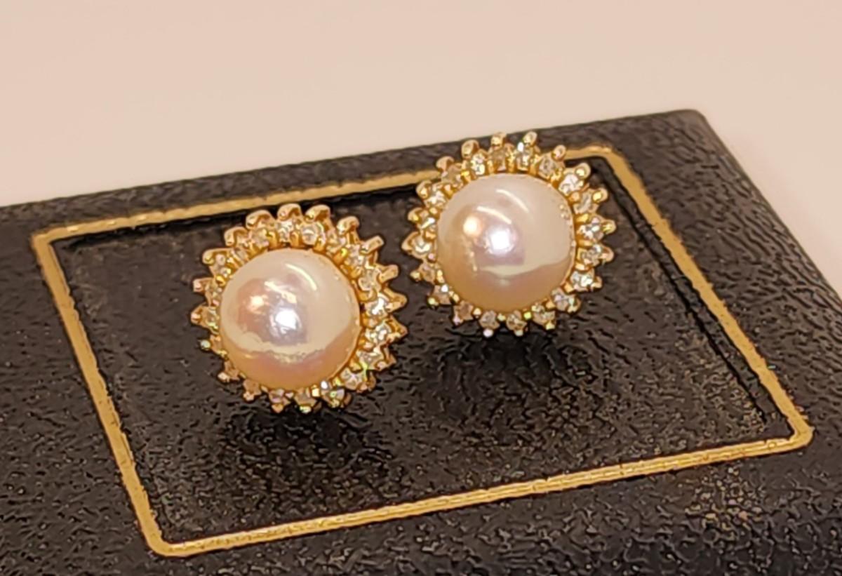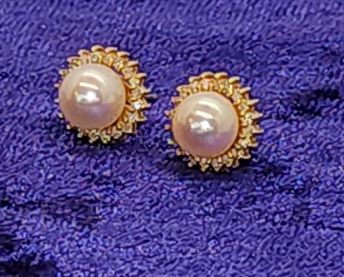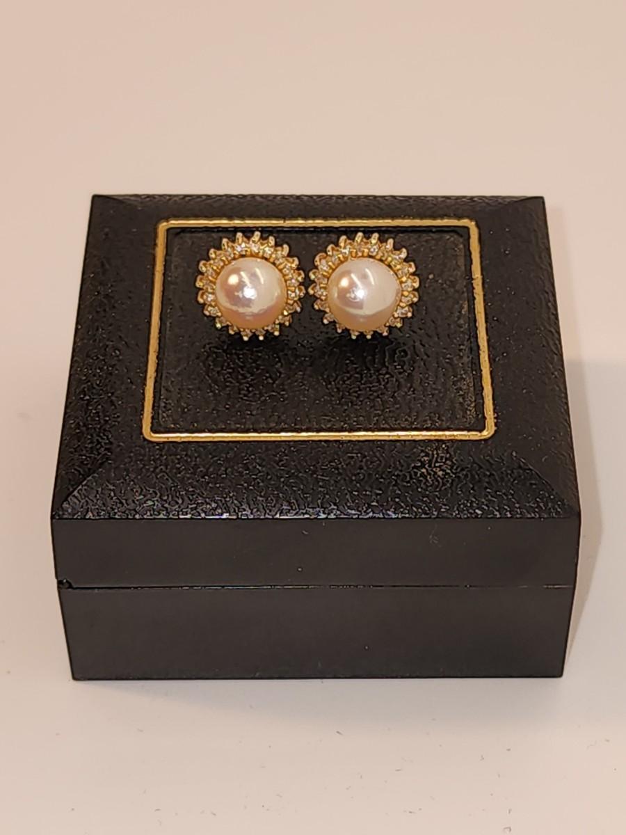 LOT 18:: Gorgeous Cultured Pearl Earrings with a diamond halo set in 14k Yellow gold